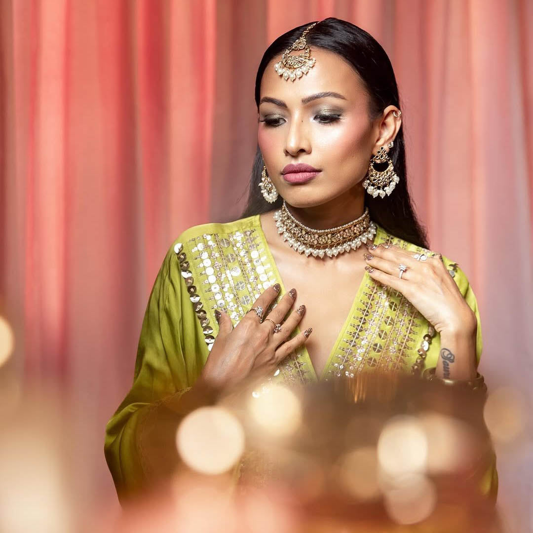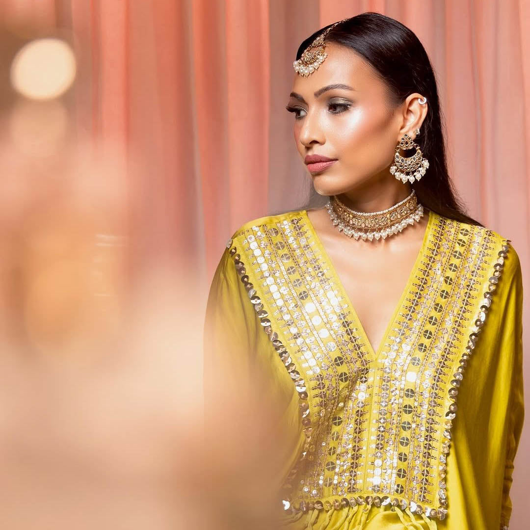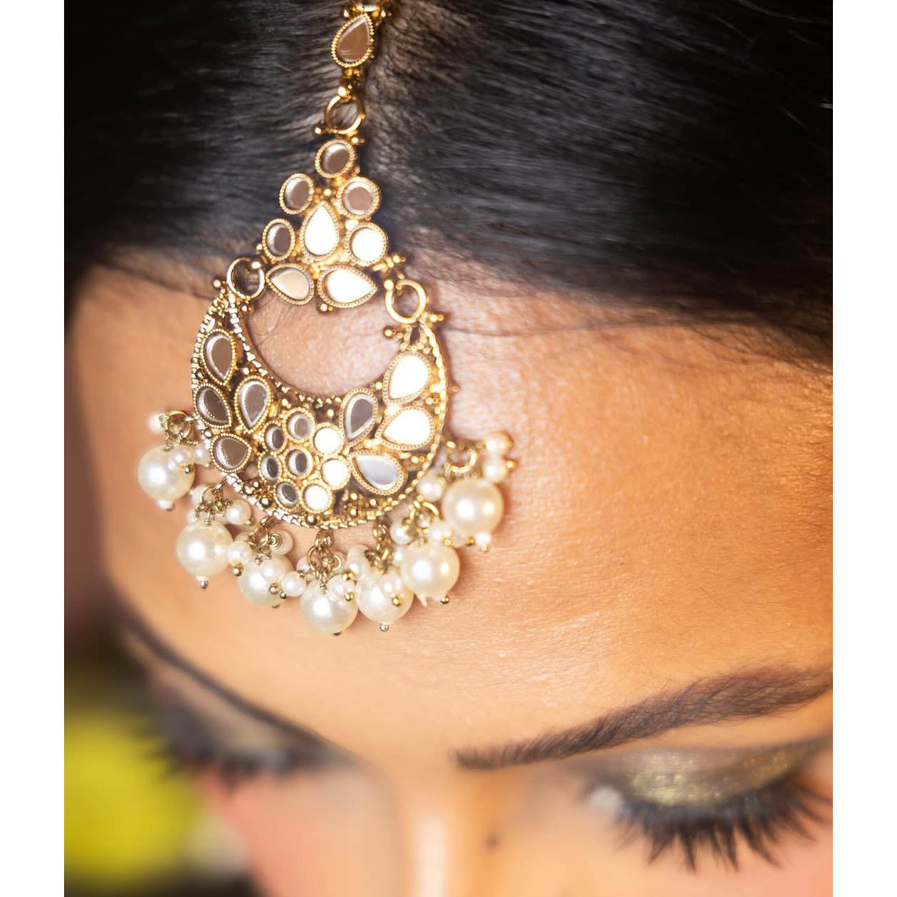 The look includes a necklace, a matching maang teekah and a pair of beautiful earrings.