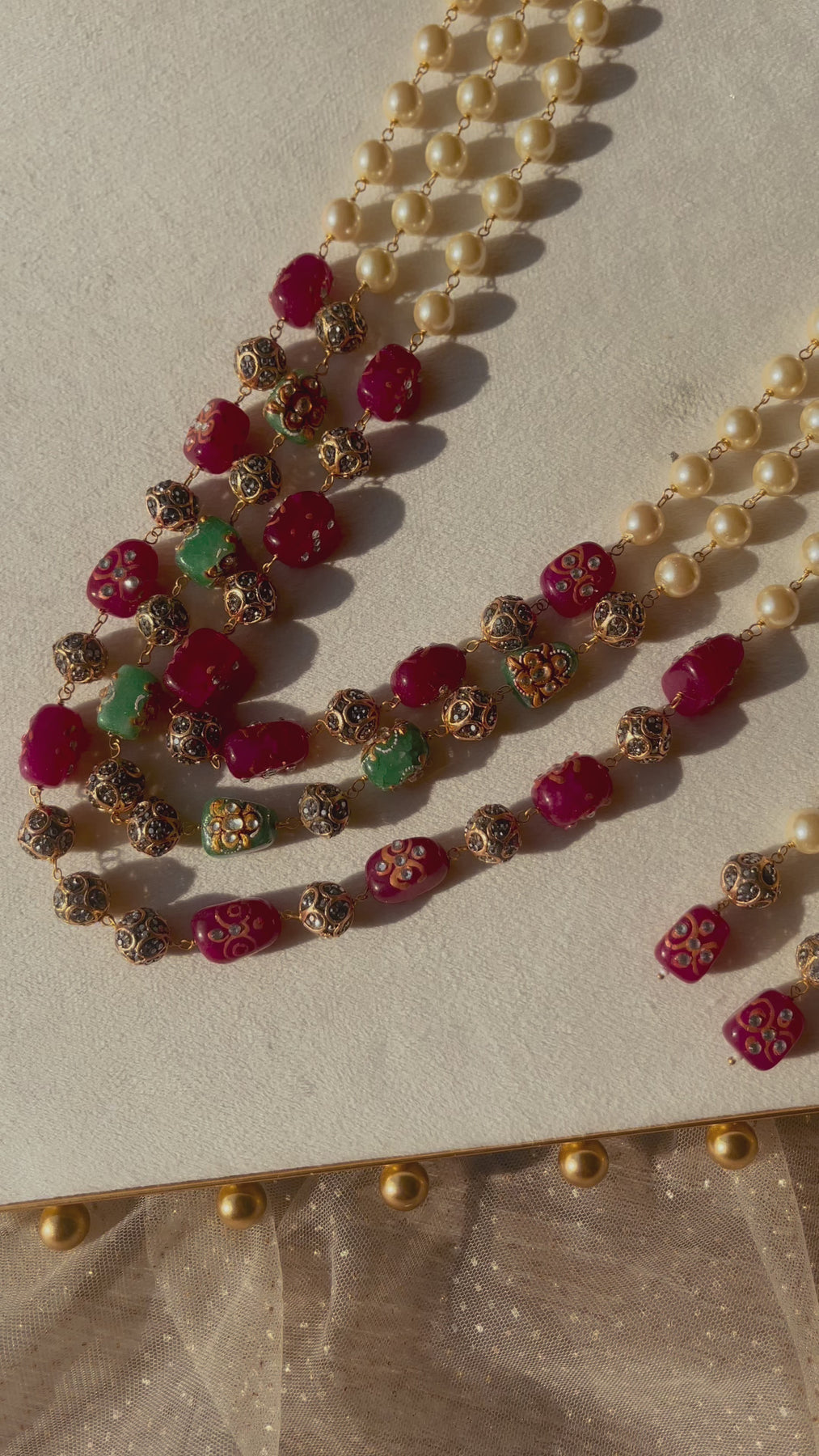 Stylish mala crafted out of 3 layers of multicolored beads and further decorated with rajasthani tanjore artwork. Approximate mala length is 12".
