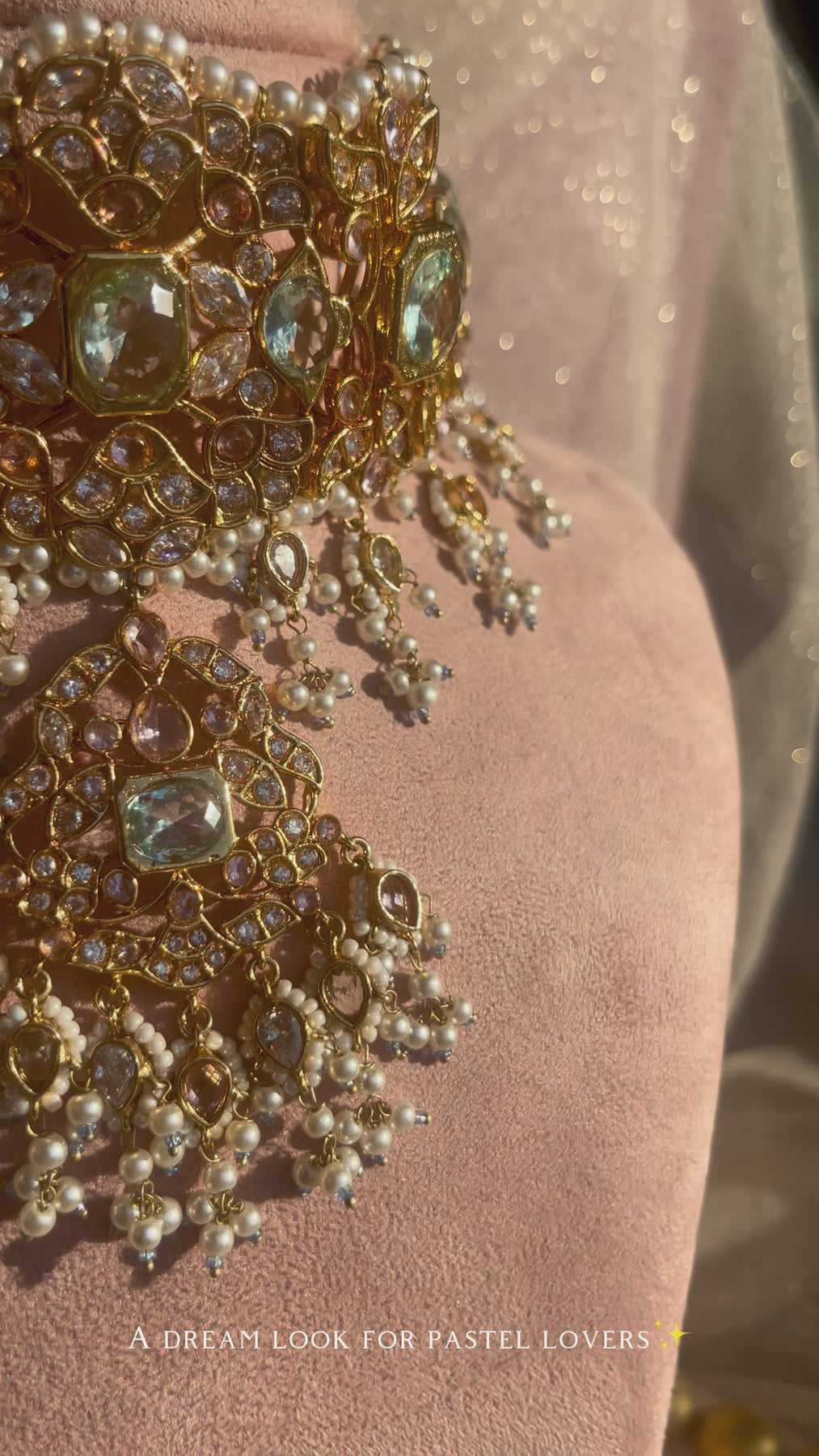 Beautiful necklace set featuring an exquisite combination of light blue stones, lending the right amount of glamour to this classic set.