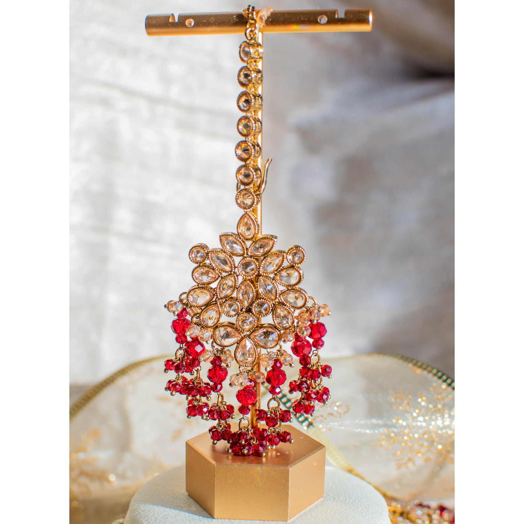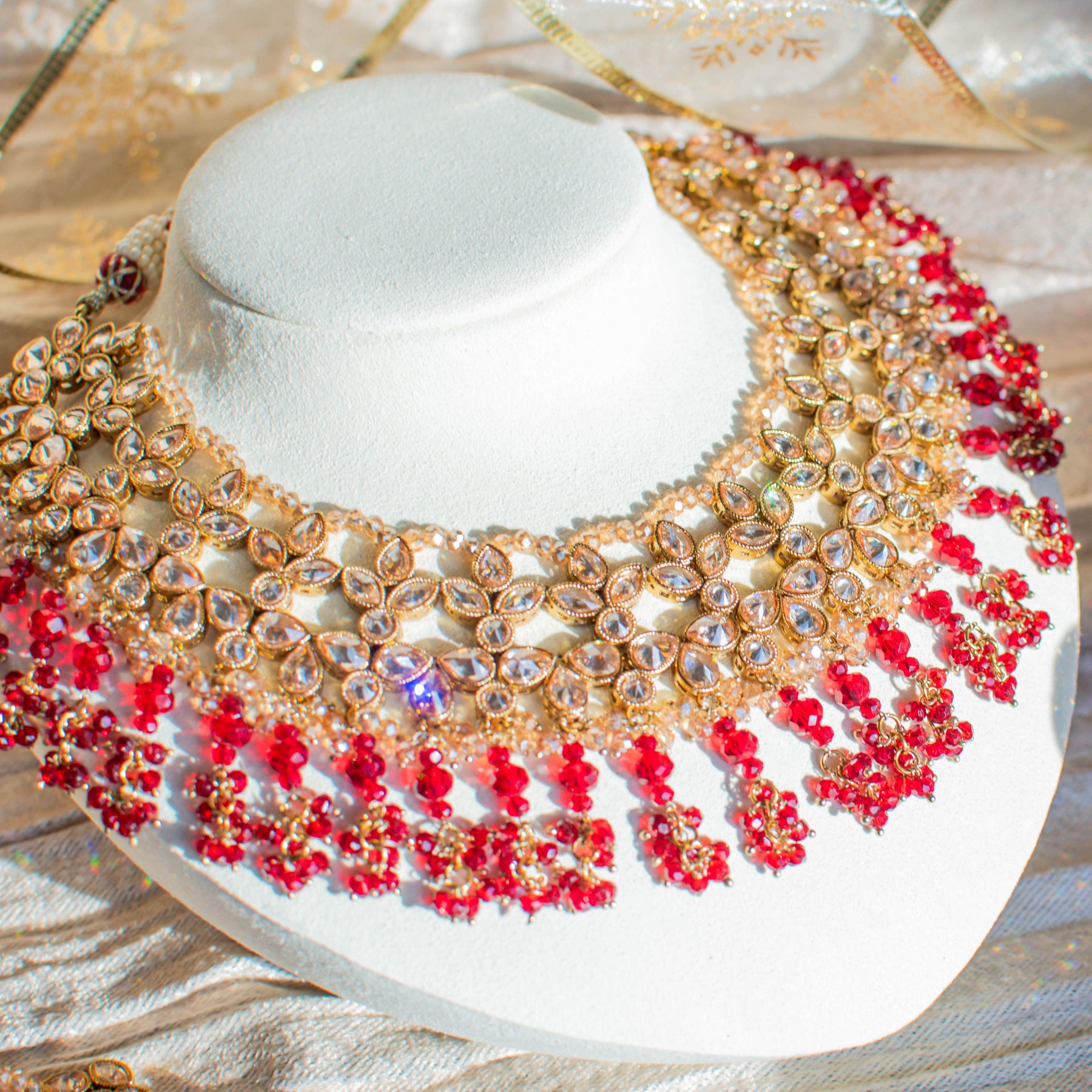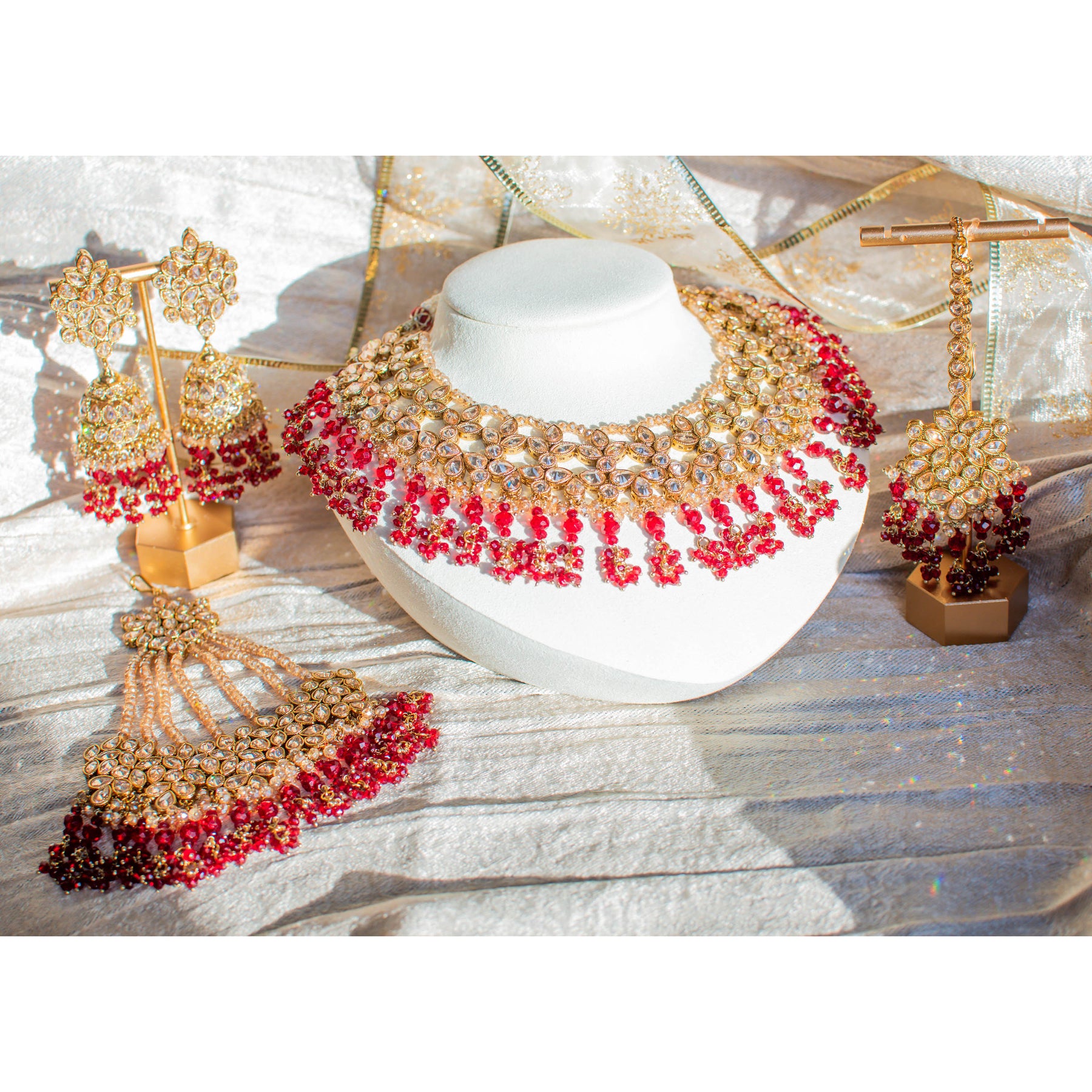 Featuring a beautifully detailed ensemble adorned with delicate ruby beads and shimmering champagne stones, this set is perfect for adding a touch of vintage glamour to any special occasion.