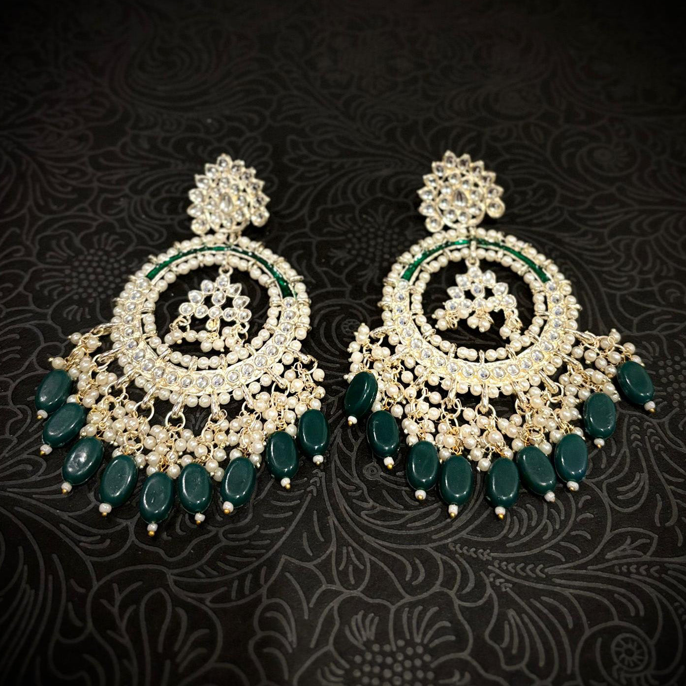 Royal and beautiful chaand-bali earrings embellished with kundan stones together with pearl beads.
