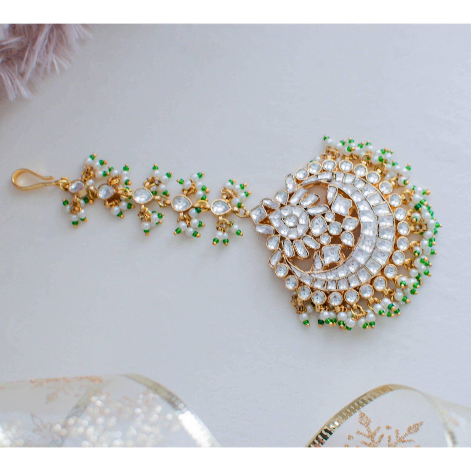 Crown this glorious over-sized maang teekah studded with resplendent kundan stones, lustrous pearl moti and captivating green moti radiating a harmonious blend of regal opulence and timeless beauty.