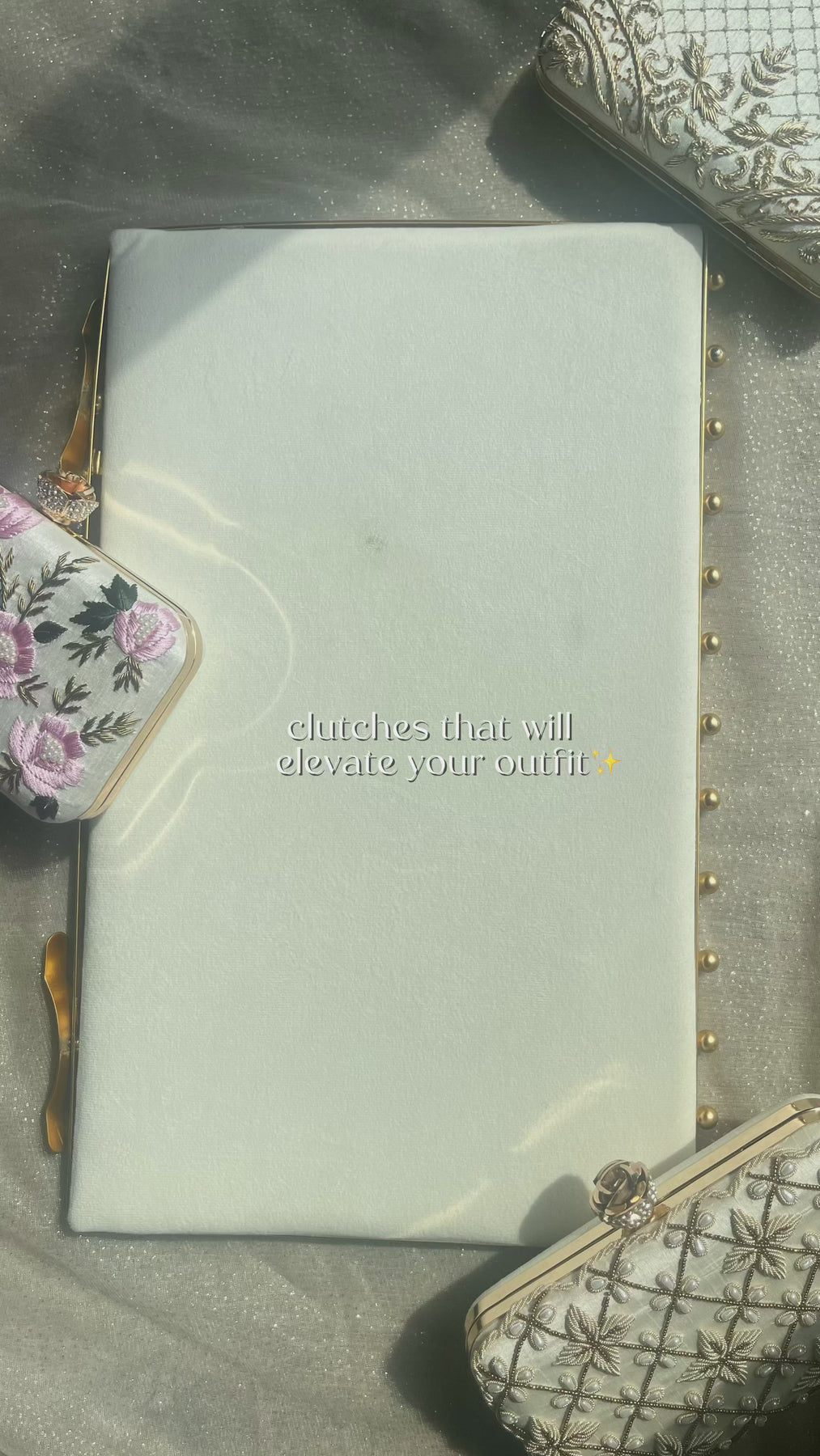 Elegant clutch decorated with beautiful floral thread and zari work. The clutch has a floral knob and a detachable shoulder chain.