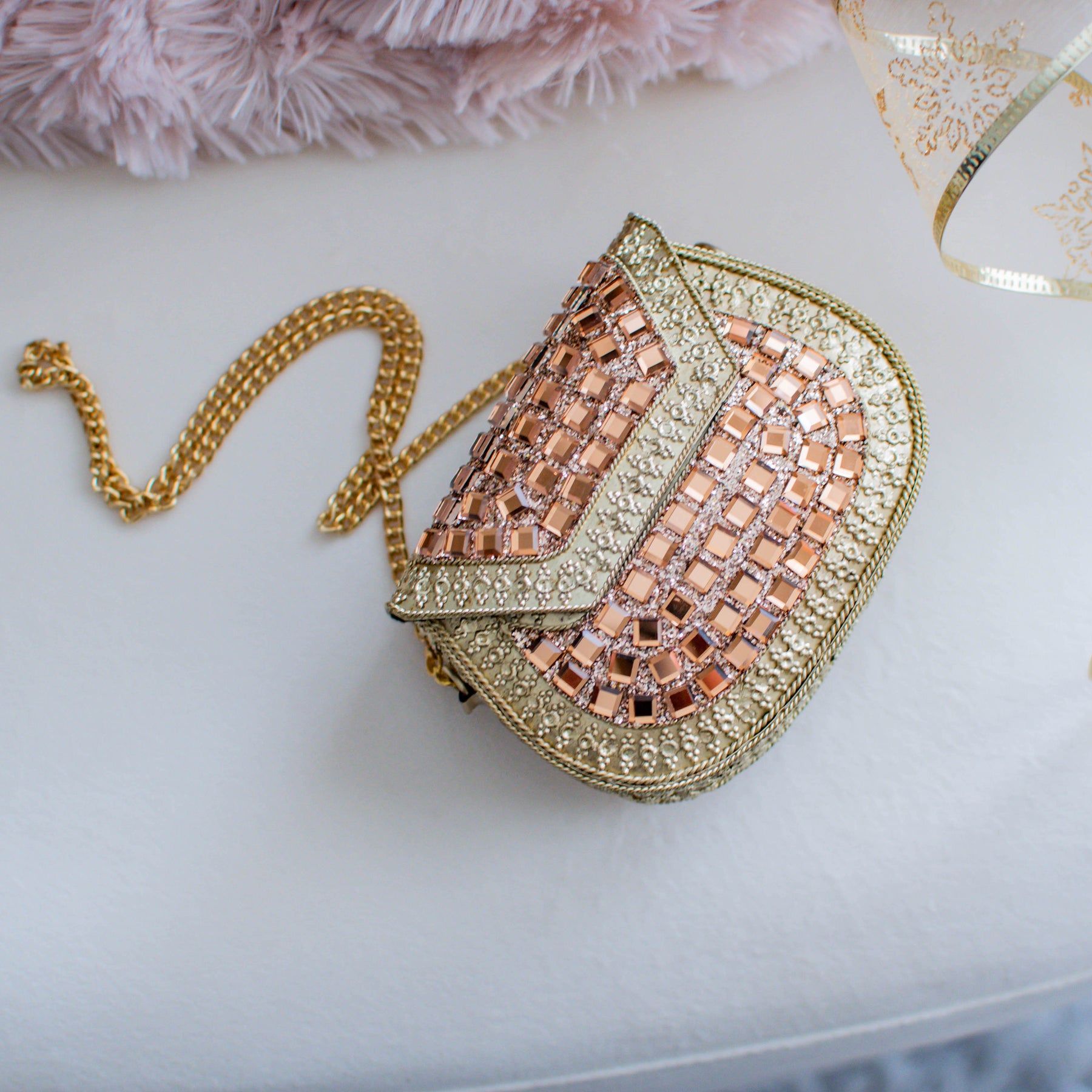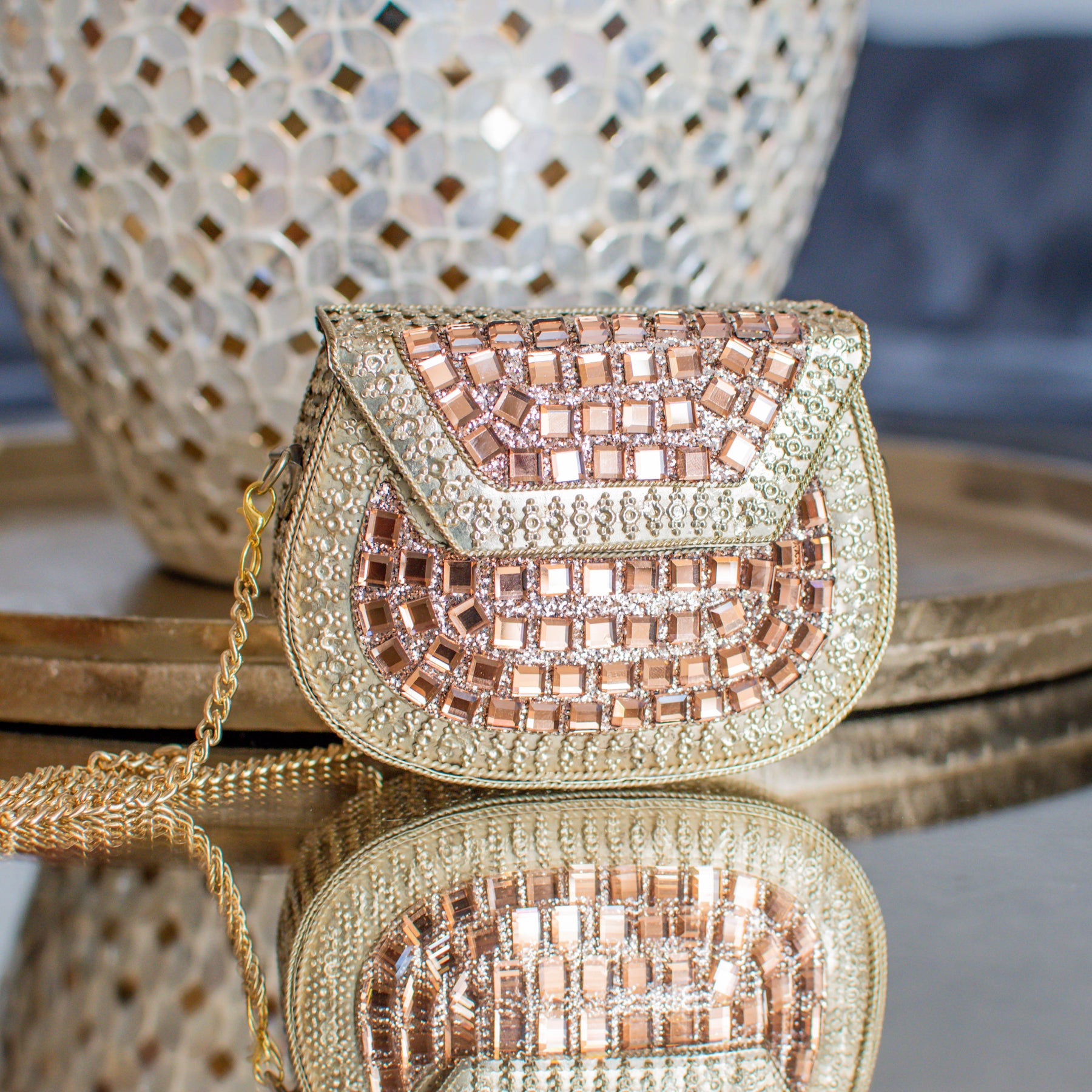 This mini brass clutch, adorned with hand-pasted mirrors, reflects pure sophistication.