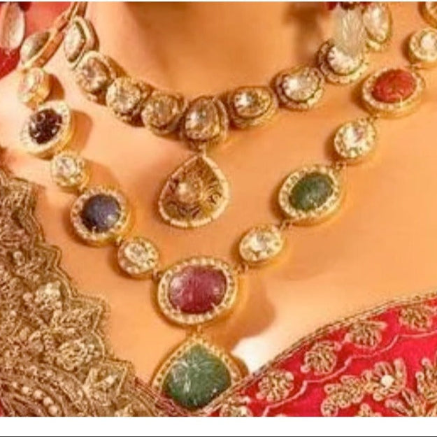 The listing includes a choker, a necklace, a maang teekah and a pair of earrings. The choker will have all clear stones. The necklace should follow the stone color shades from picture 2. Complete length of the necklace is 20" and approximate earrings length is 3".