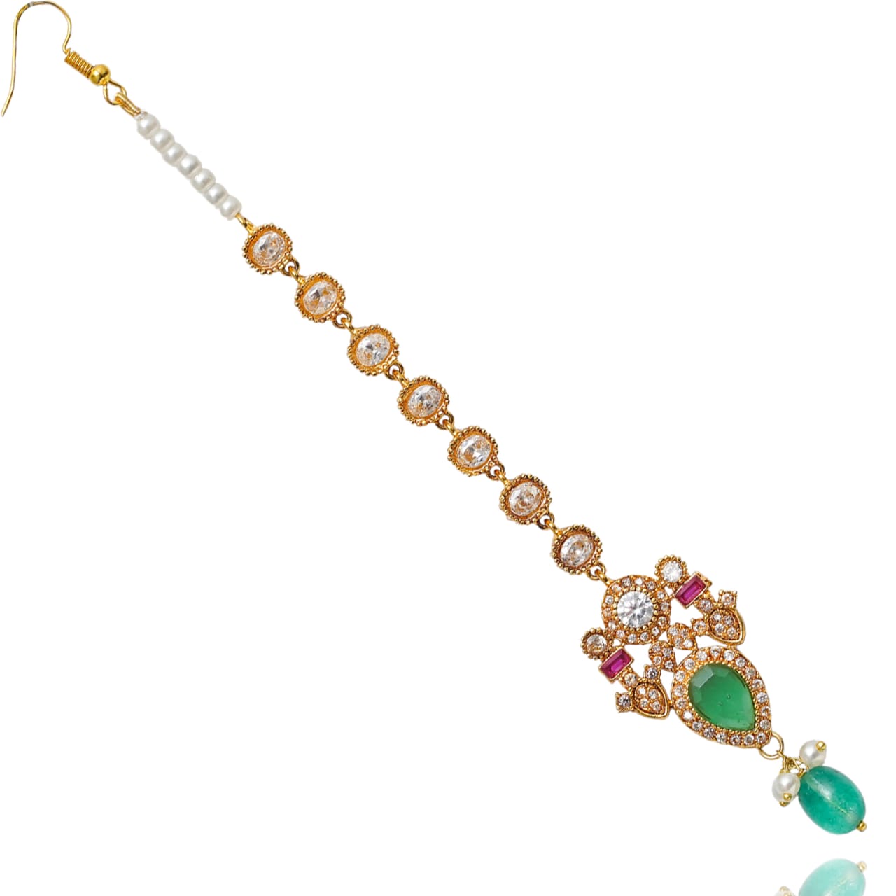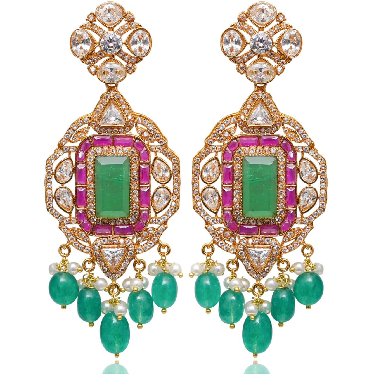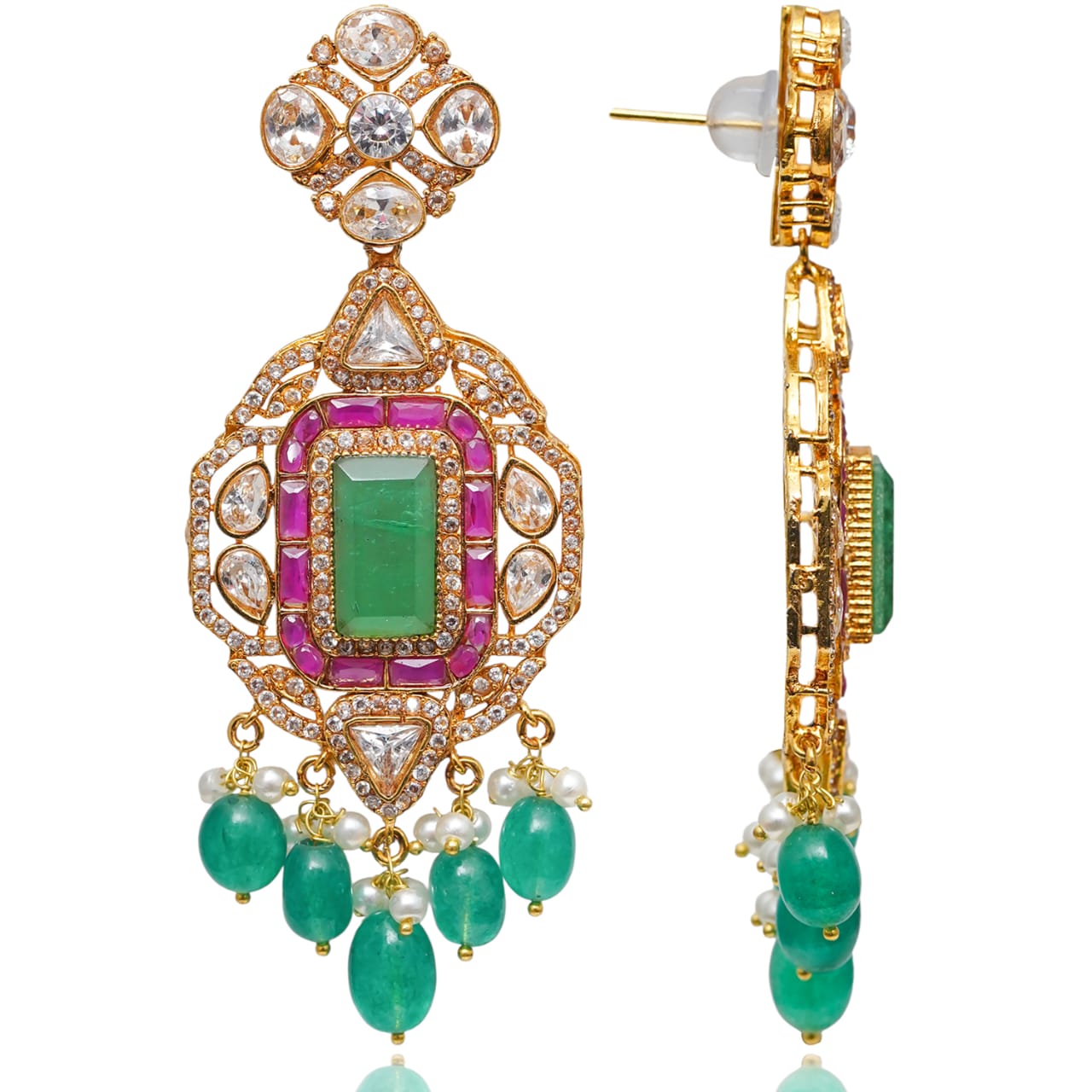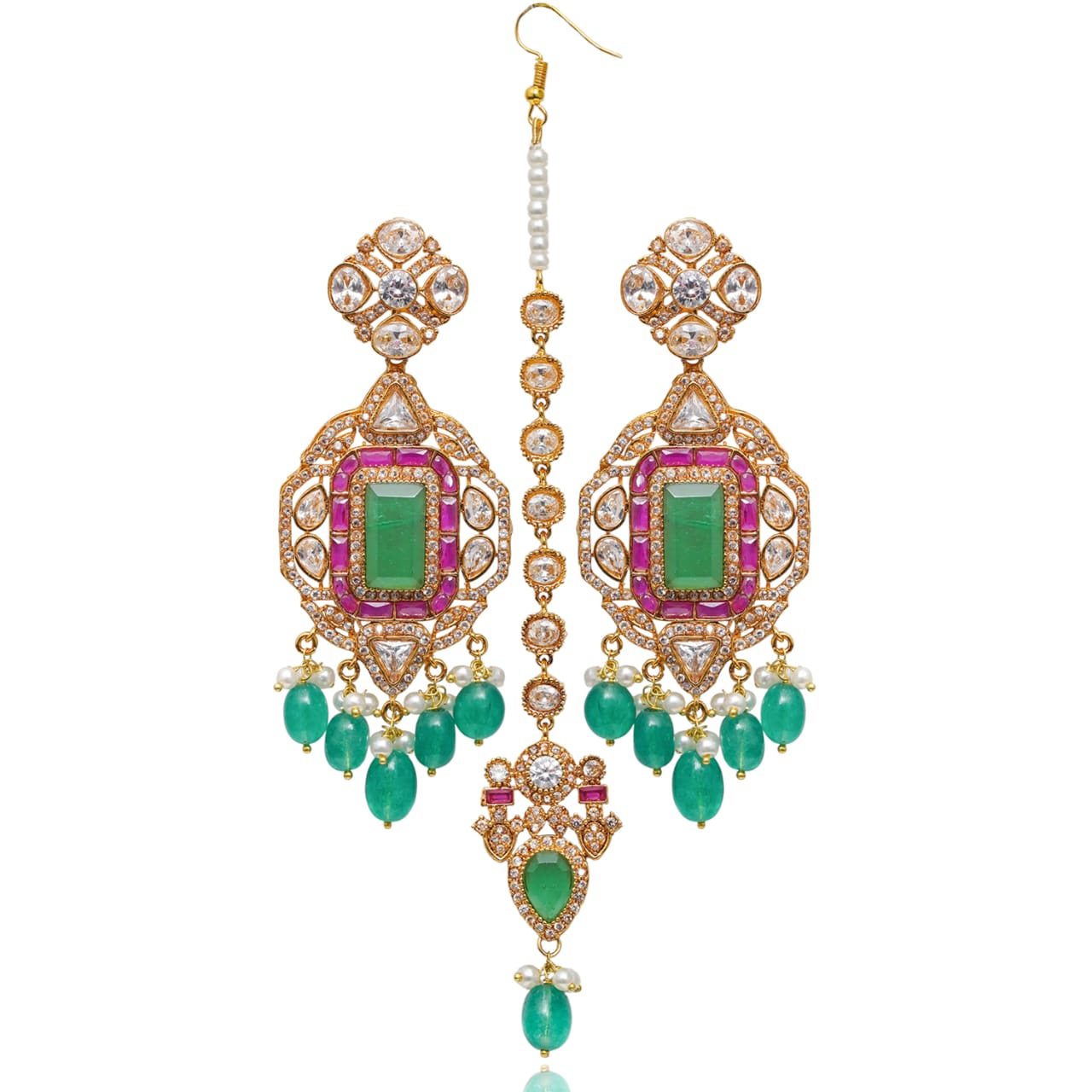 A lavish, heritage-inspired trio featuring ruby, emerald and CZ stones framed in intricate detailing. Finished with dangling emerald beads and delicate pearls, this set embodies opulent color play and regal charm in every inch.