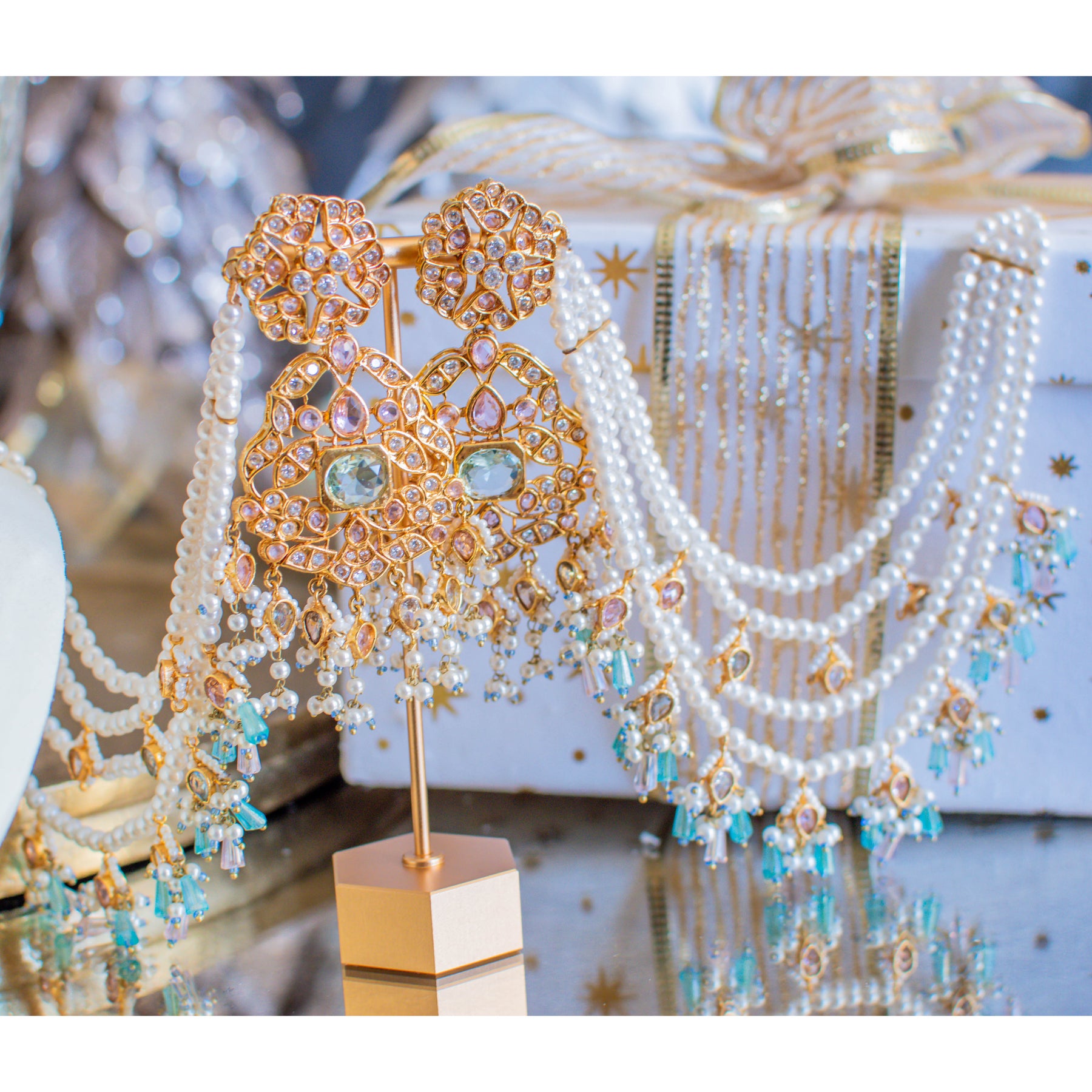Beautiful pair of earrings with strands of saharay featuring an exquisite combination of light blue stones, lending the right amount of glamour to this classic piece. Approximate earrings length is 4".