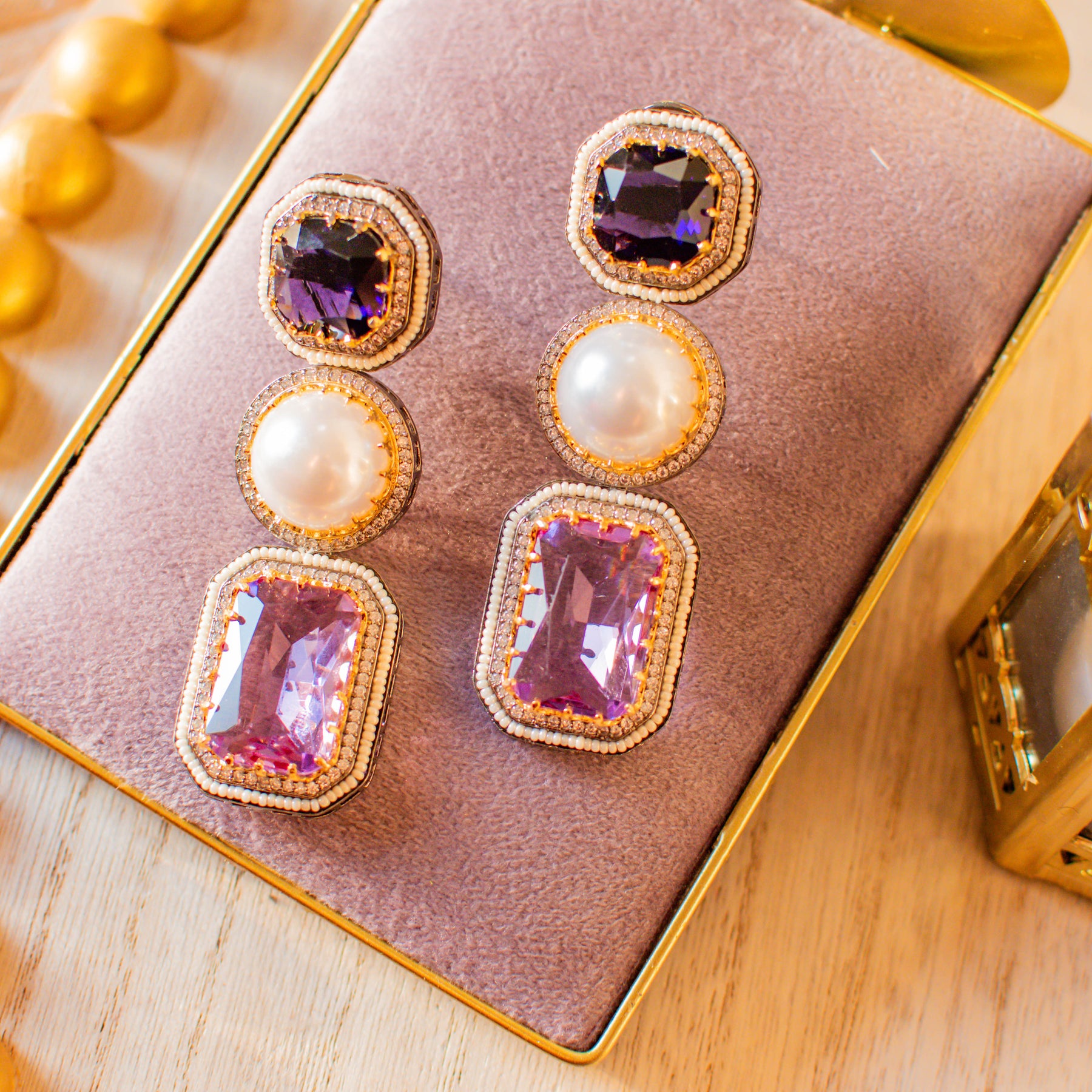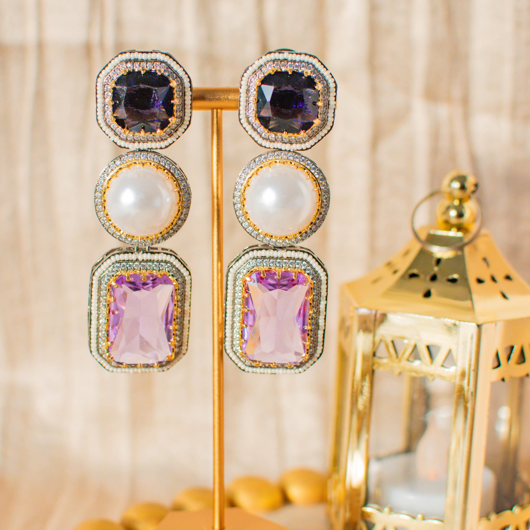 Gorgeous pair of earrings luxuriously studded with amethyst, pearl and CZ stones - perfect to wear them in your favorite fancy events to make all eyes rest on you. Approximate earrings length is 3.2".