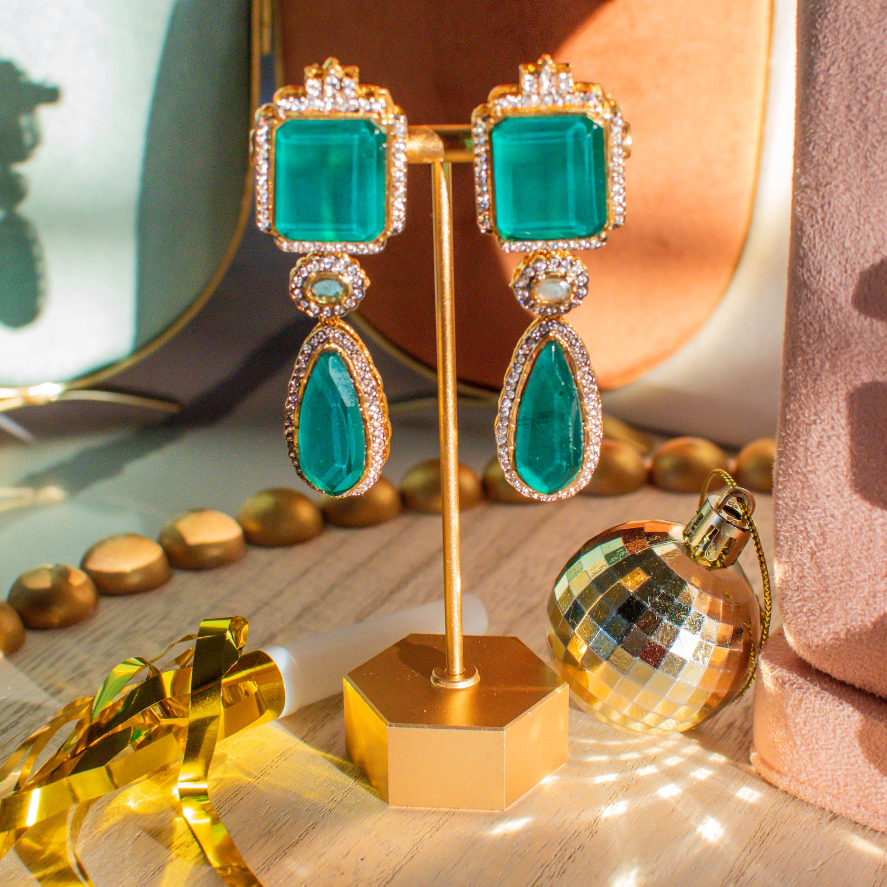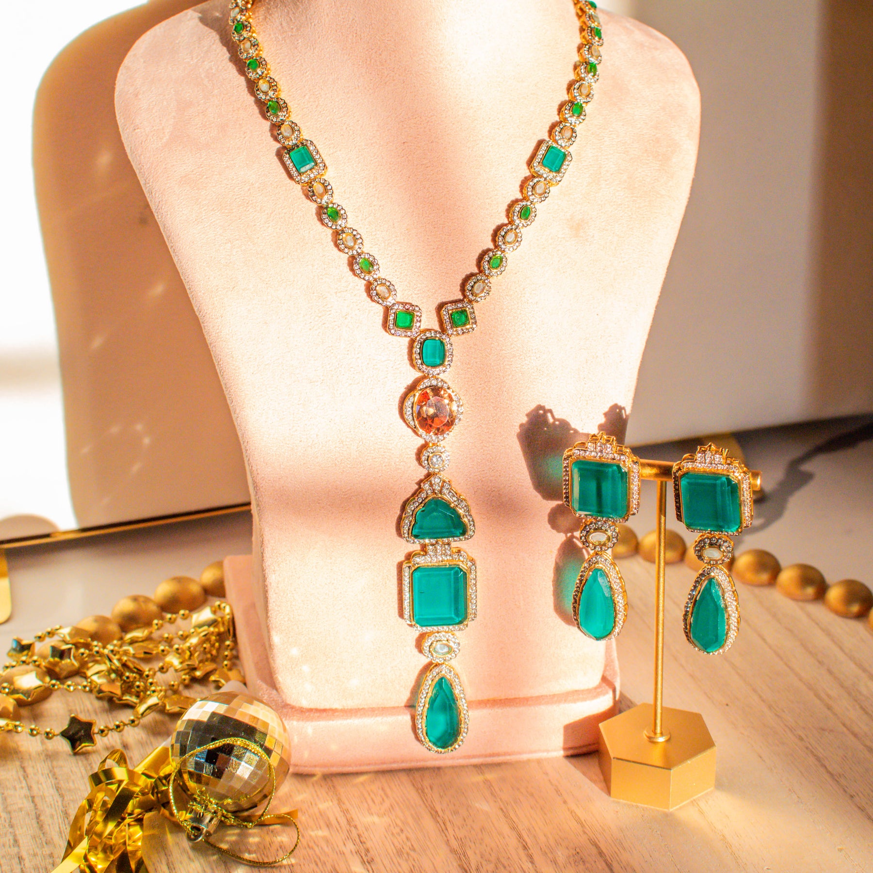 This exquisite jewelry set redefines opulence with its vibrant emerald stones, statement champagne stone and sparkling accents. This statement necklace and matching earrings set is intricately crafted, blending timeless elegance with a modern touch. Approximate necklace length is 12". Approximate earrings length is 3.1".