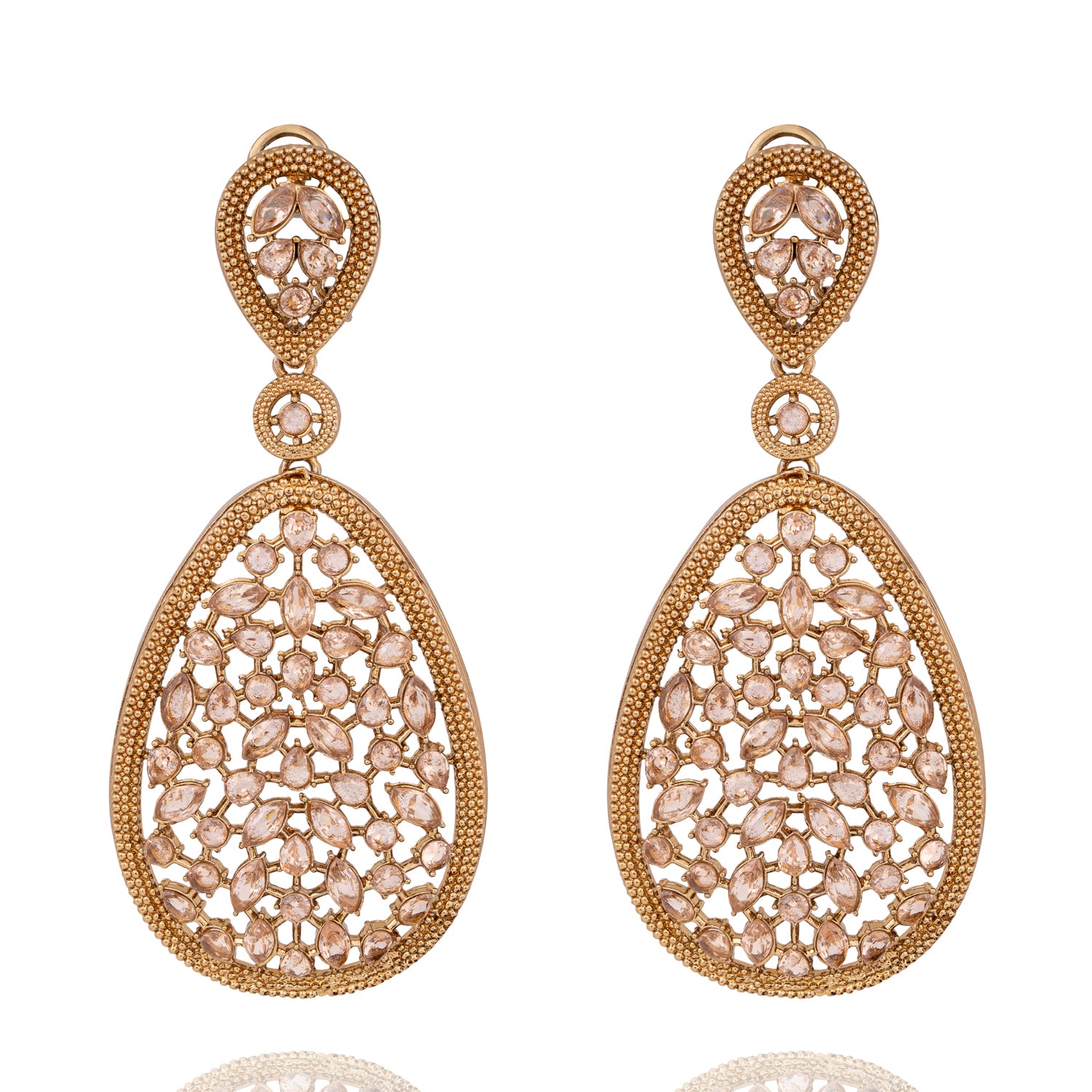 Delicately crafted earrings adorned with champagne stones, designed to shimmer subtly while leaving a lasting, refined impression. Approximate earrings length is 3".