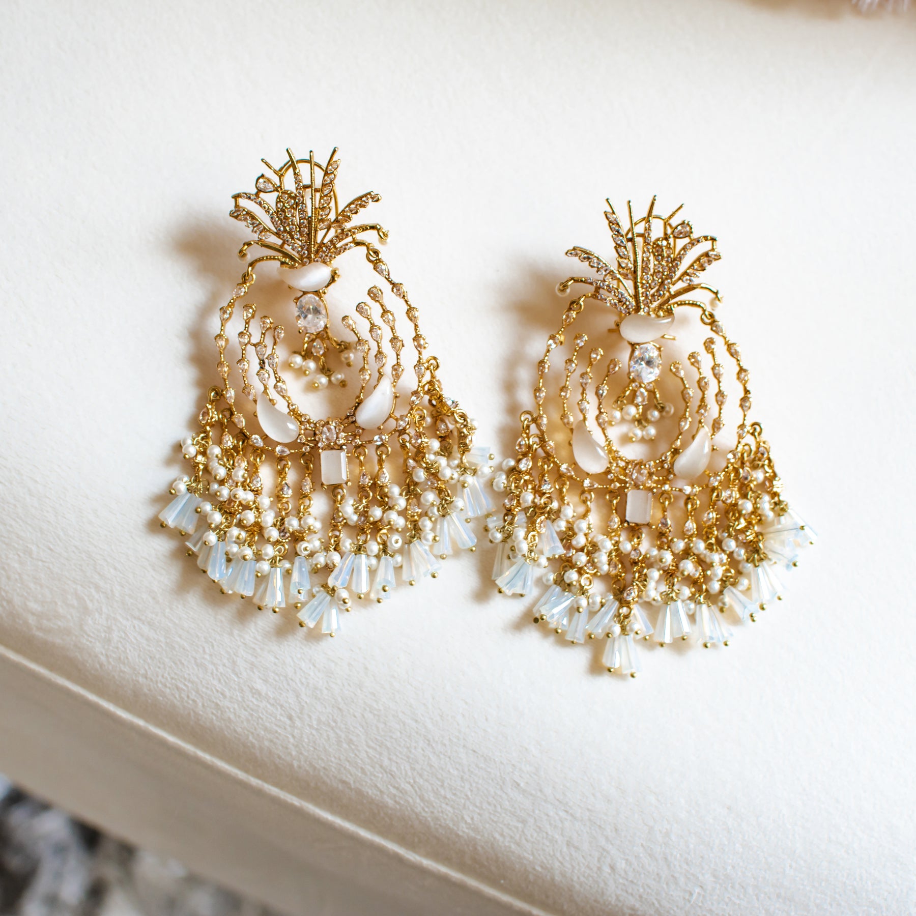 Channel the inner glamour with our statement earrings, featuring intricate craftsmanship, delicate white stones, and a cascade of elegance, this pair adds an enchanting charm to your evening look - making it a masterpiece for modern royalty. Approximate earrings length is 4".