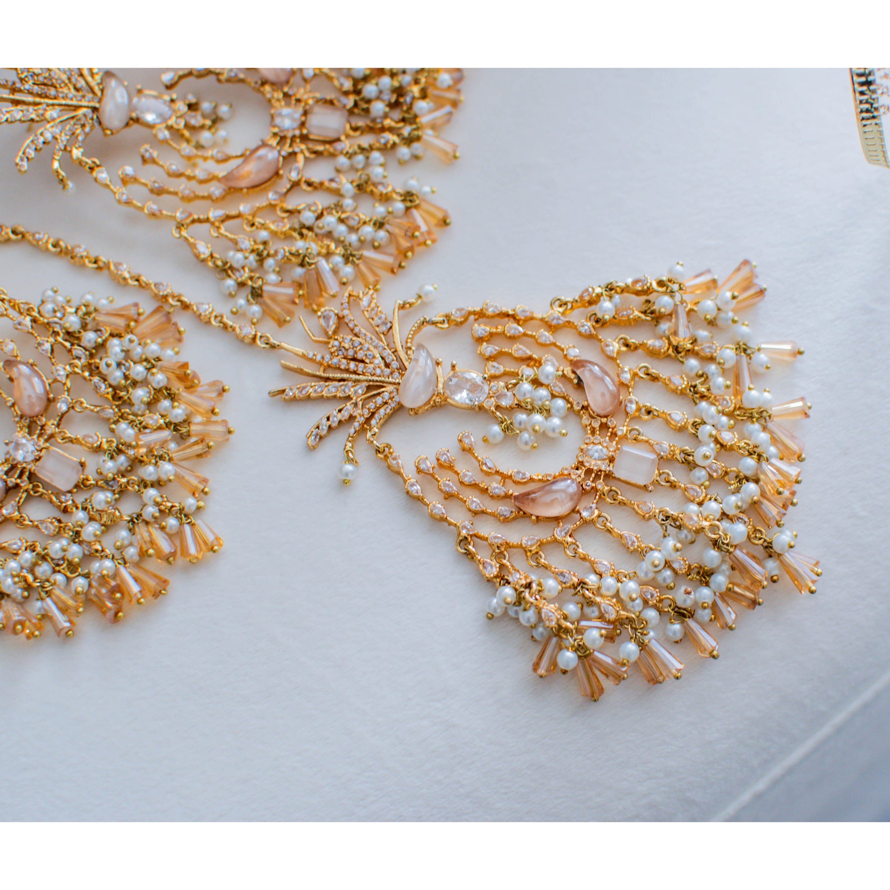 Channel the inner glamour with our statement earrings and teekah set, featuring intricate craftsmanship, delicate champagne stones, and a cascade of elegance, adding an enchanting charm to your evening look - making it a masterpiece for modern royalty.