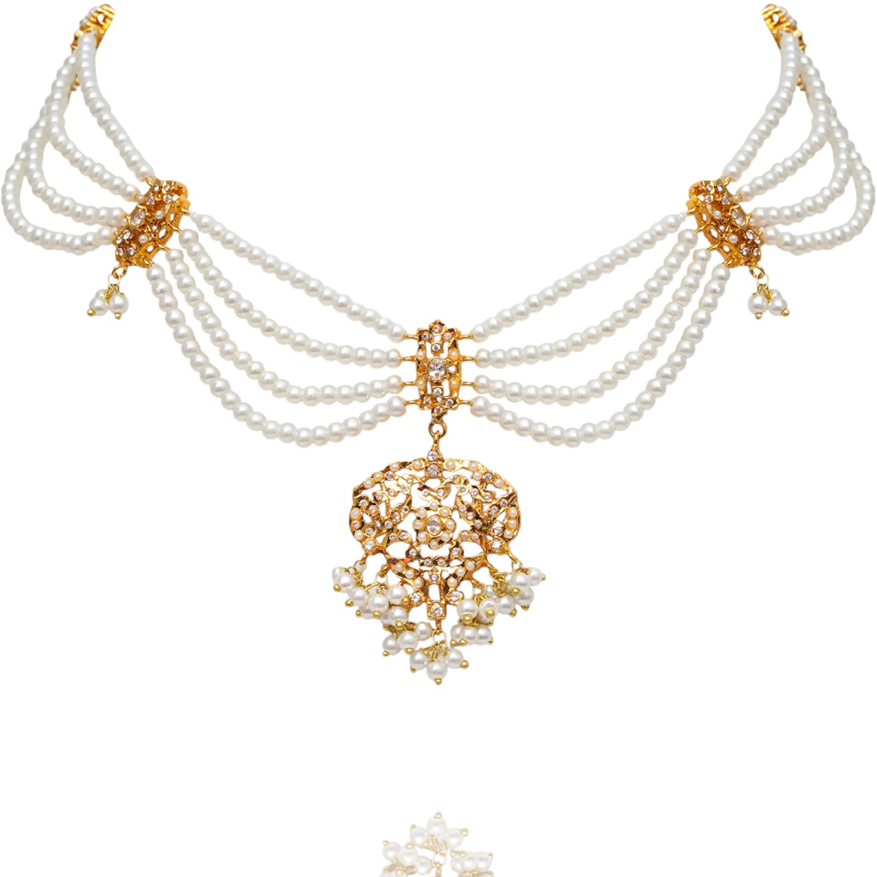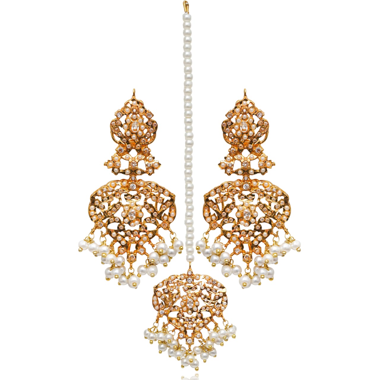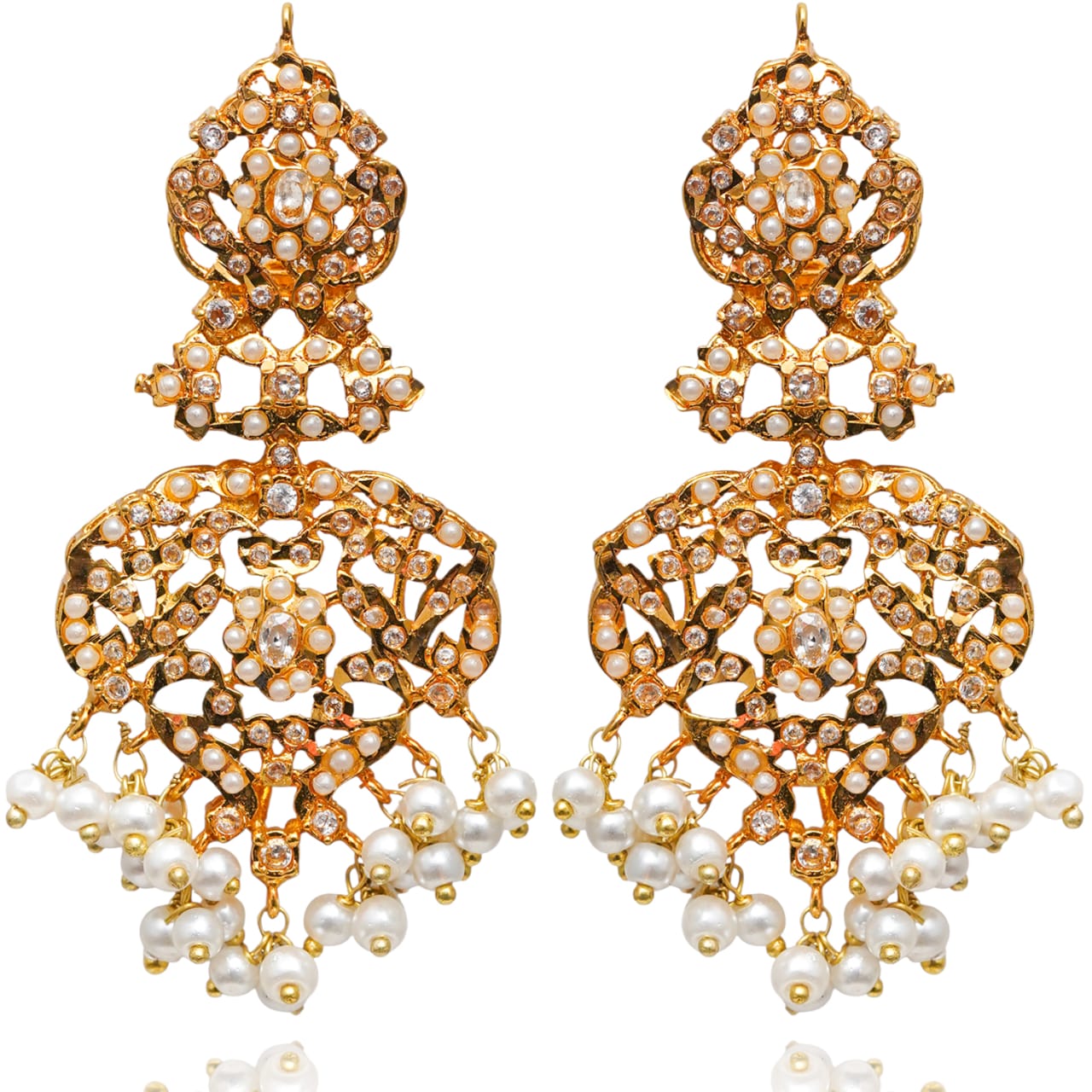 Indulge in timeless opulence with this exquisite handcrafted jewelry set, a symphony of luminous pearls, intricate gold filigree and CZ stones.