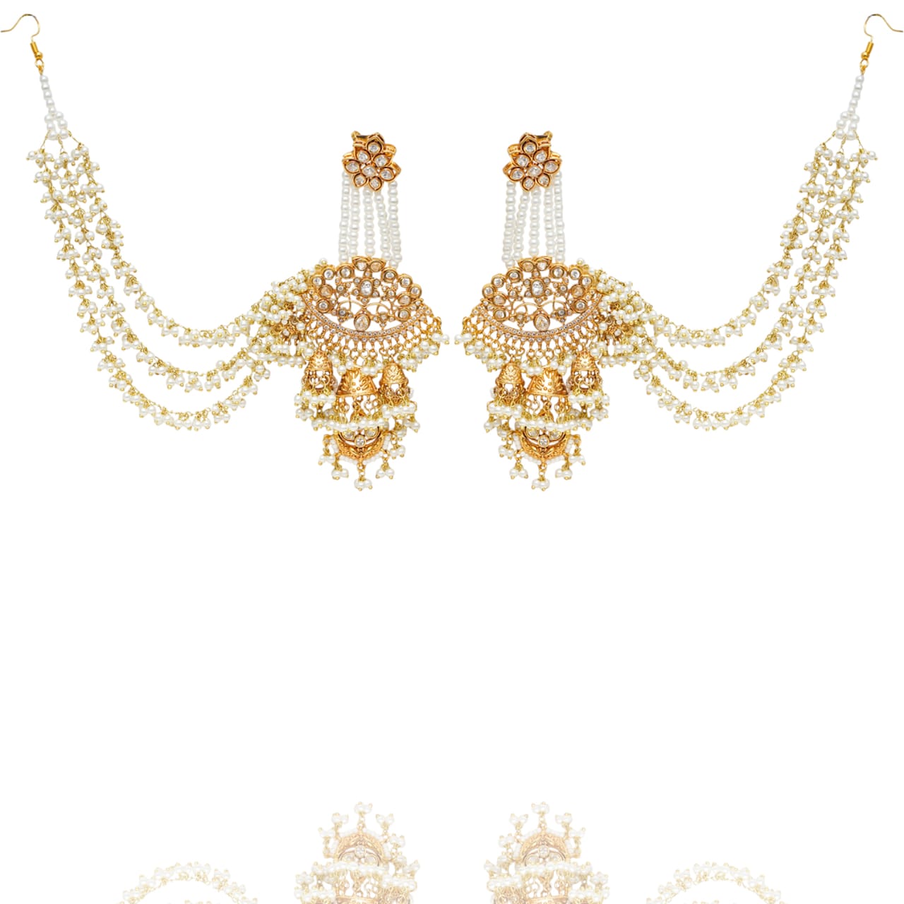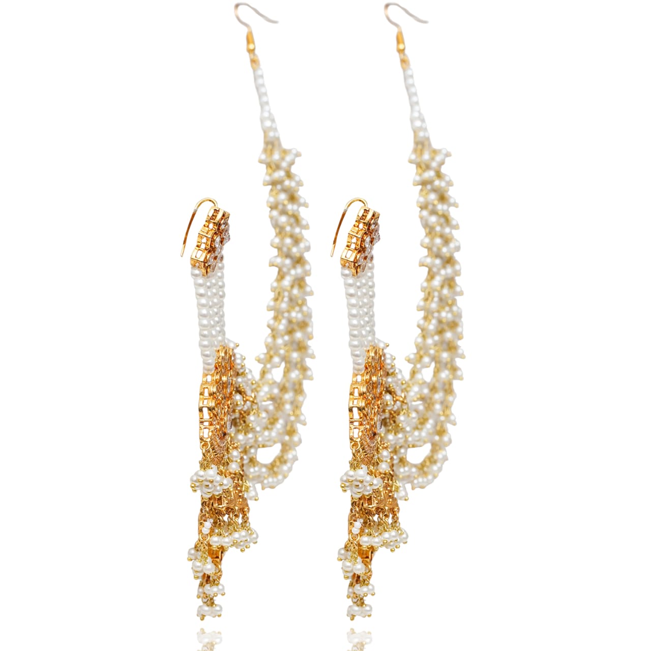 A symphony of cascading pearl strands and ornate kundan artistry, this pair embodies regal opulence and traditional magnificence. Approximate earrings length is.