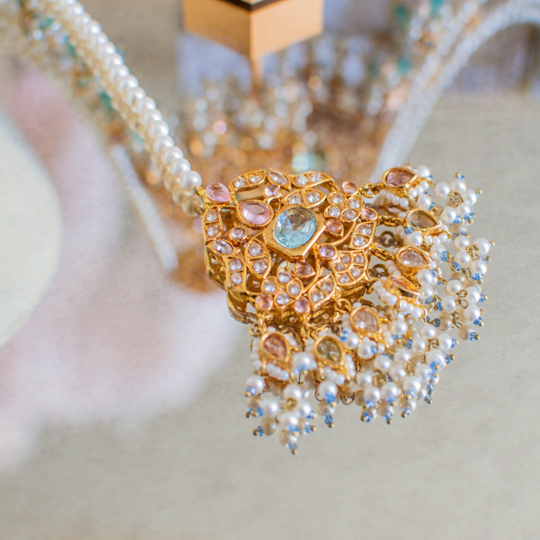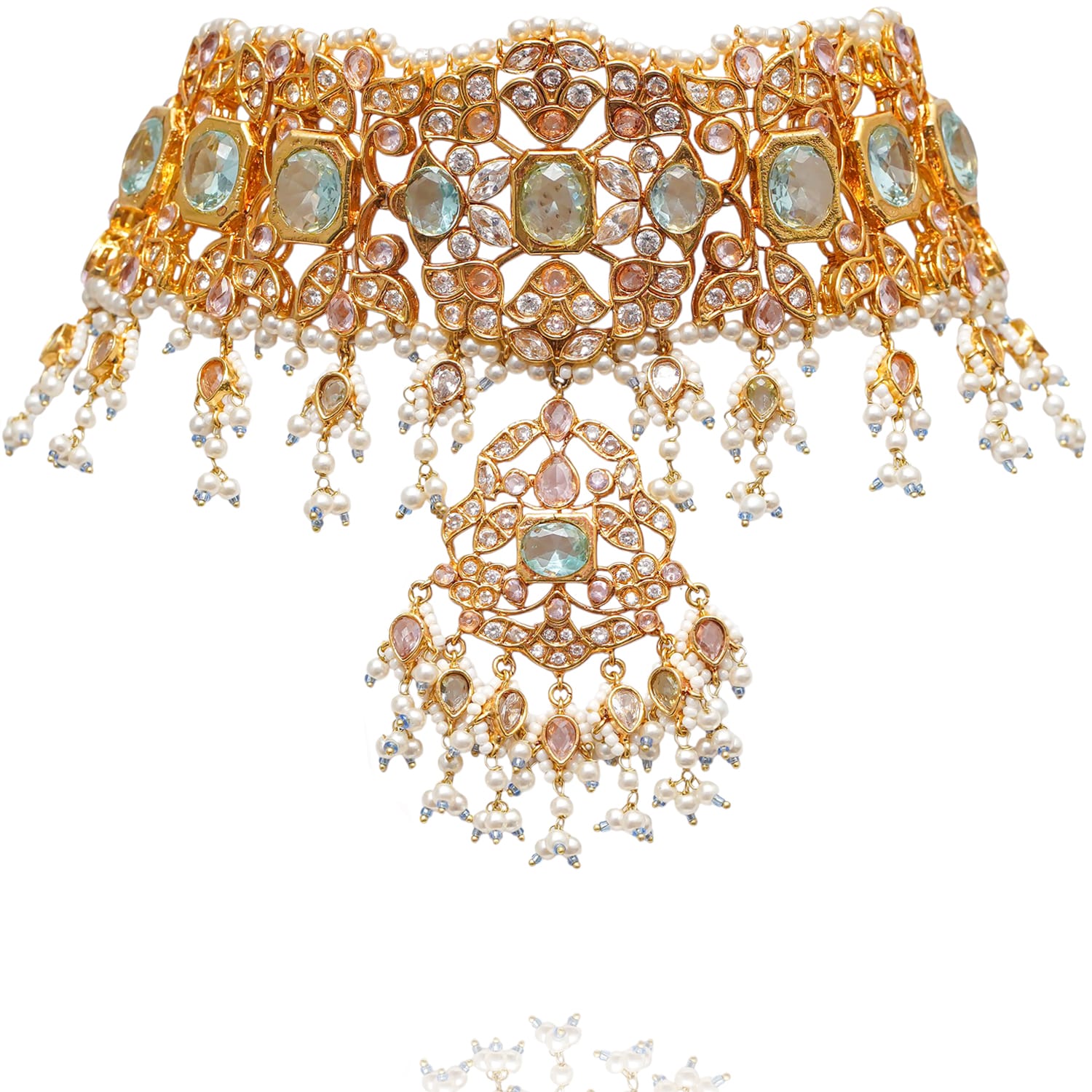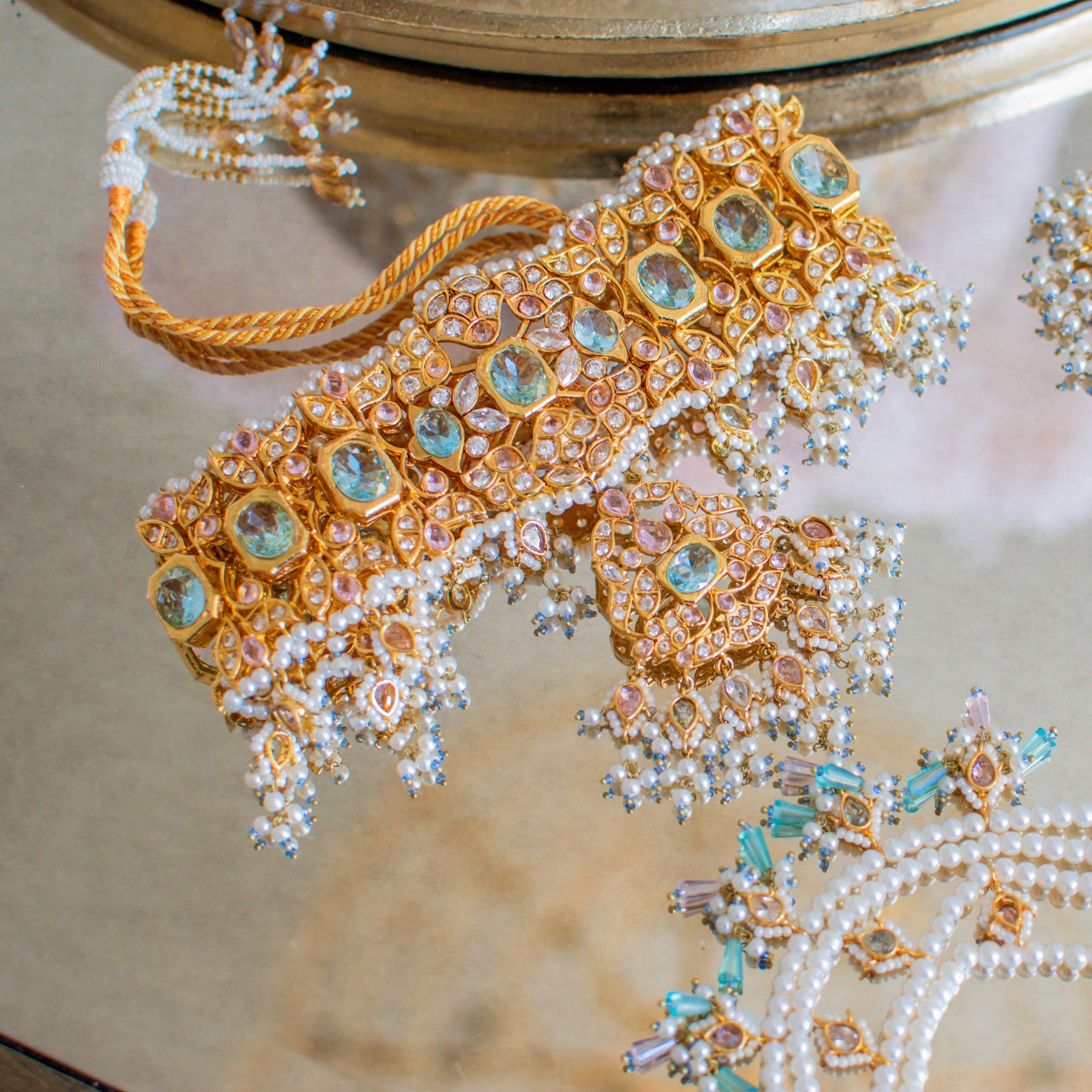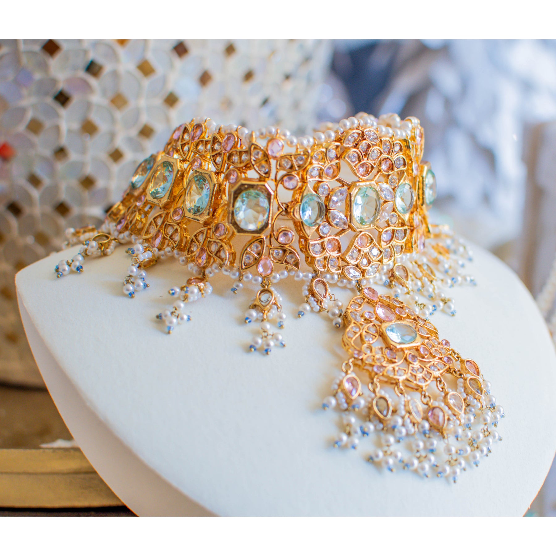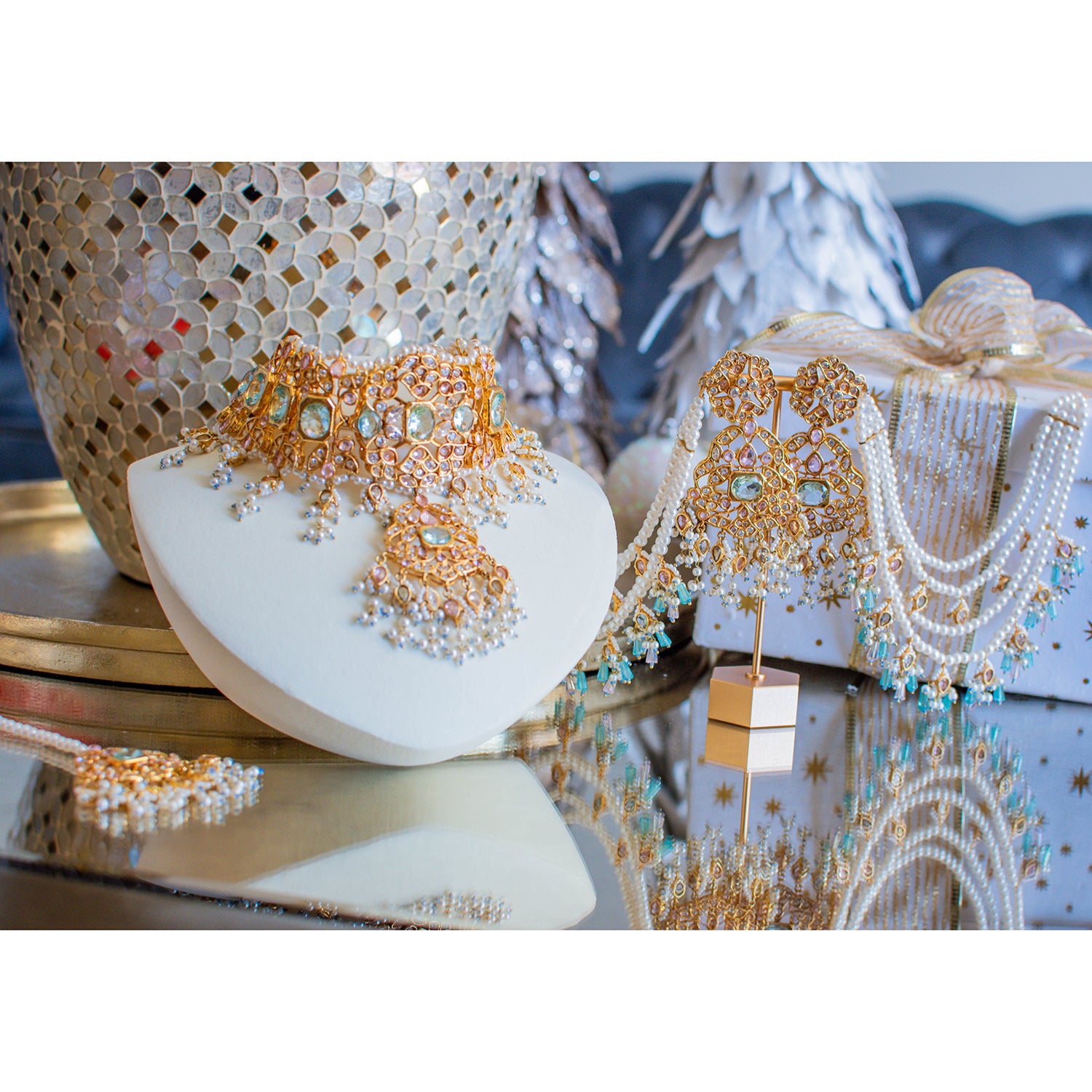 Beautiful necklace set featuring an exquisite combination of light blue stones, lending the right amount of glamour to this classic set.