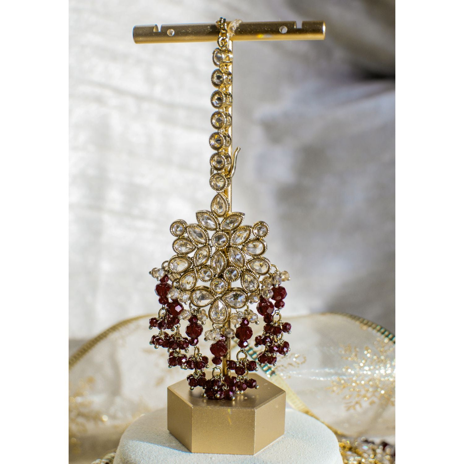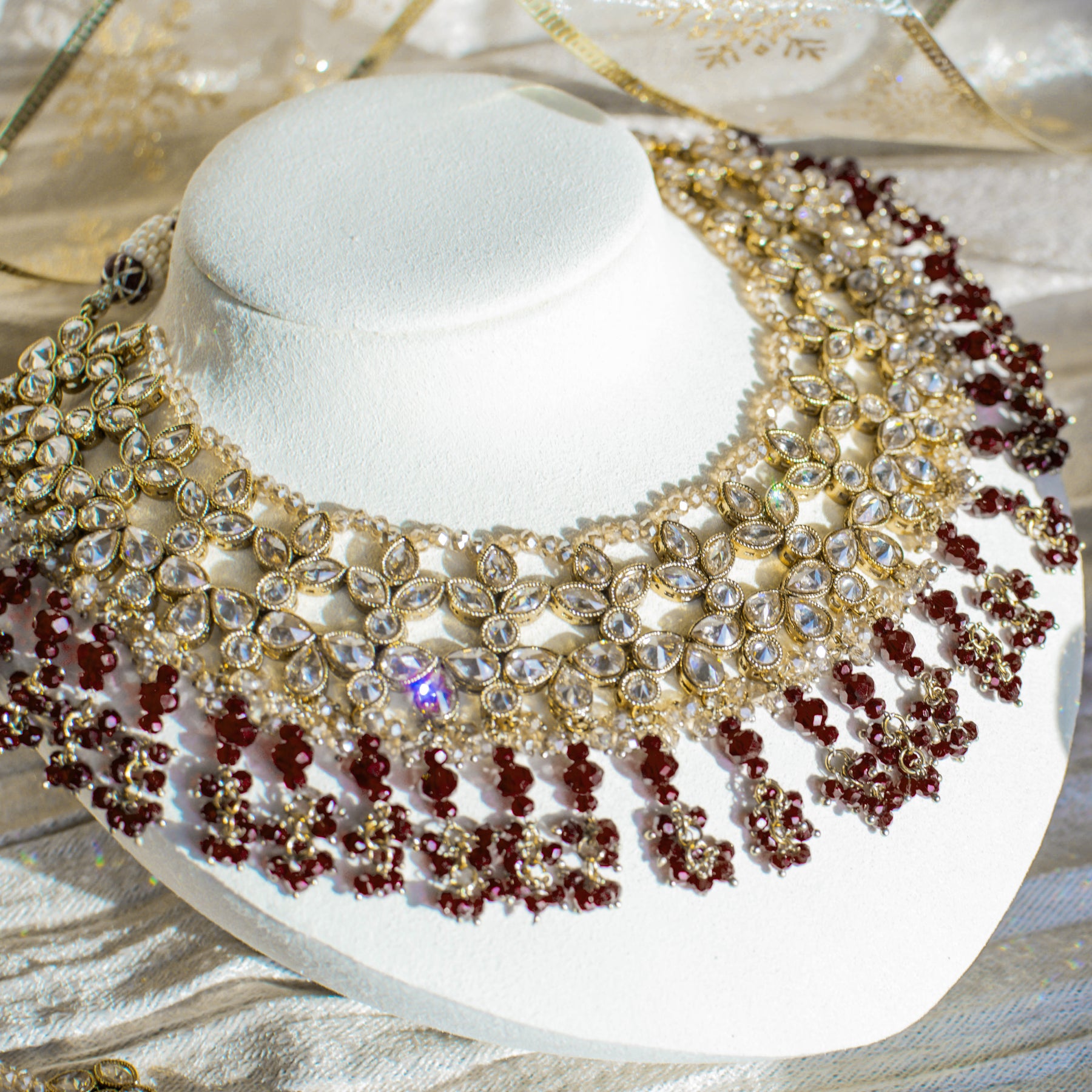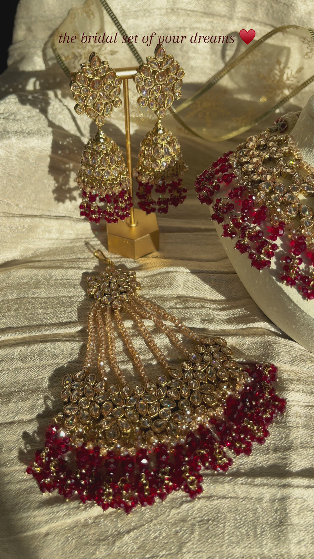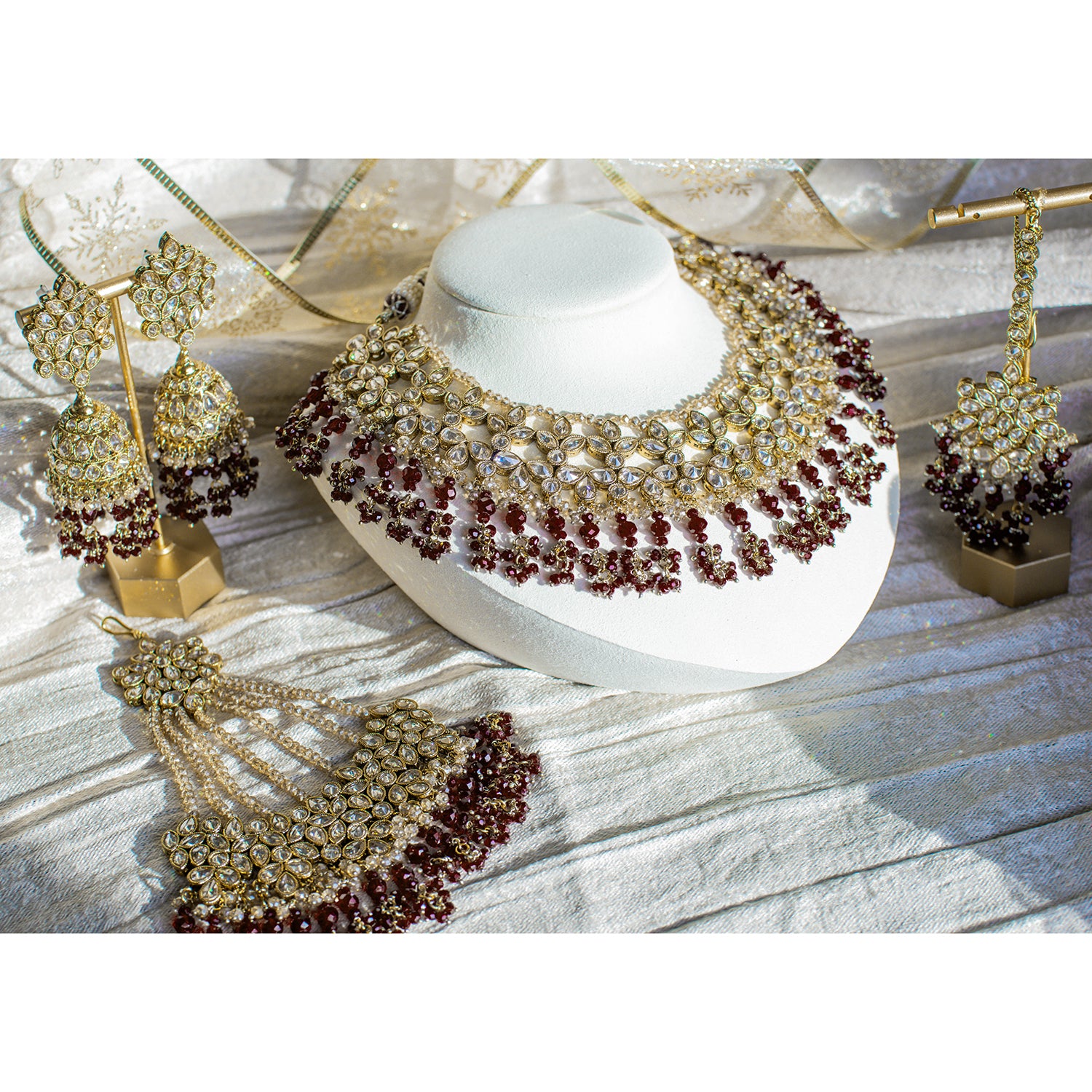 Featuring a beautifully detailed ensemble adorned with delicate ruby beads and shimmering champagne stones, this set is perfect for adding a touch of vintage glamour to any special occasion.
