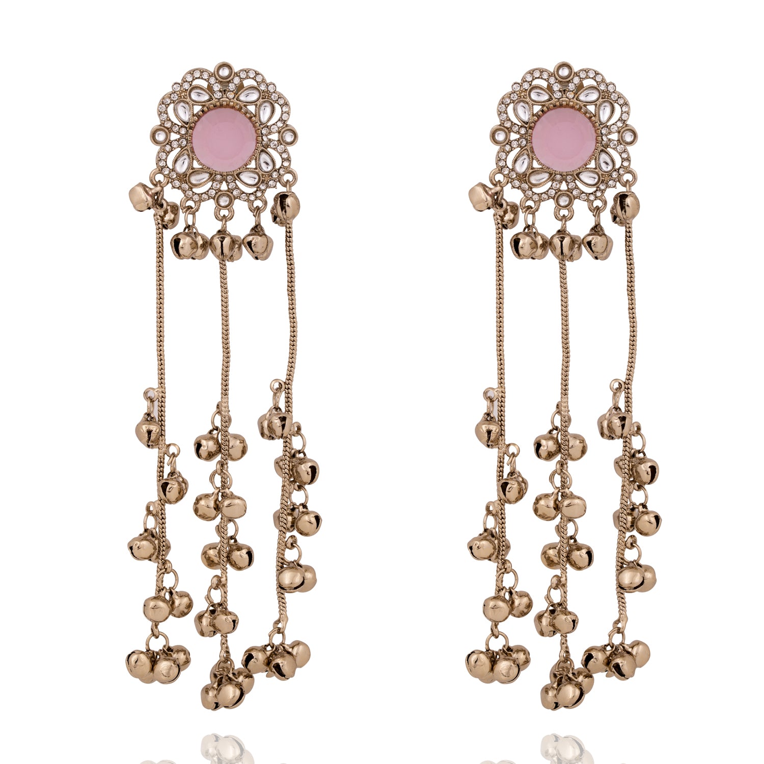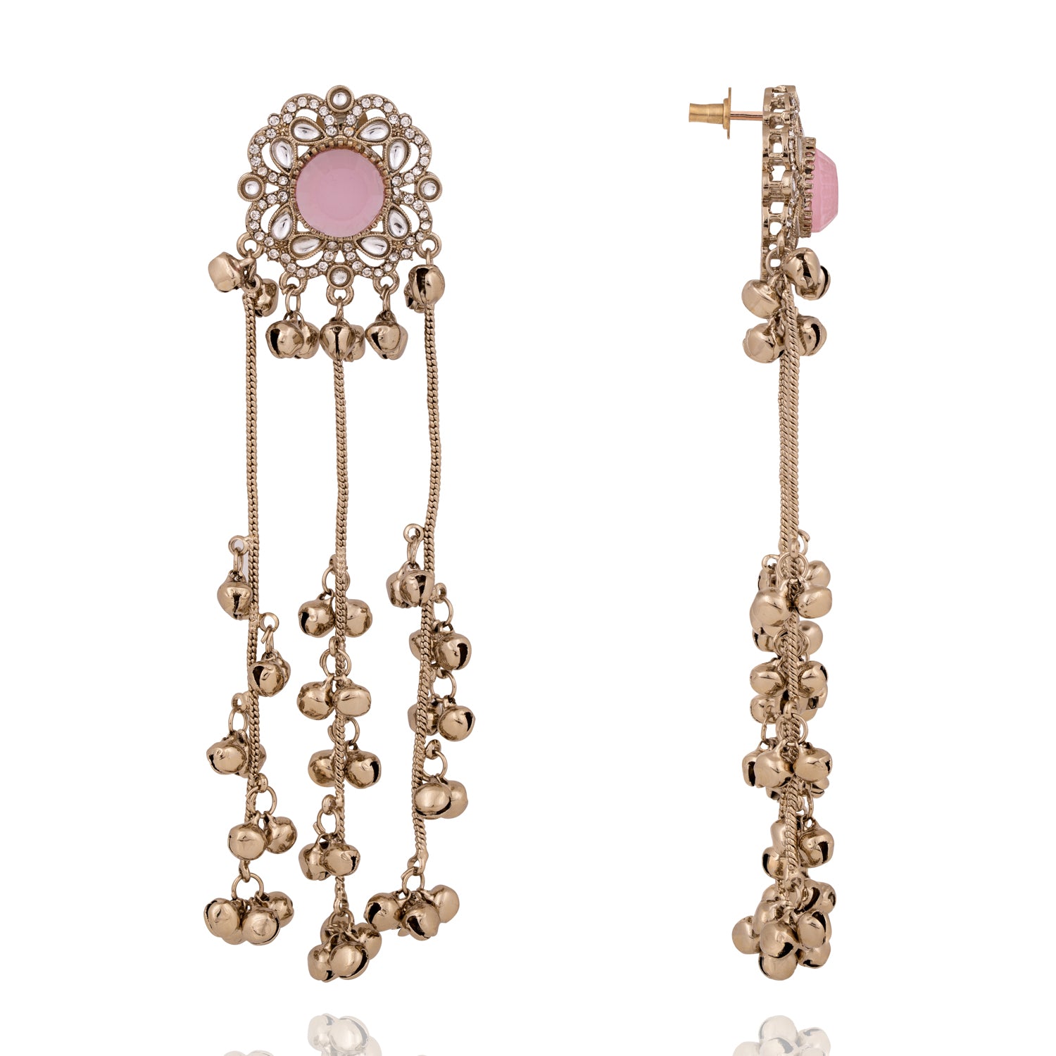 Delicate earrings adorned with ruby/pink/purple stones and graceful ghungroo drops, creating a timeless charm with gentle movement and melody. Approximate earrings length is 5.1".