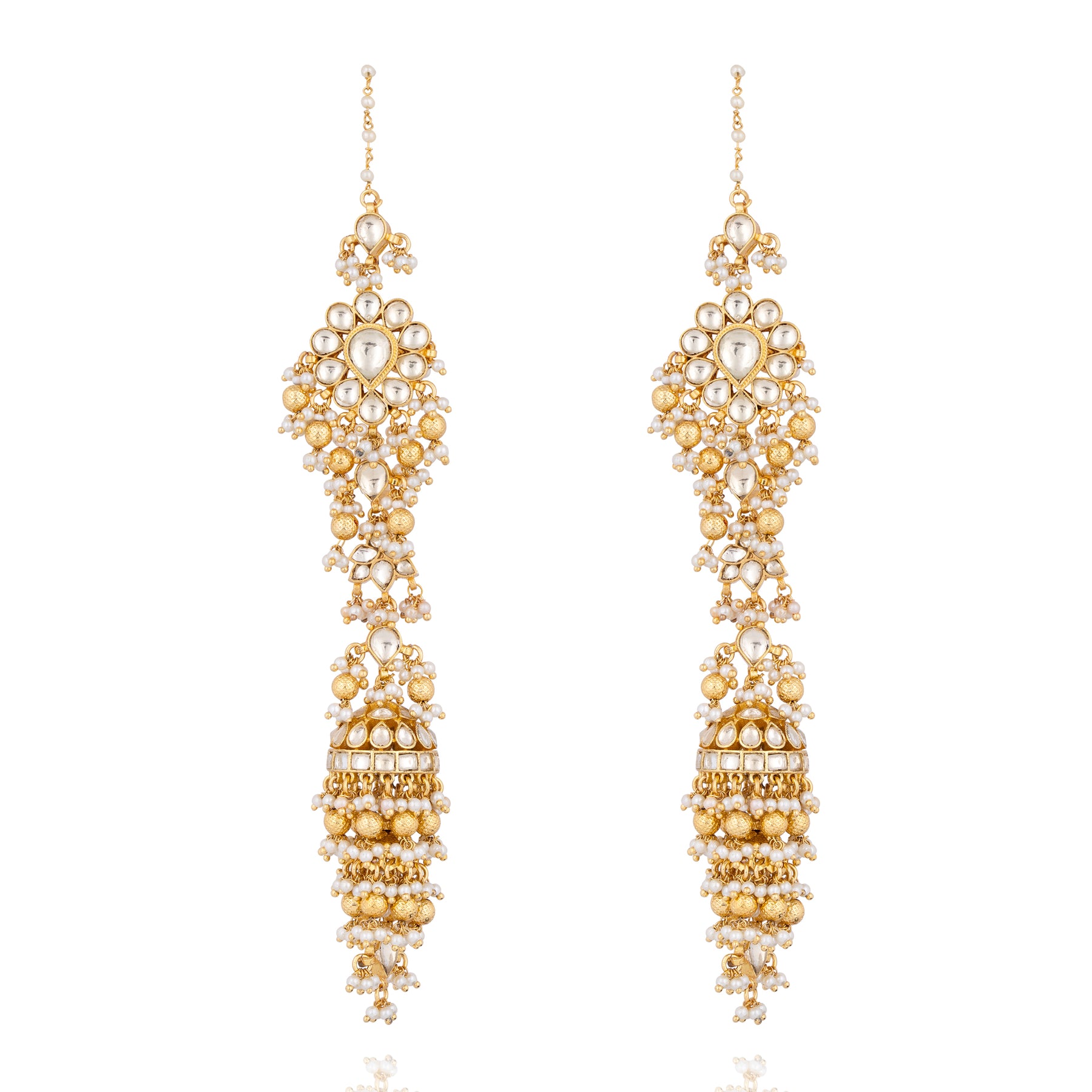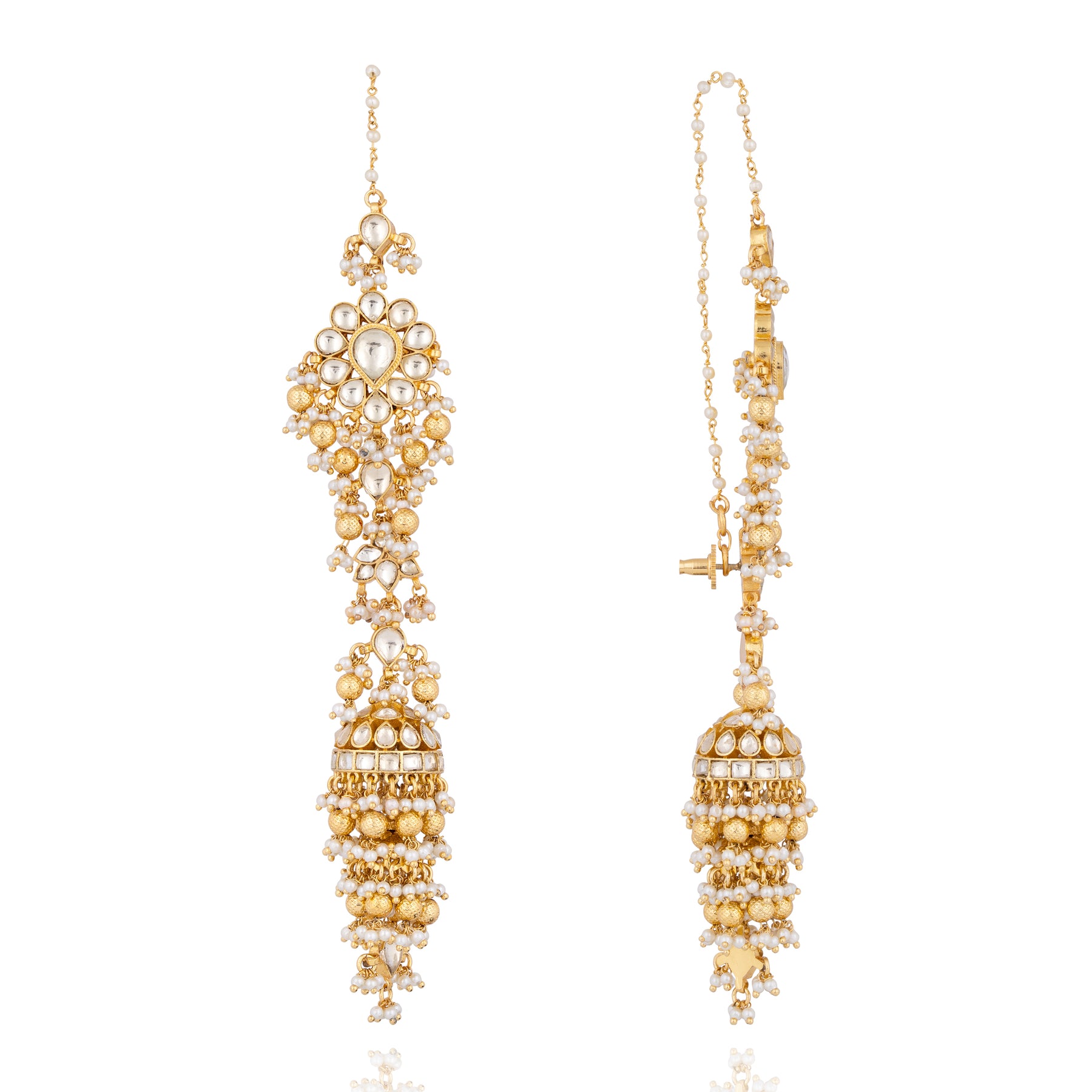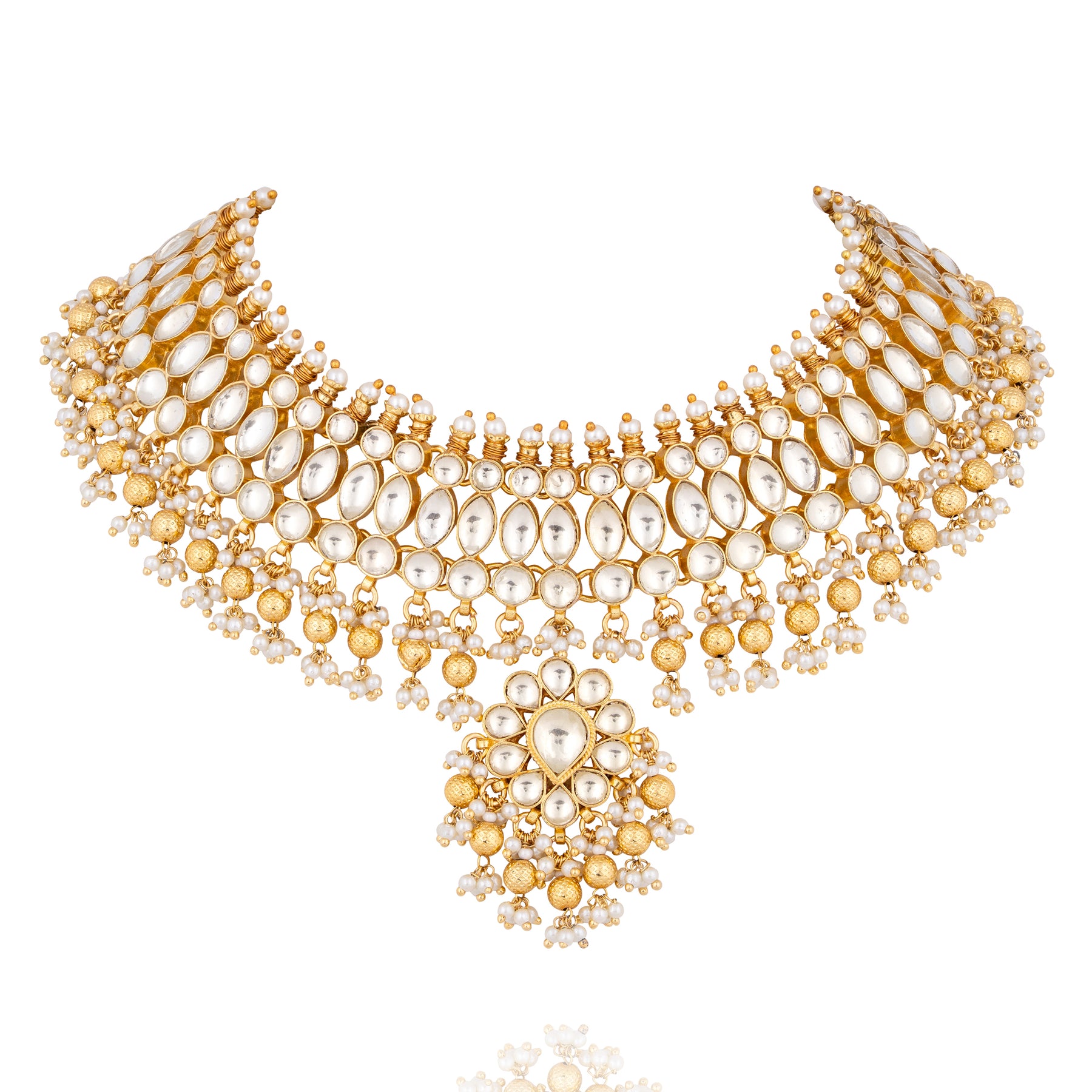 A masterpiece of regal allure, this polki kundan set captures the grandeur of royal heritage with its intricate detailing, luminous stones and delicate pearl clusters - designed to command admiration and elevate any bridal or festive look to majestic perfection.
