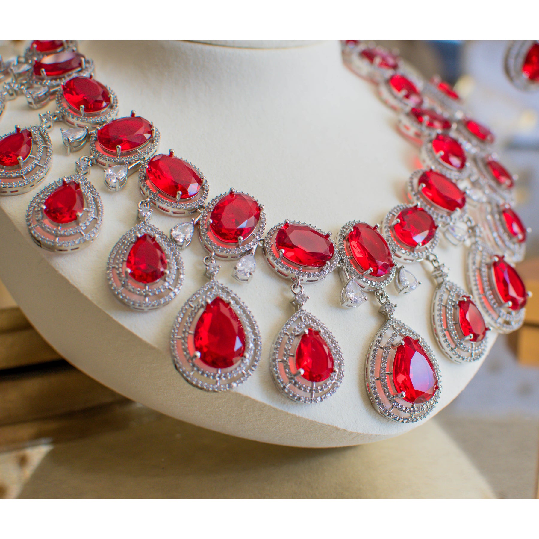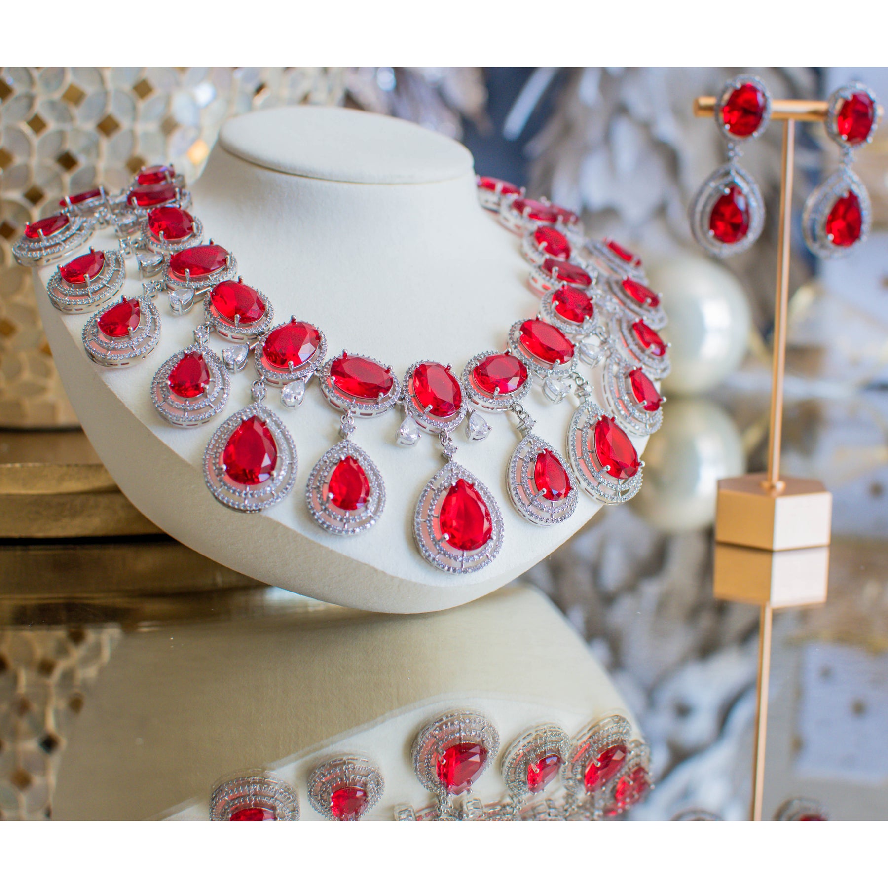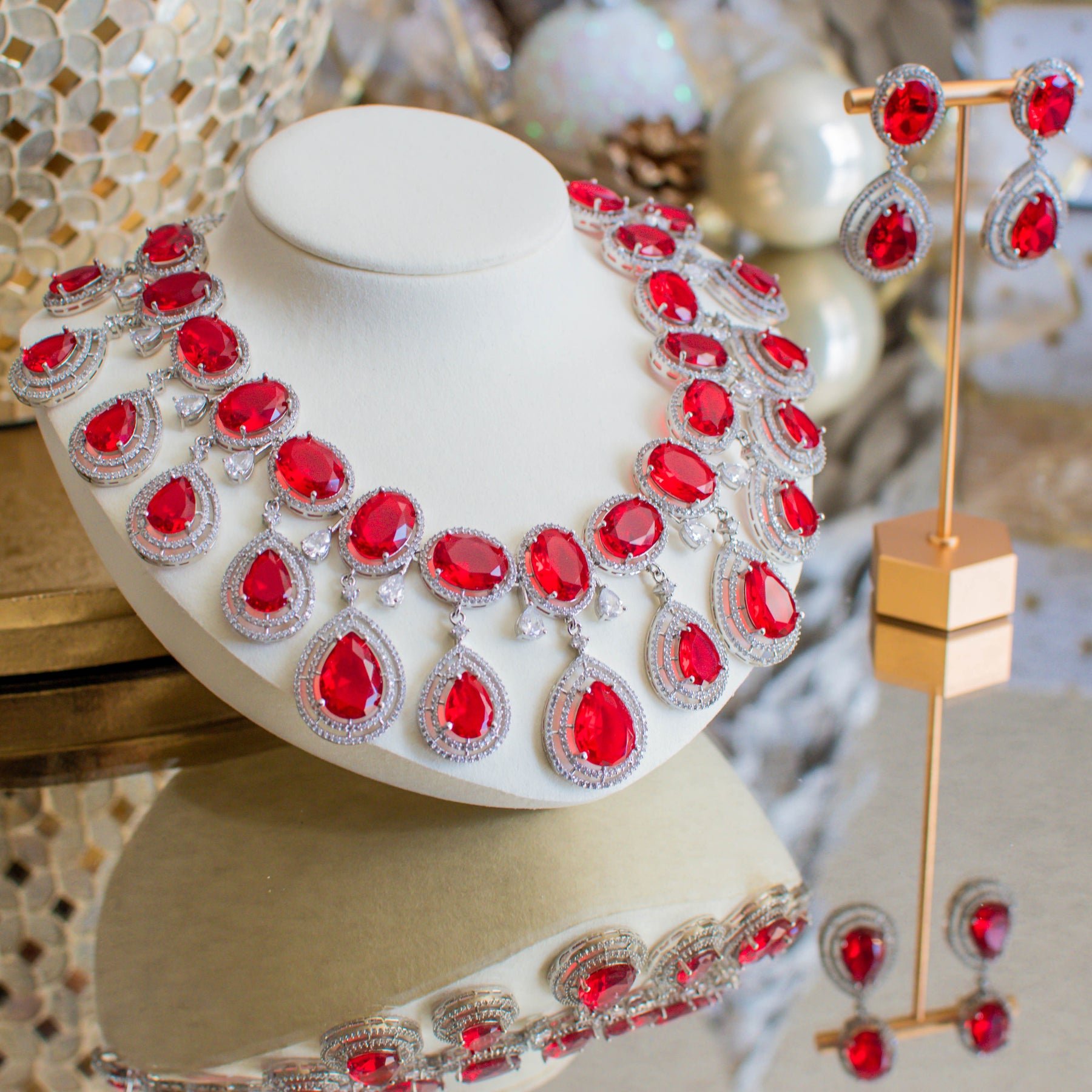 A masterpiece of opulence, this regal set glows with ruby stones framed in halos of fine brilliance.