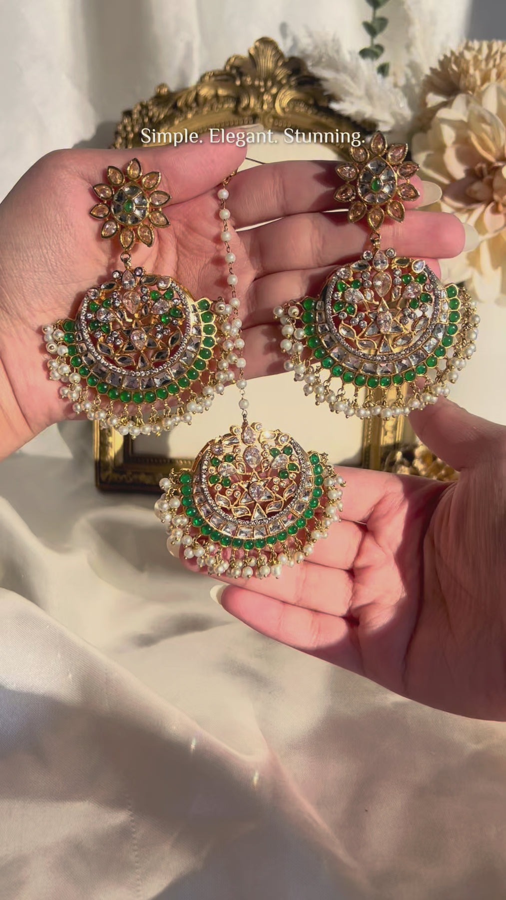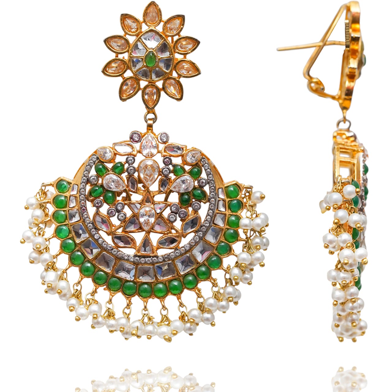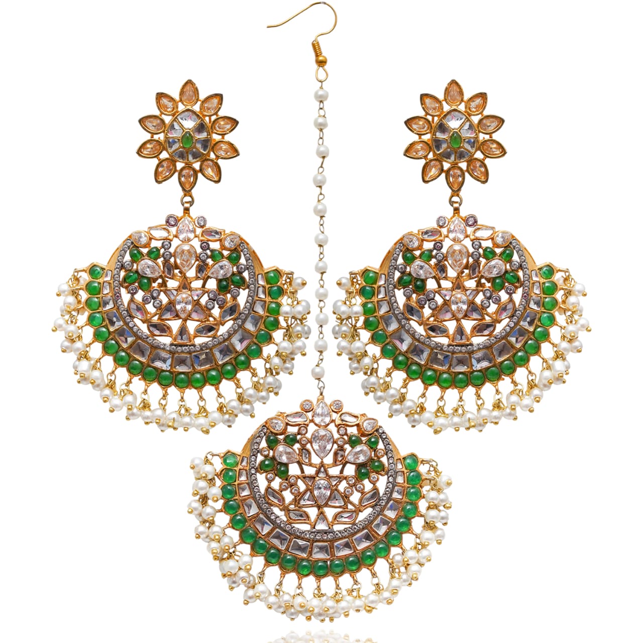 Pleasantly bright maang teekah and earrings set showcasing a perfect combination of beautiful CZ and emerald stones with dangling pearl moti. Approximate earrings length is 3". Approximate teekah motif length is 2" and width is 2.1".