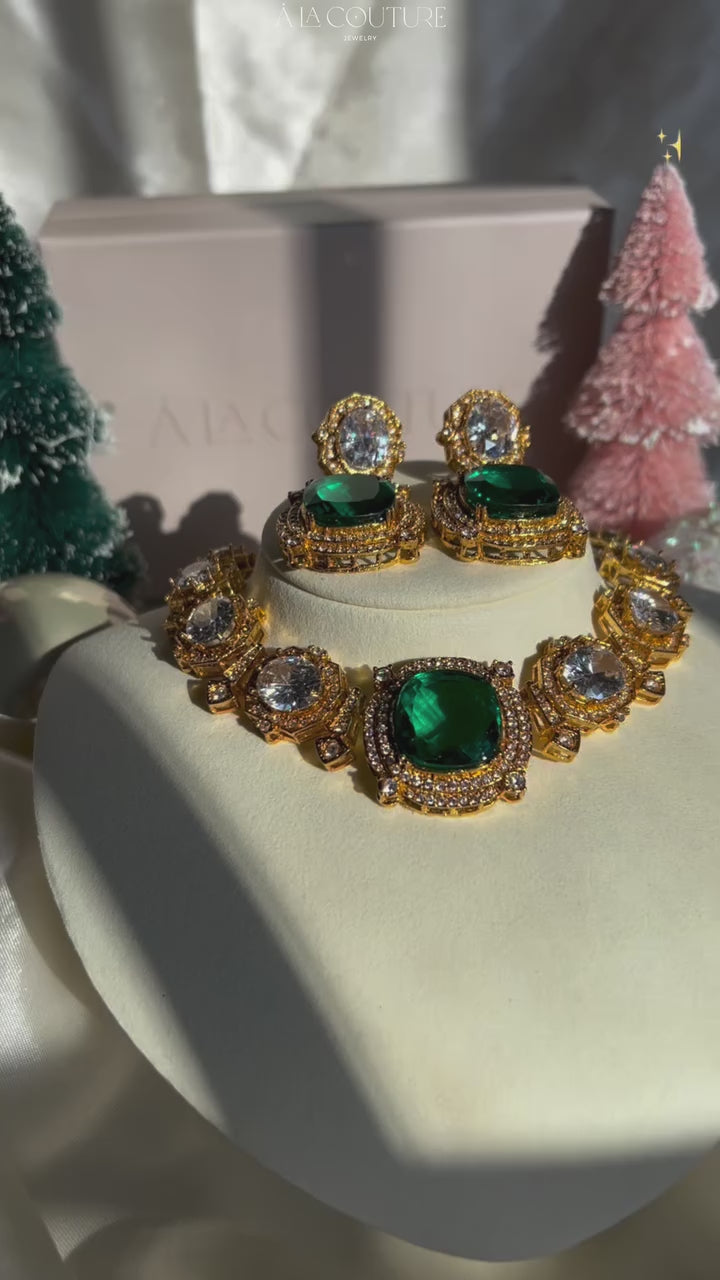 A regal creation adorned with luminous clear stones, CZ accents and majestic emerald stones, this set exudes opulence and timeless grandeur.