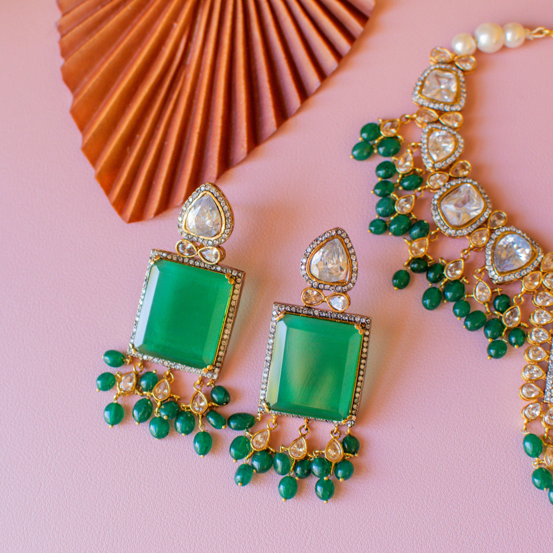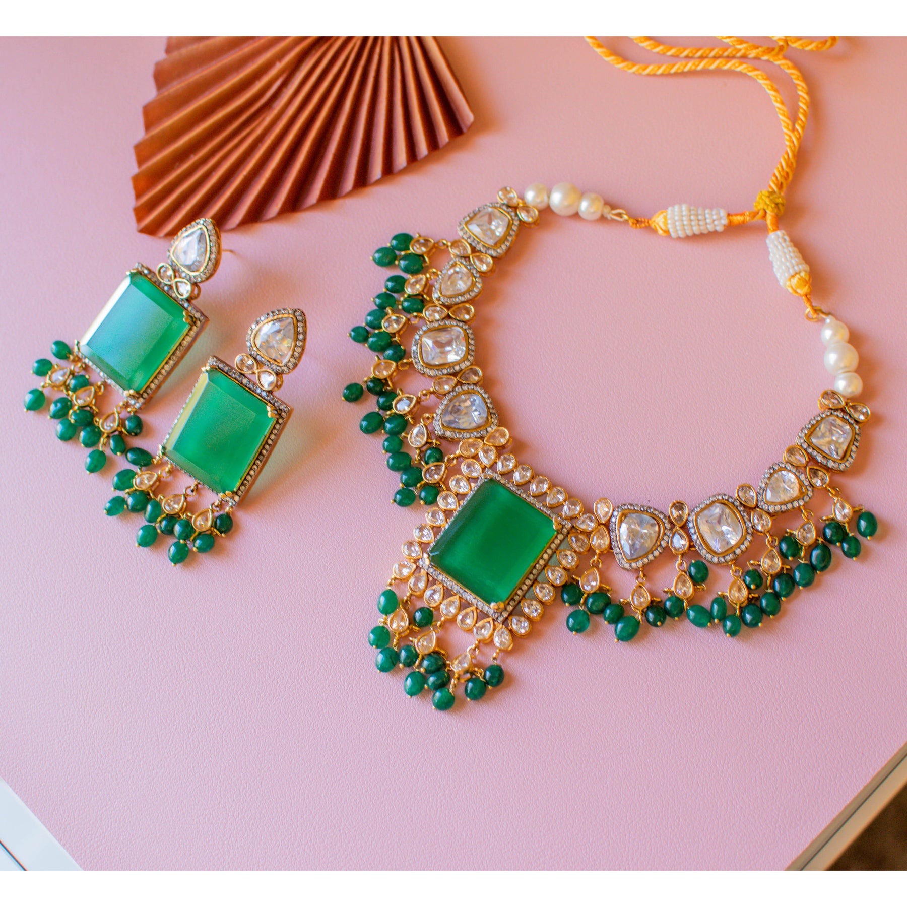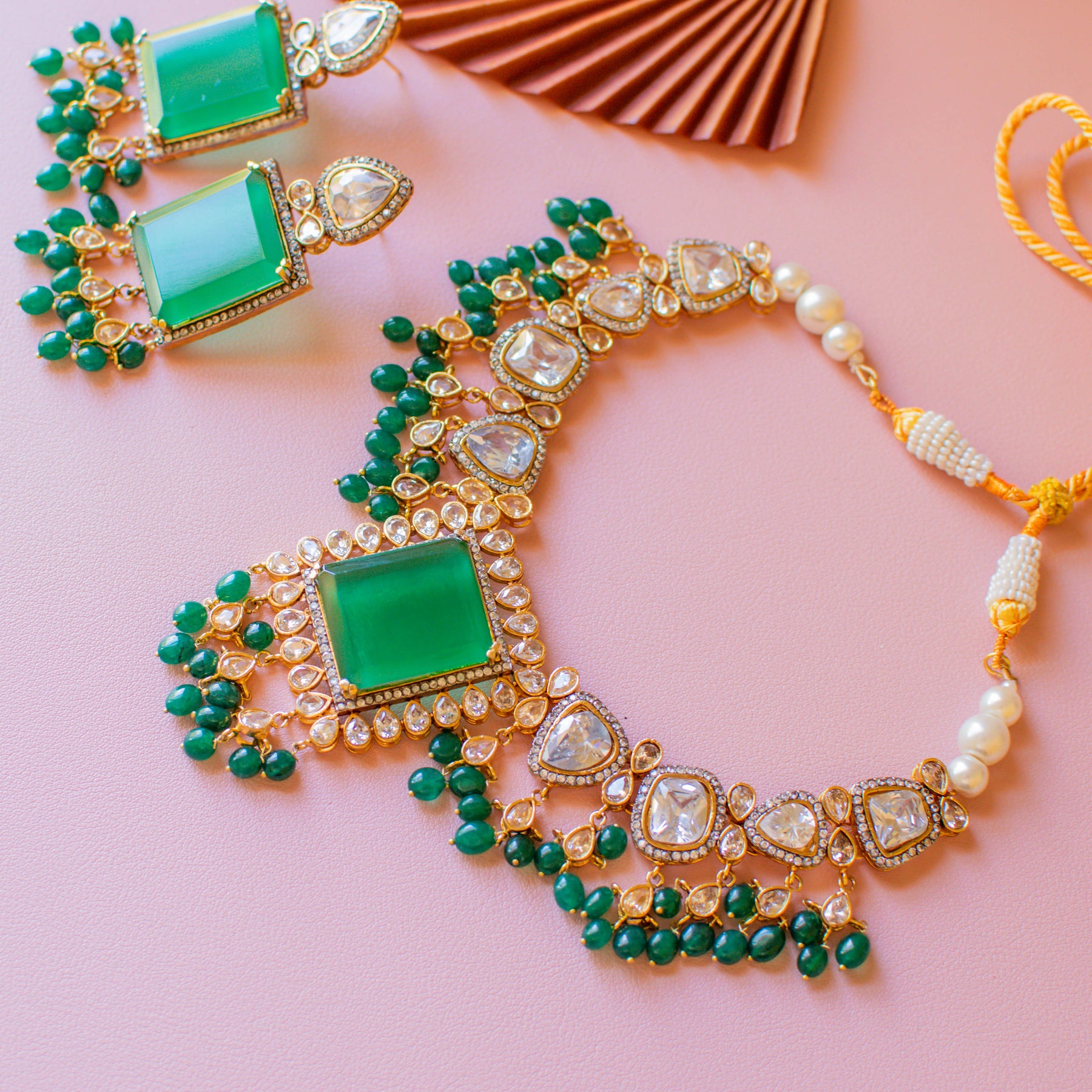 Behold an opulent masterpiece of regality and elegance, this lavish set is an epitome of luxury. Adorned with gleaming emerald stones encased in a meticulously crafted shimmering kundan stone border along with lush green drops and intricate detailing, exudes timeless charm and a royal allure.