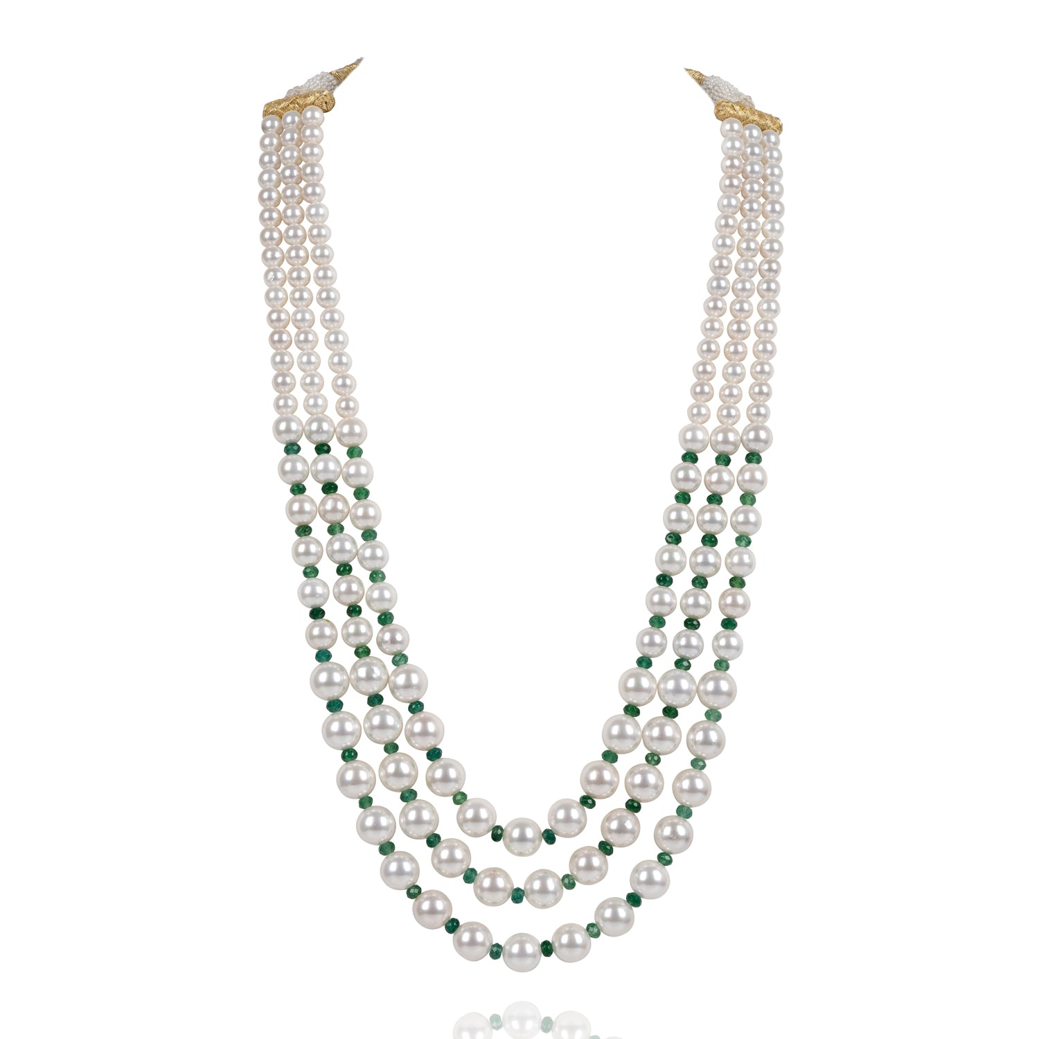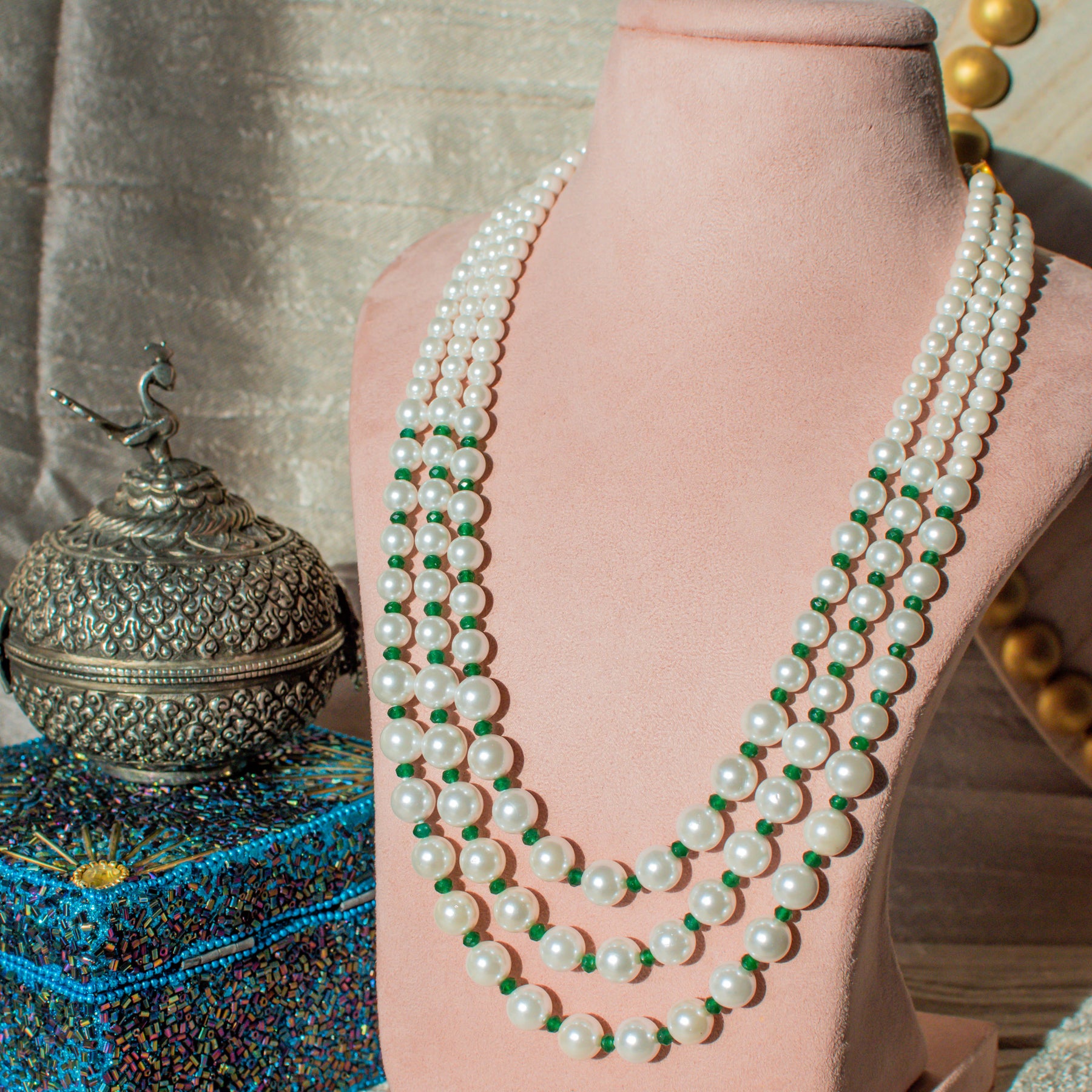 Classic three-layered pearl mala with refreshing emerald green motis. Approximate mala length is 9.5".