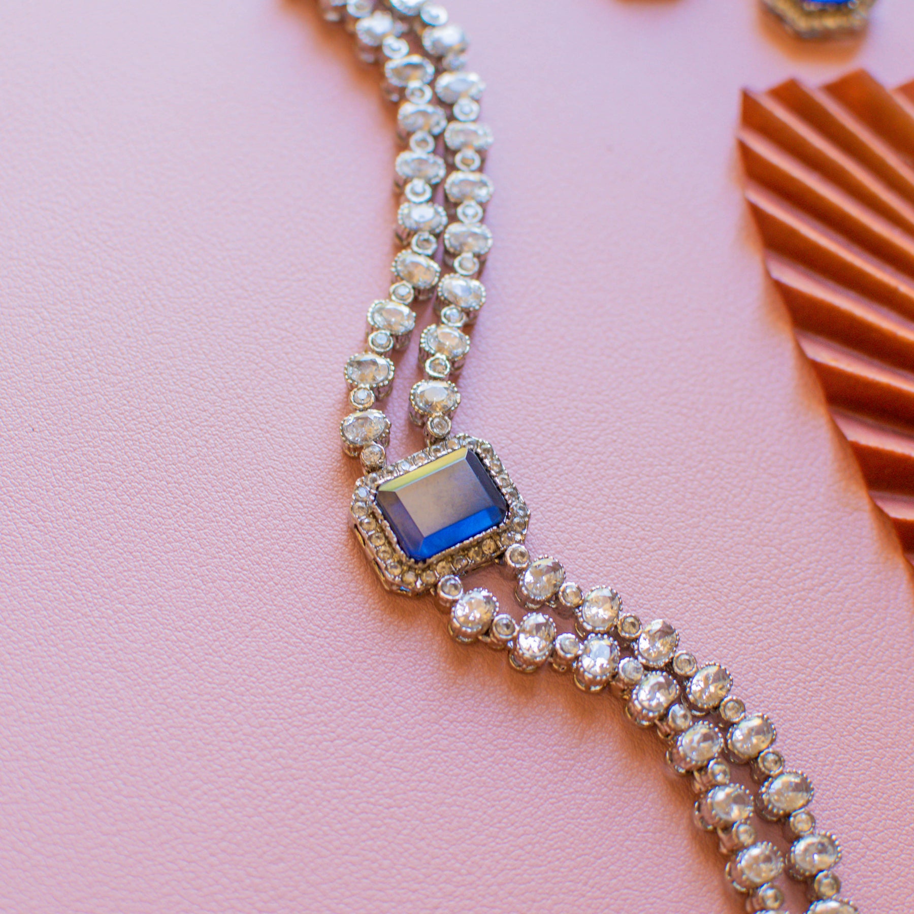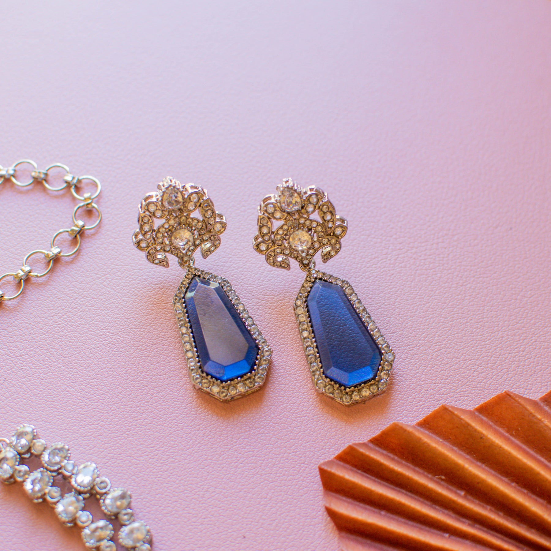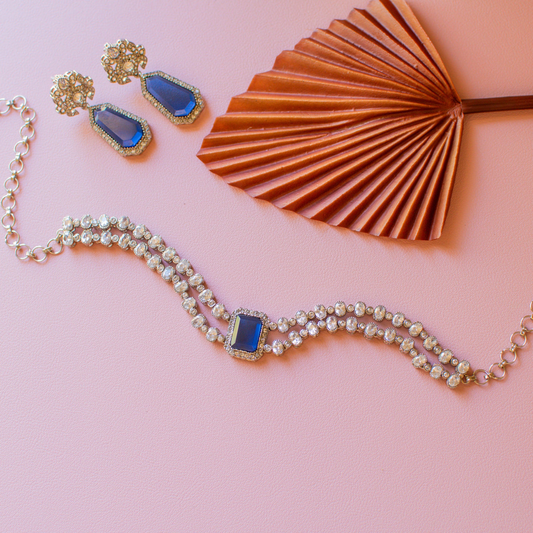 Beautiful jewelry set featuring royal blue stones framed in shimmering zircons.