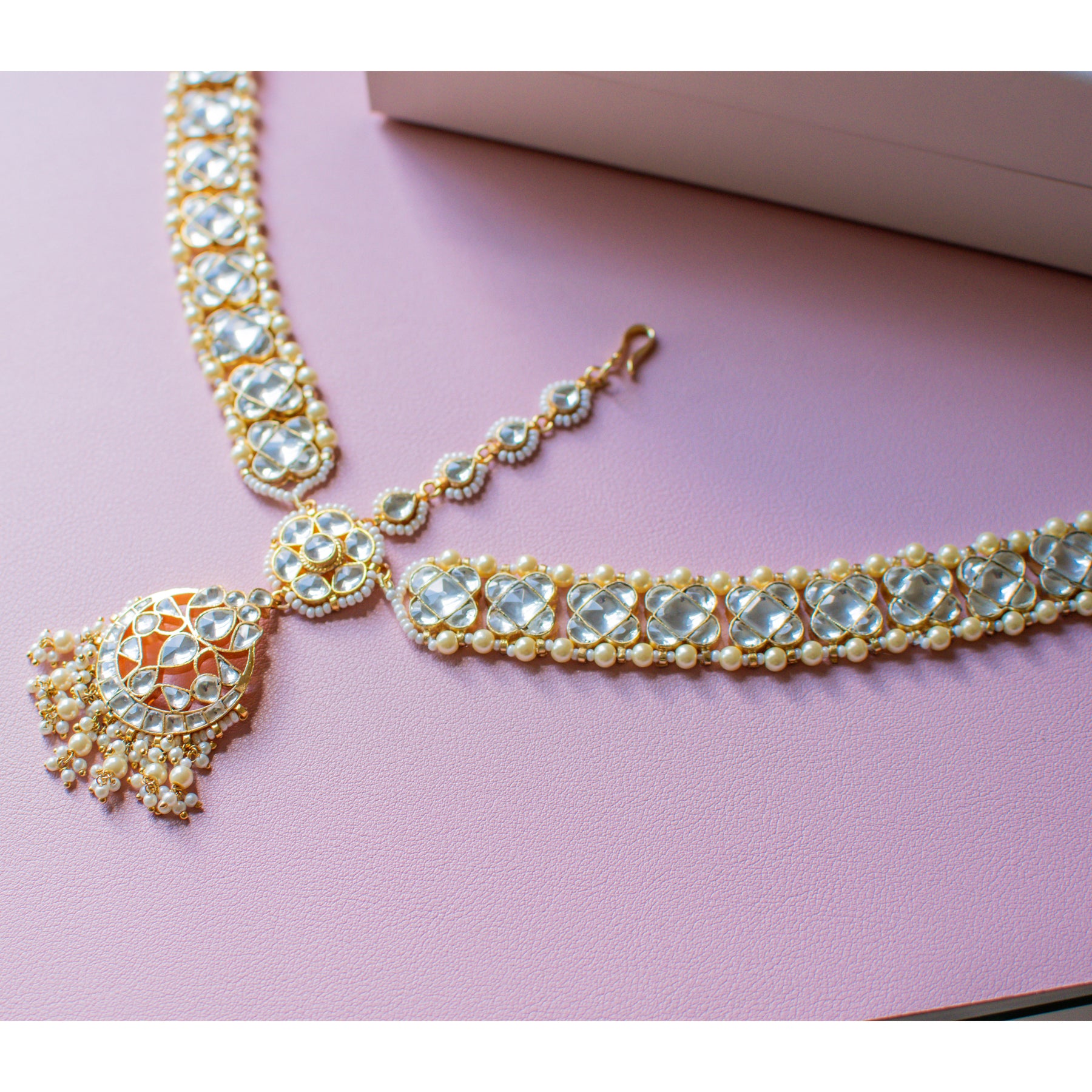 Beautiful headpiece laid out with kundan stones and pearl moti.
