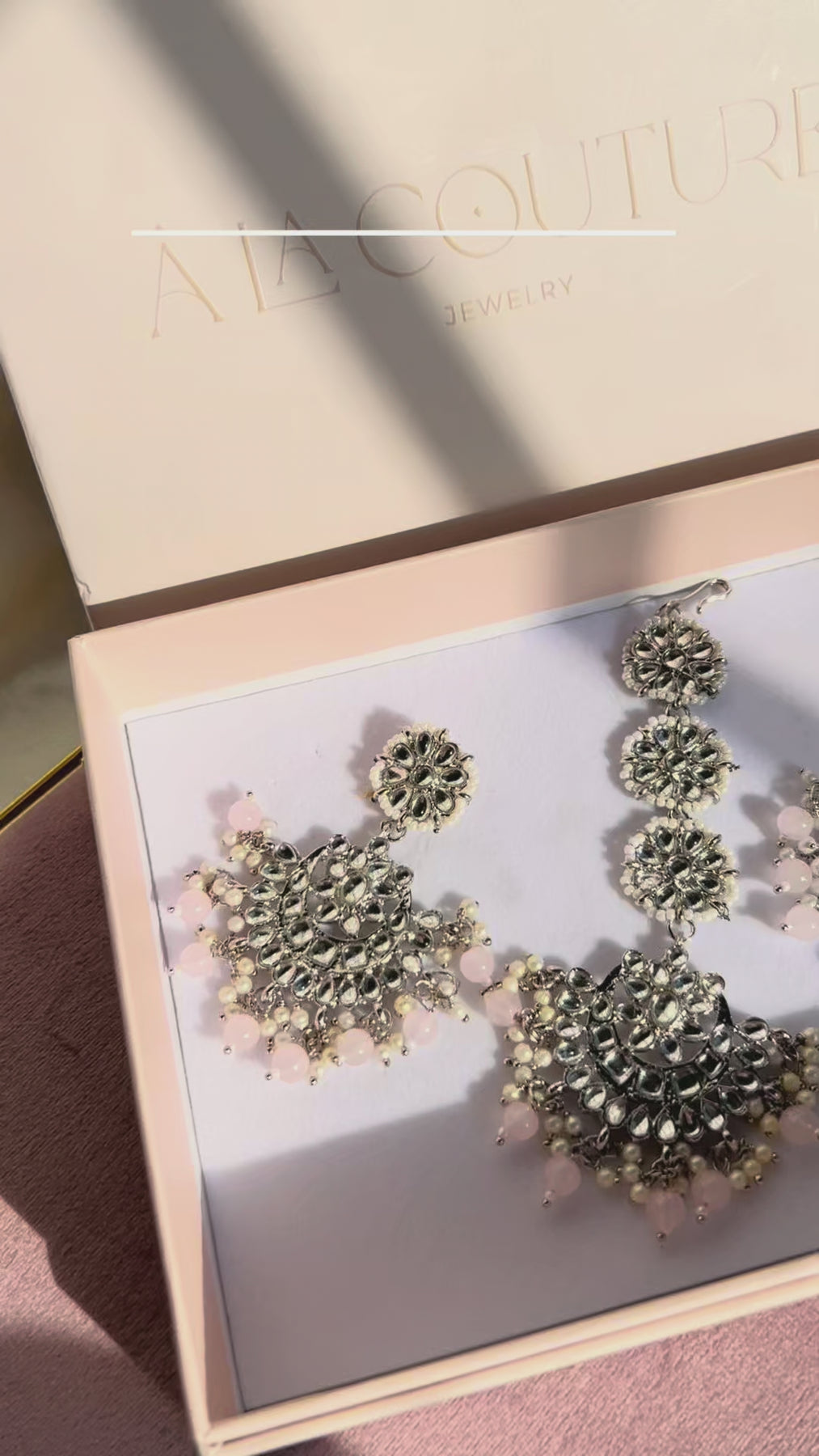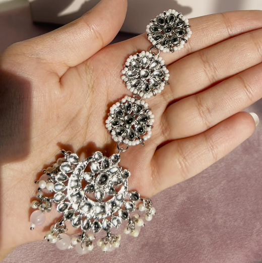 Radiating classic elegance, these earrings and maang teekah set is adorned with glistening stones and delicate pink beads.