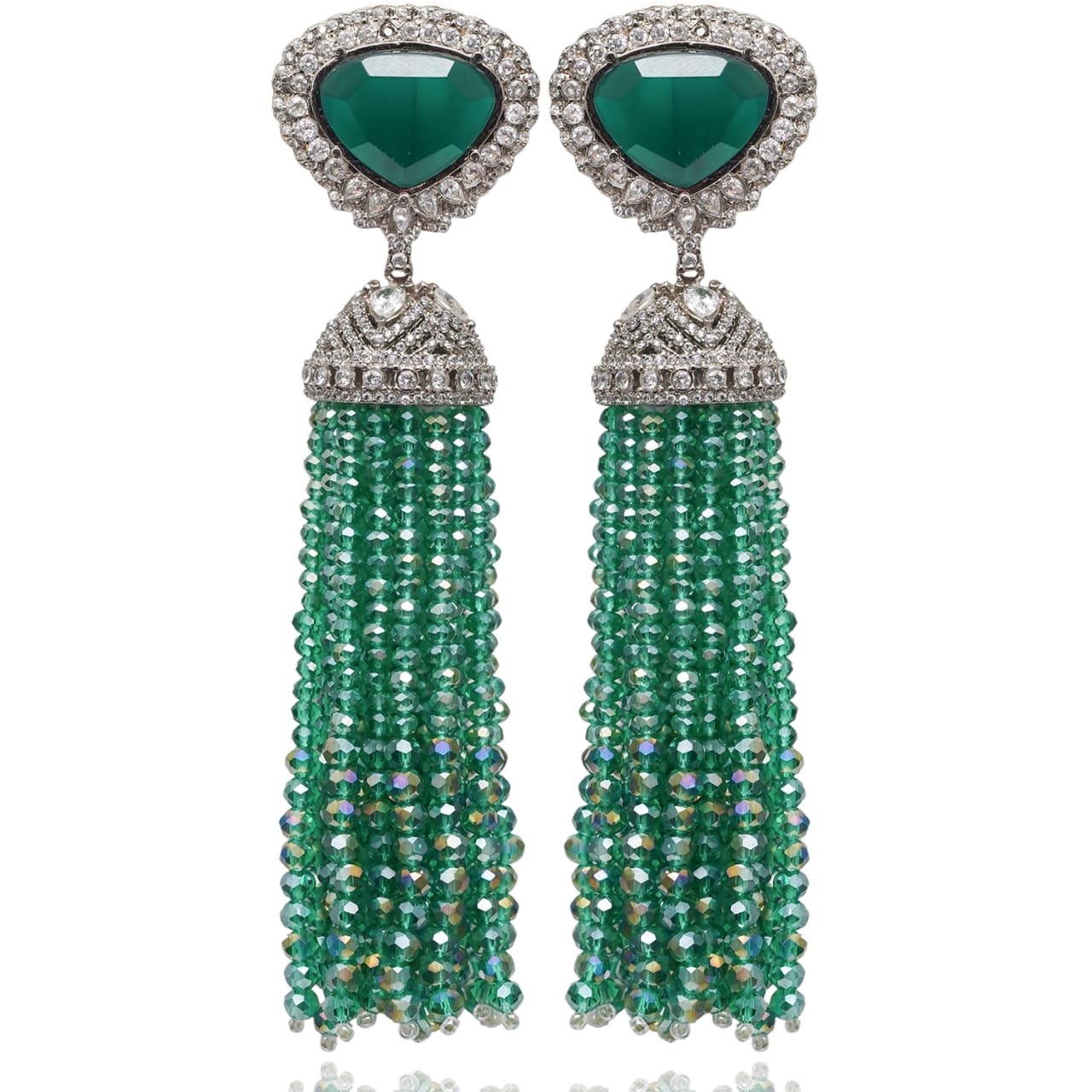 A statement in emerald and sparkle, this stunning pair features a bold green gemstone top with intricate crystal work and cascading beaded tassels. Approximate earrings length is 4.5".