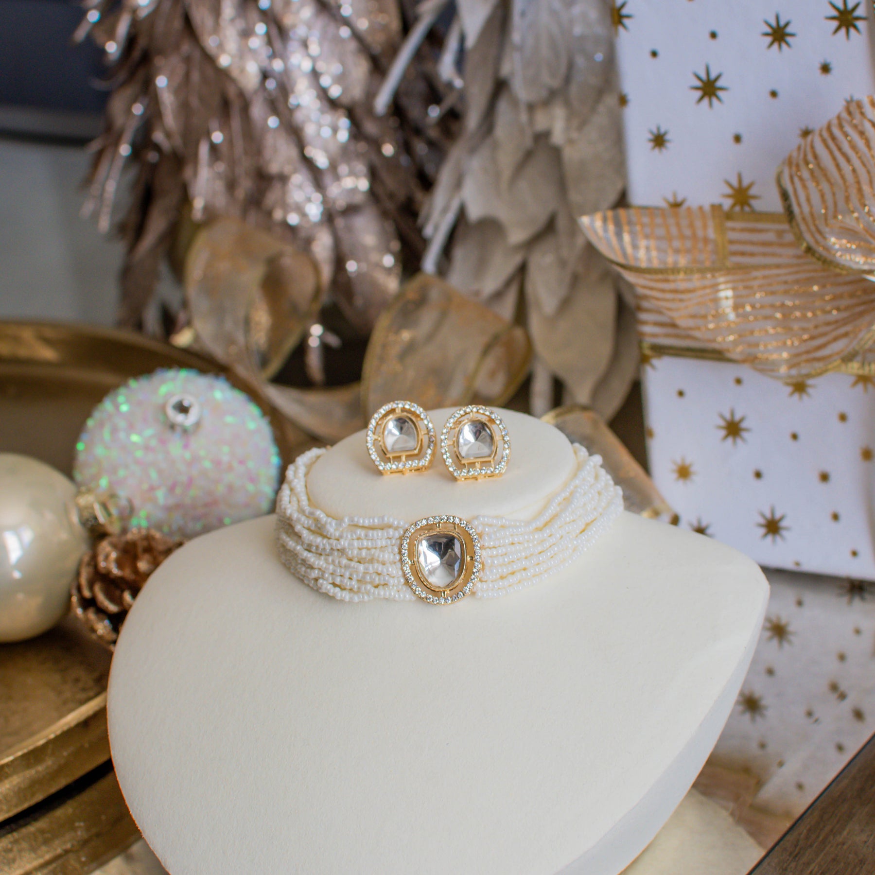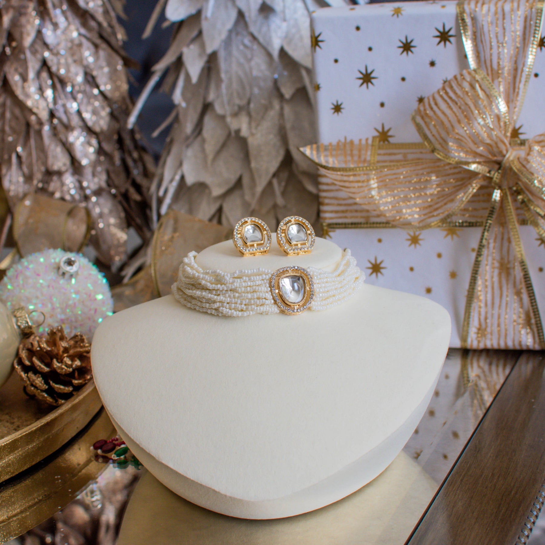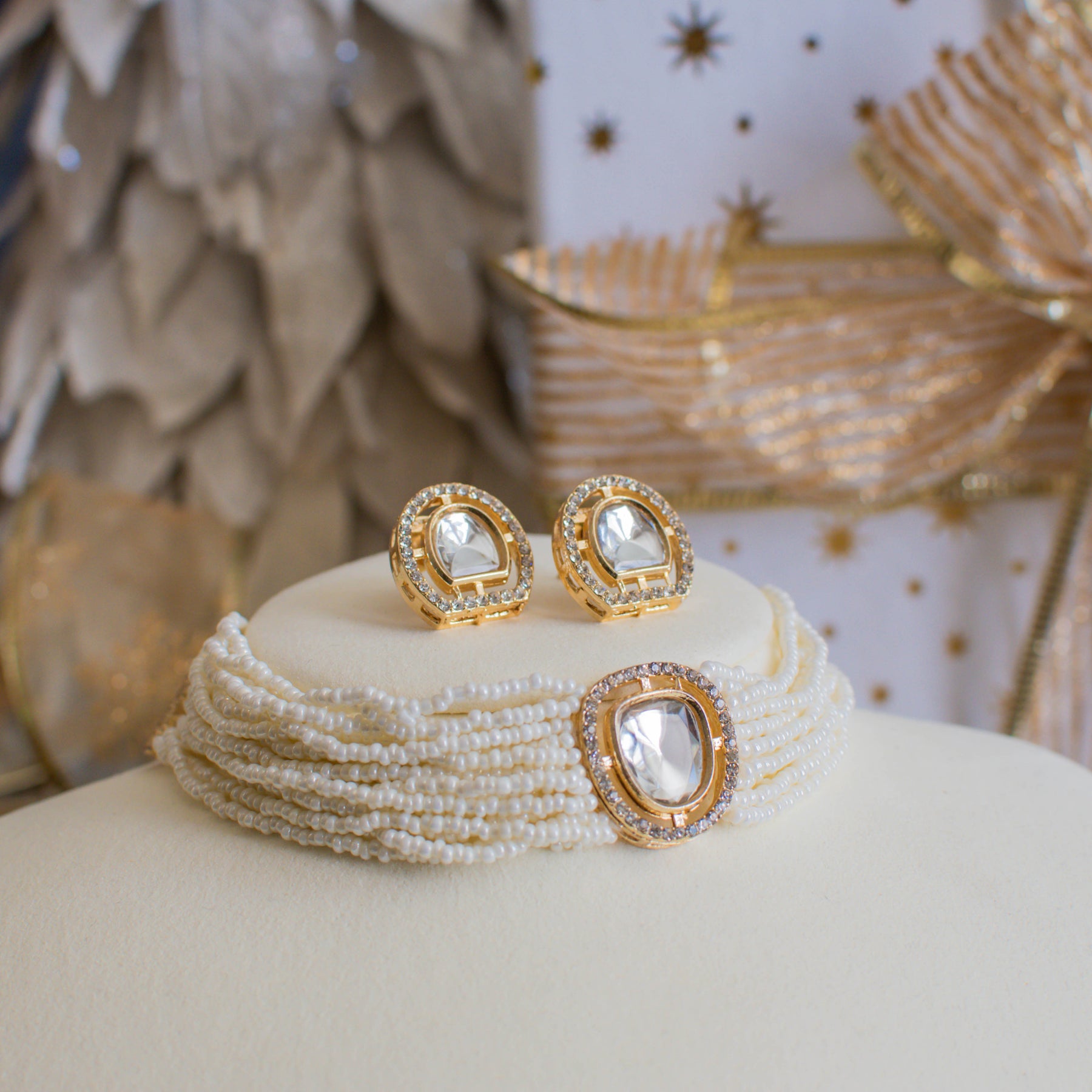An enchanting choker of cascading pearl moti layers, crowned with a bold kundan centerpiece and encircled by sparkling CZ stones.