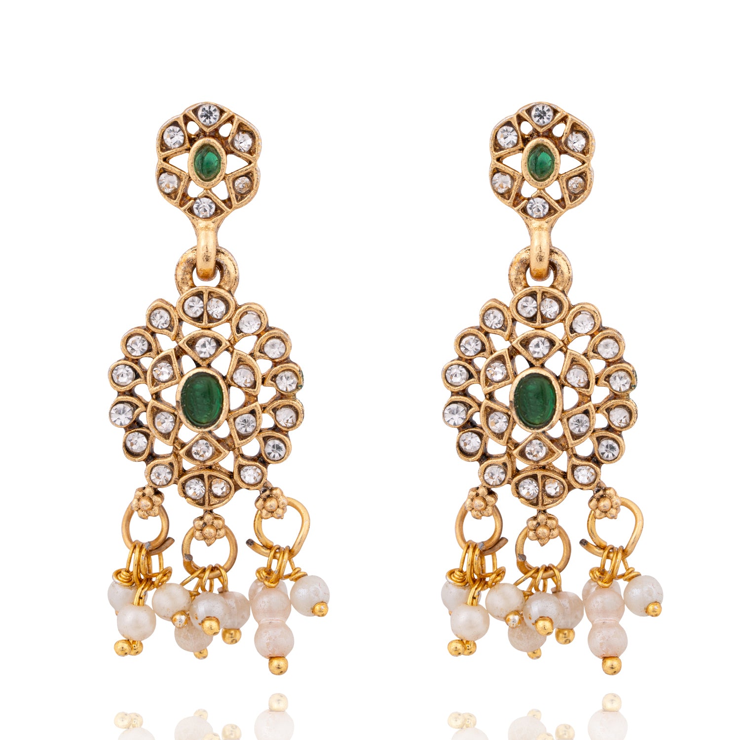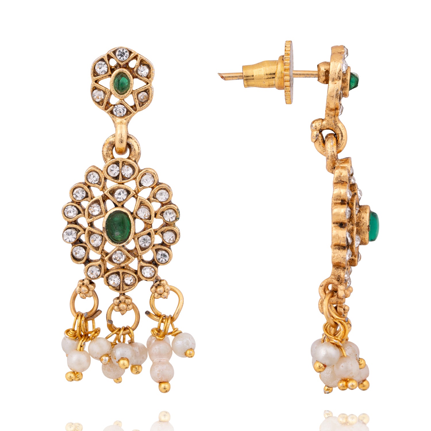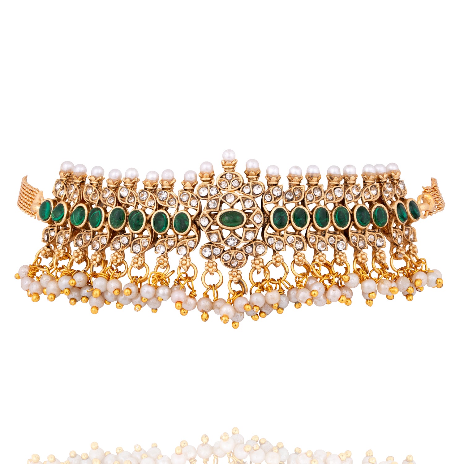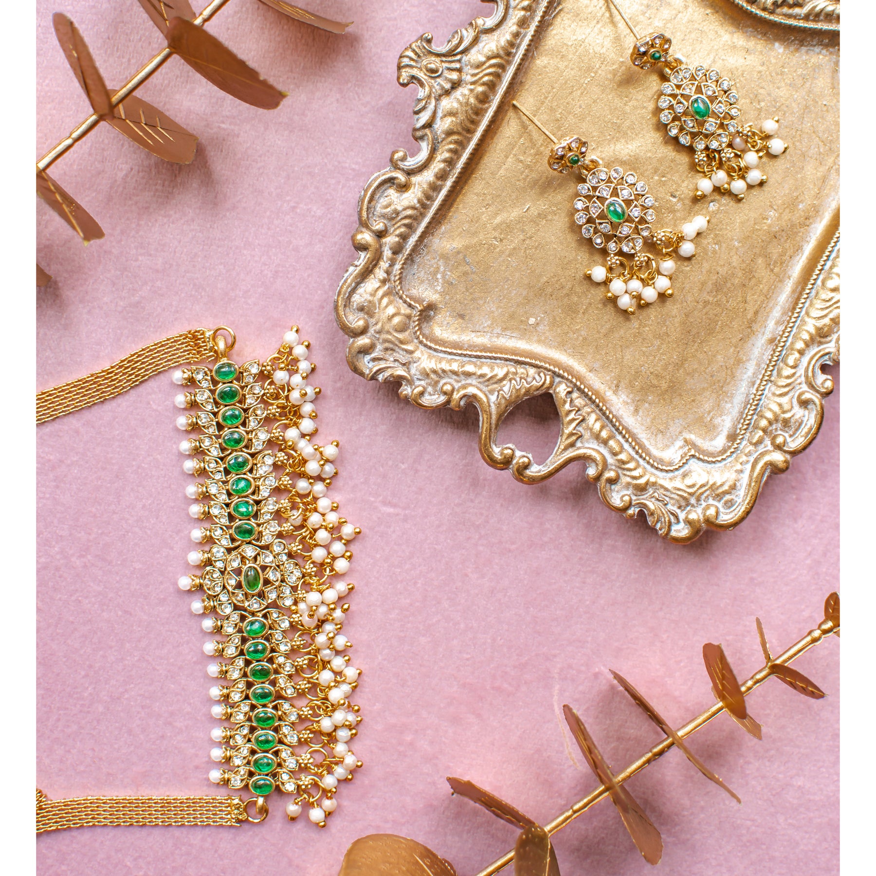 Designed with intricate detailing, dazzling white stones, elegant pearls, and rich green accents, this set blends traditional charm with a modern twist.