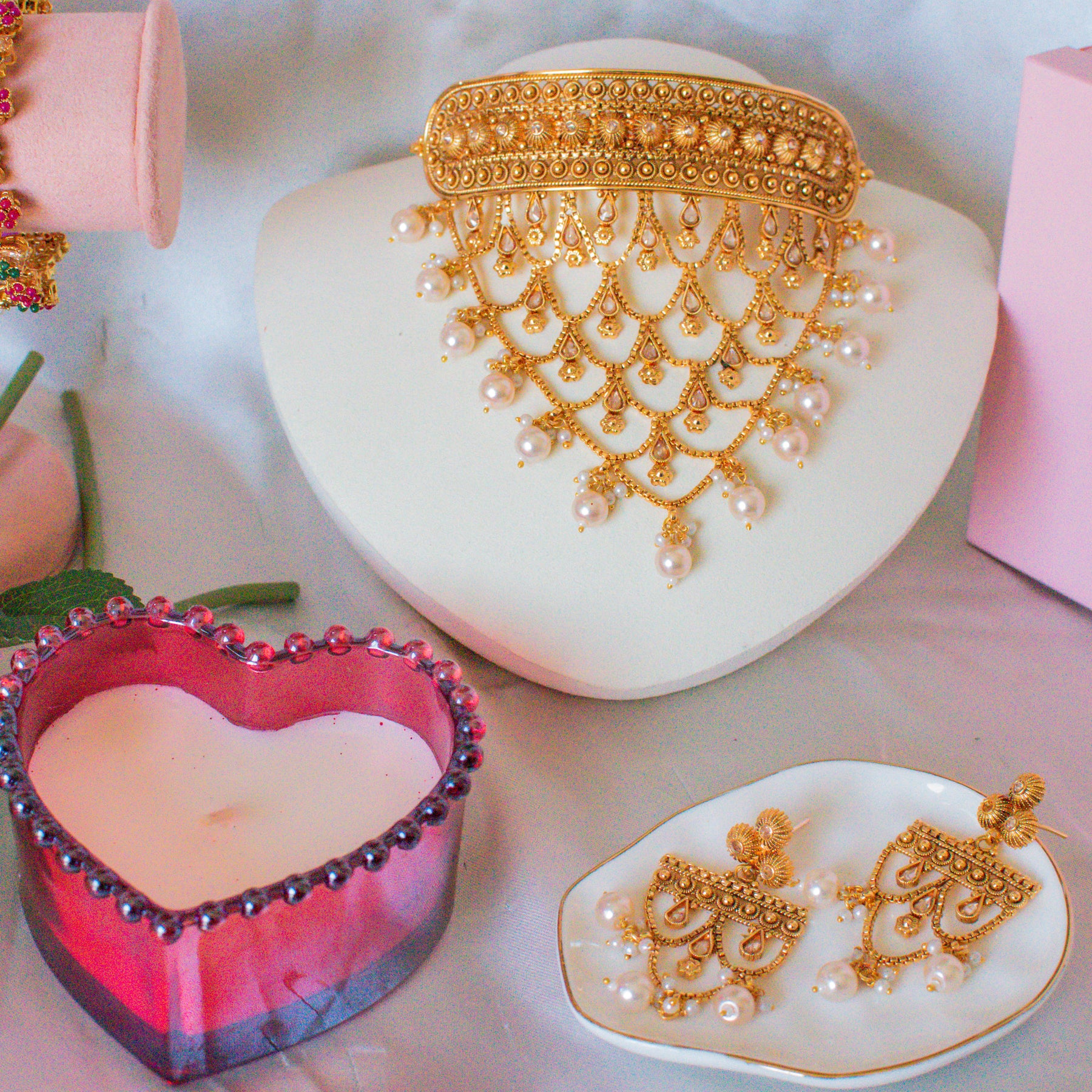 Elegant choker necklace created with multiple layers of teardrop champagne stones and an outline of pearl drops.