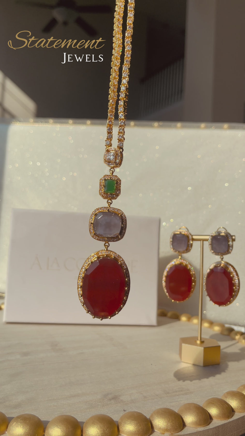 Drape yourself in royalty with this exquisite set, featuring dazzling ruby, sapphire and emerald stones.