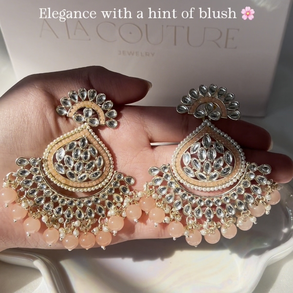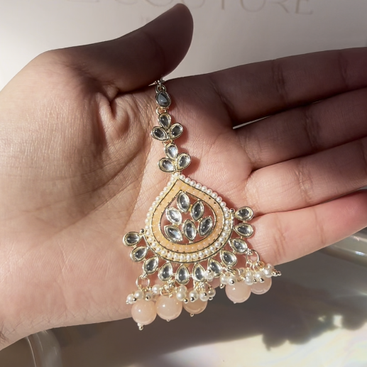 Radiating classic elegance, these earrings and maang teekah set is adorned with glistening kundan and delicate peach beads. Approximate earrings length is 3".