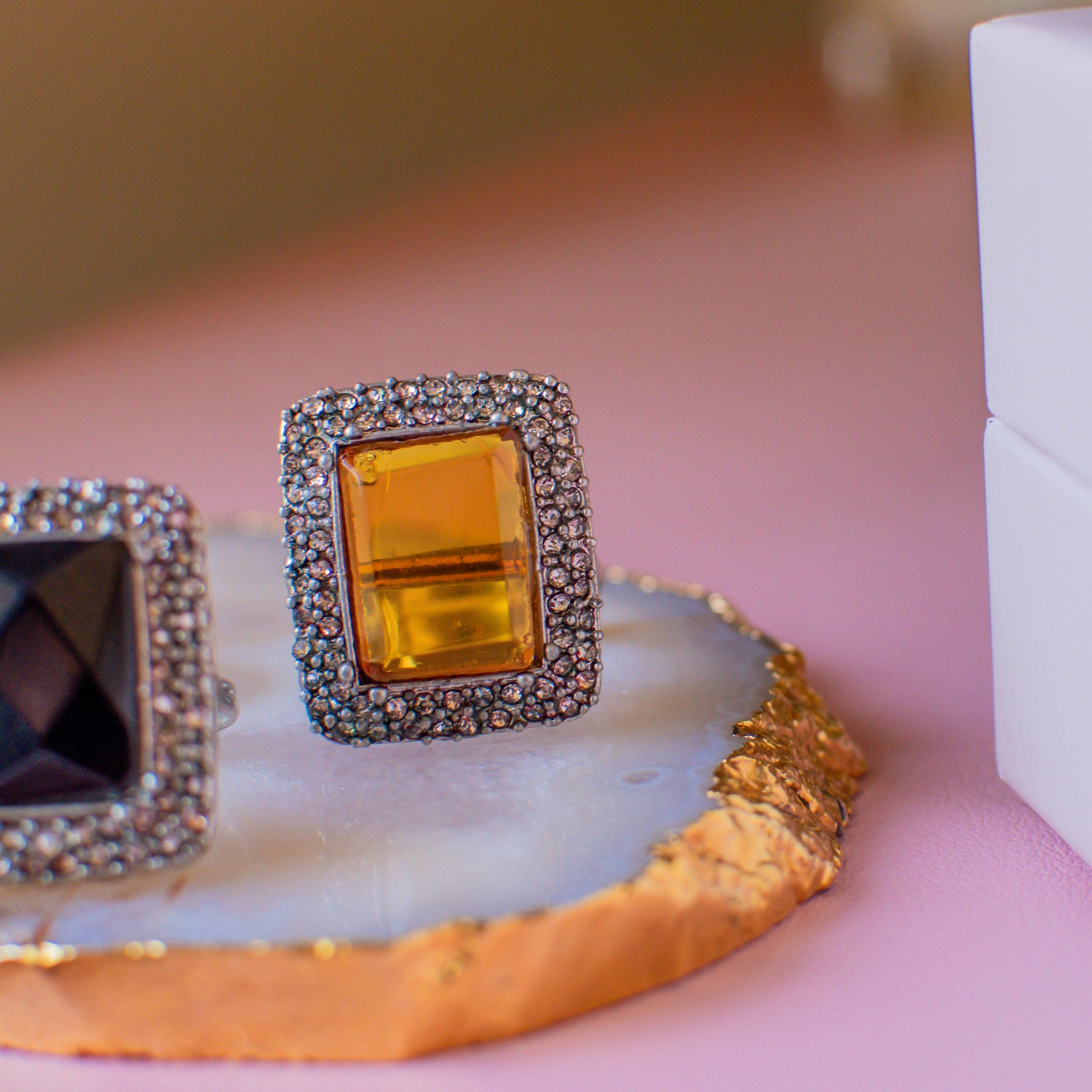 Regal statement ring adorned with beautiful stones and delicate pearl accents. The ring is adjustable for easy wearing.
