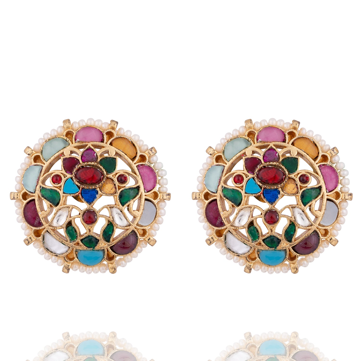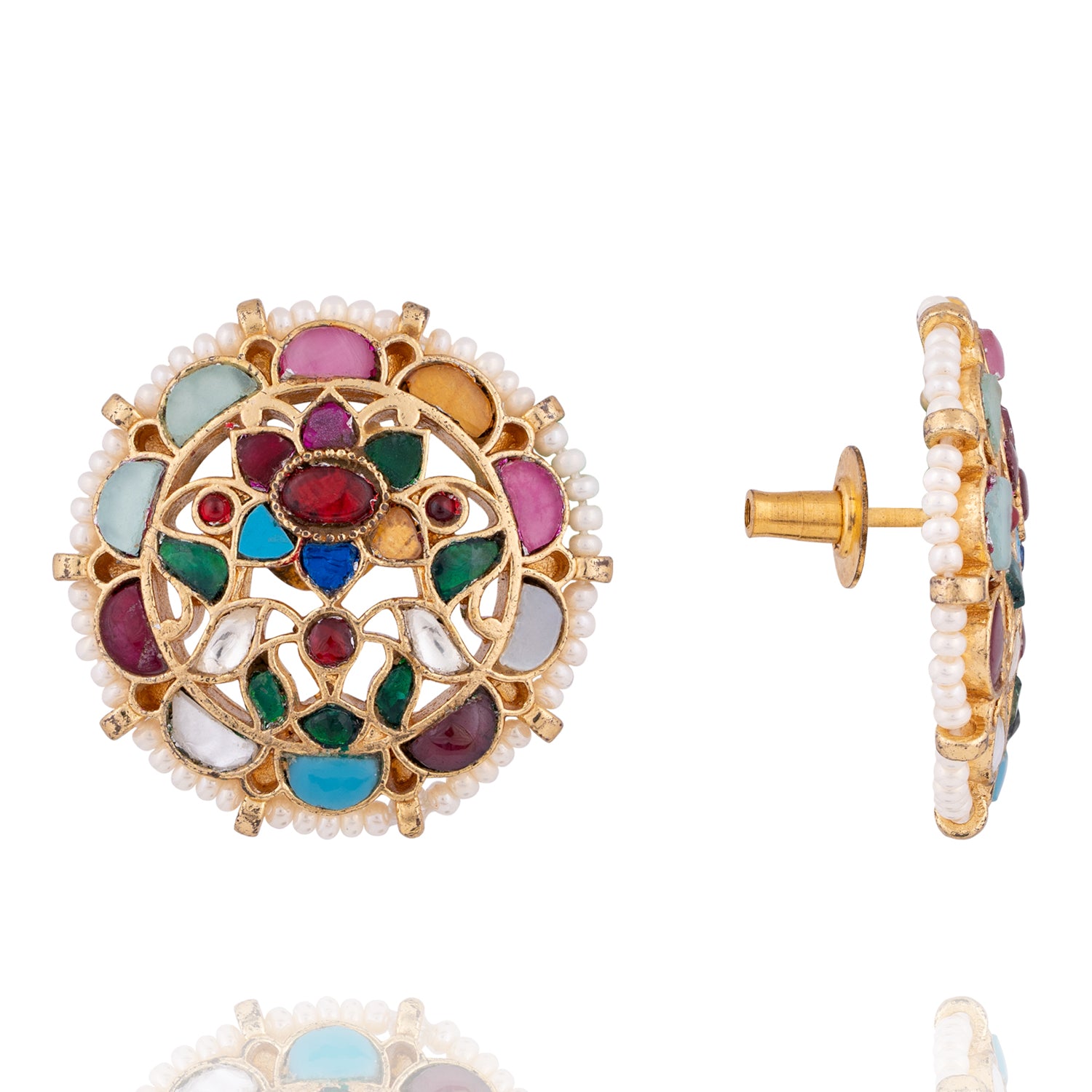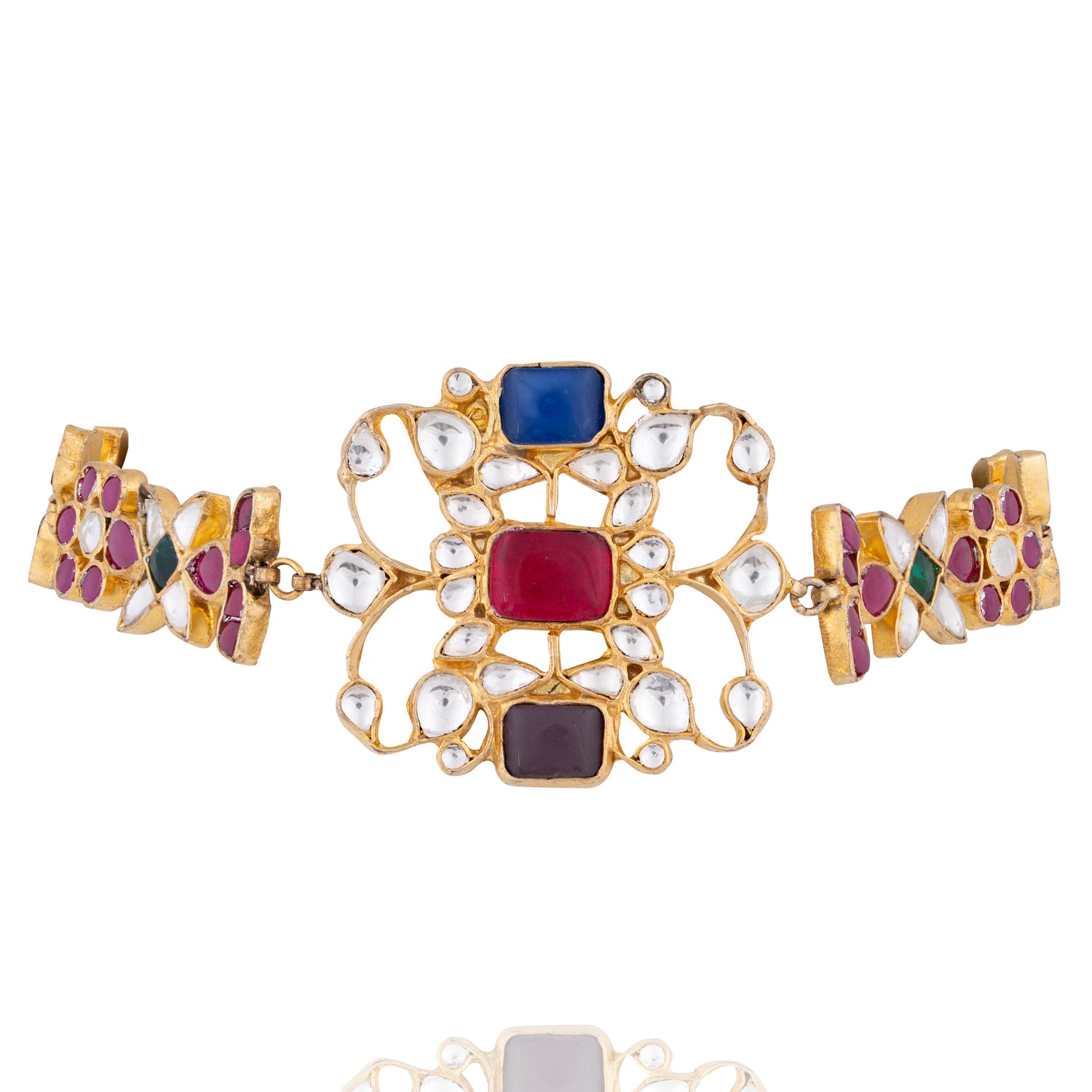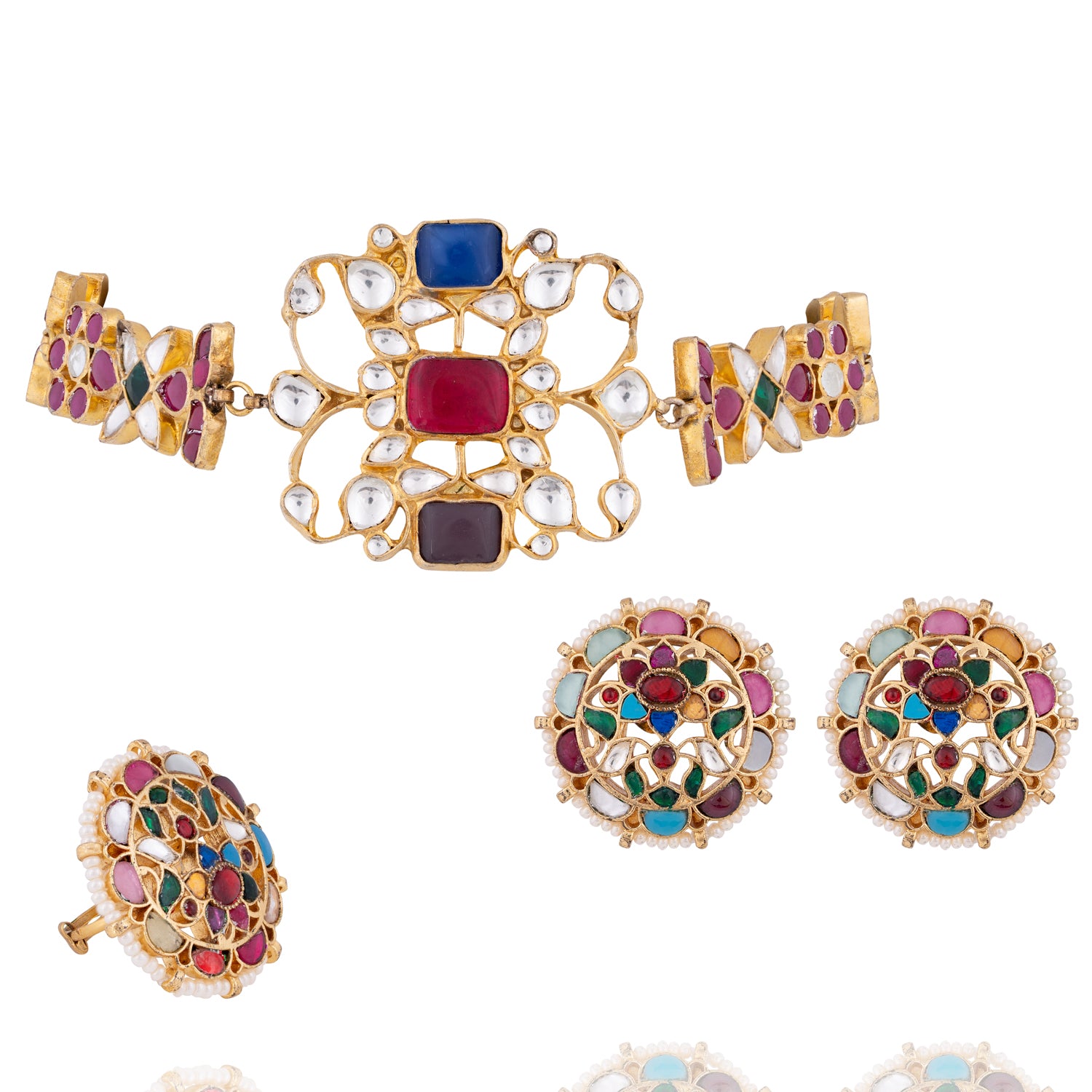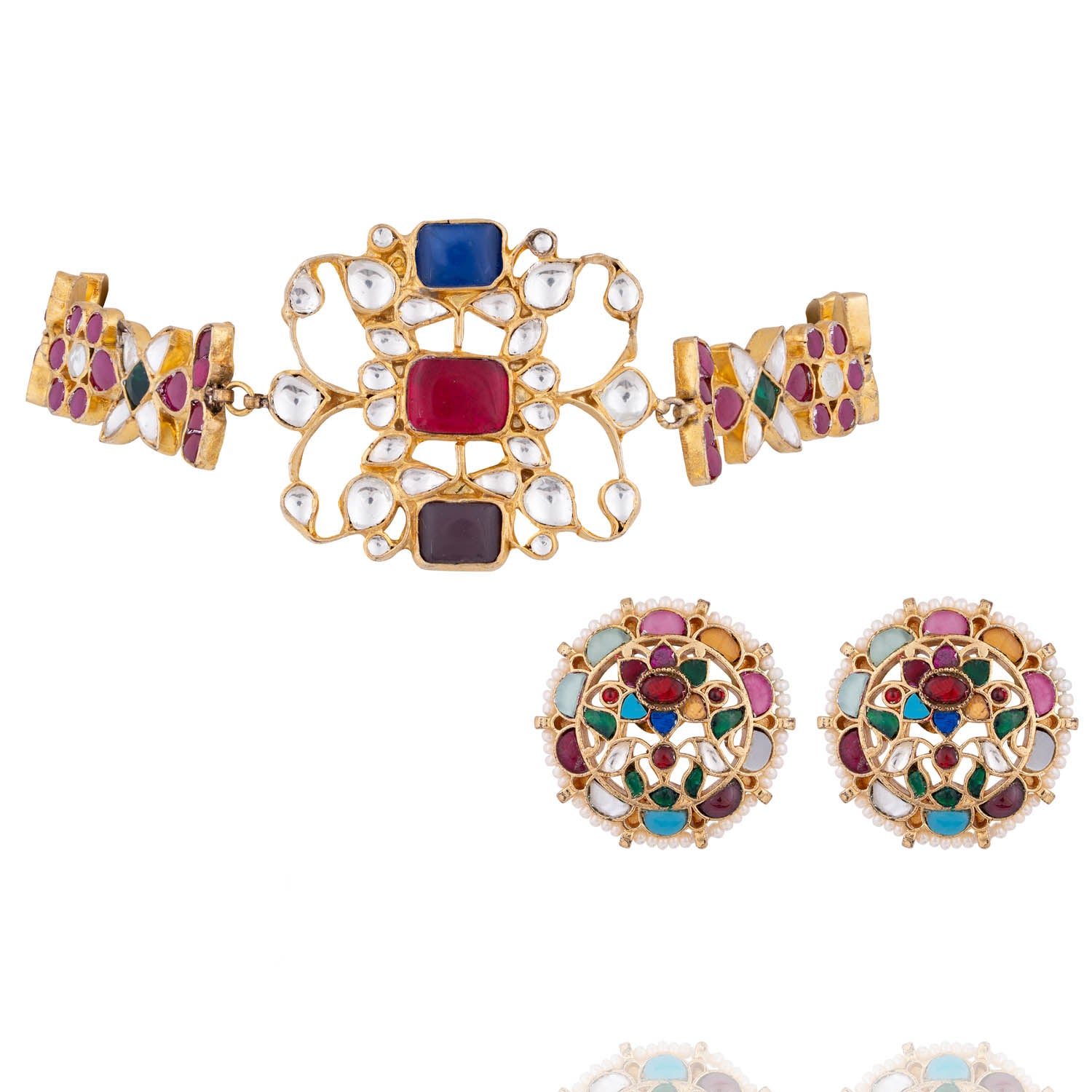 A vibrant choker set featuring multicolored stones, delicate pearls, and intricate detailing.