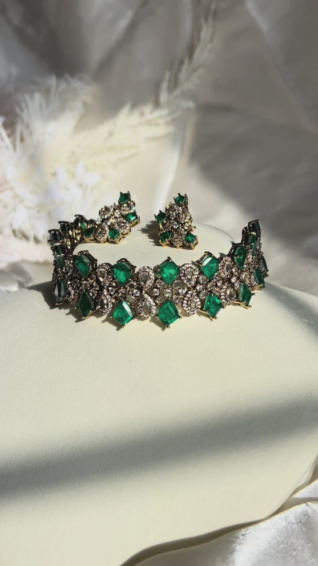 Dazzle in timeless sophistication with this exquisite CZ and emerald choker set encrusted with brilliantly cut stones, capturing the essence of modern luxury and effortless glamour.