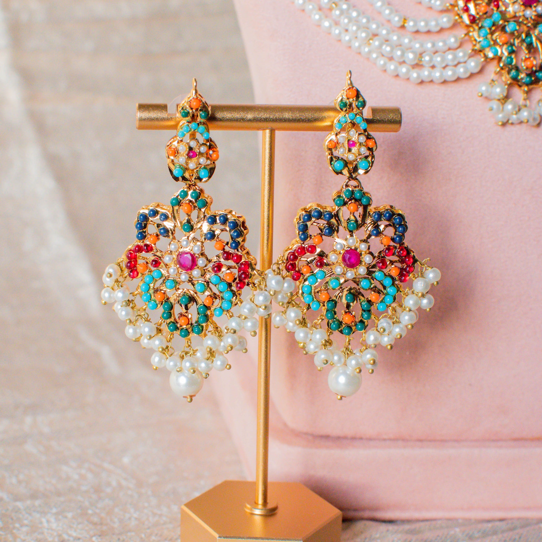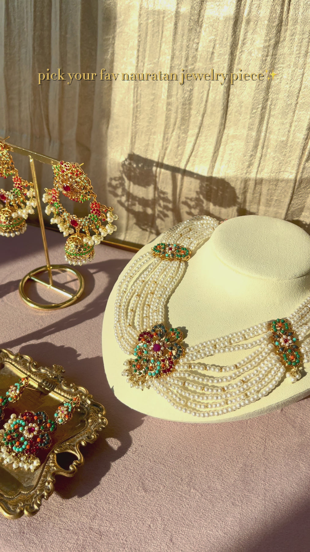 Indulge in timeless opulence with this exquisite handcrafted jewelry set, a symphony of luminous pearls, intricate gold filigree, and delicate nauratan accenting beads.