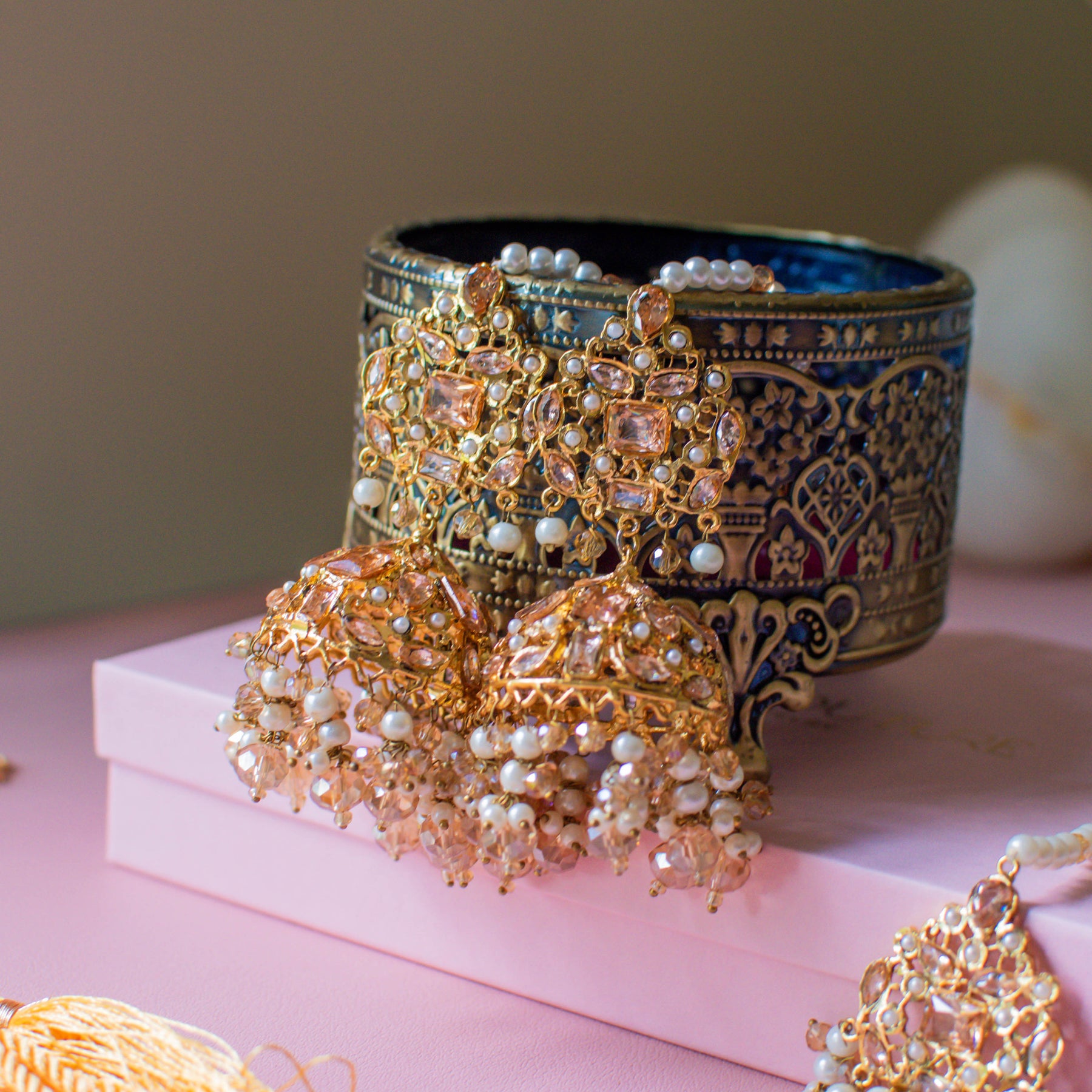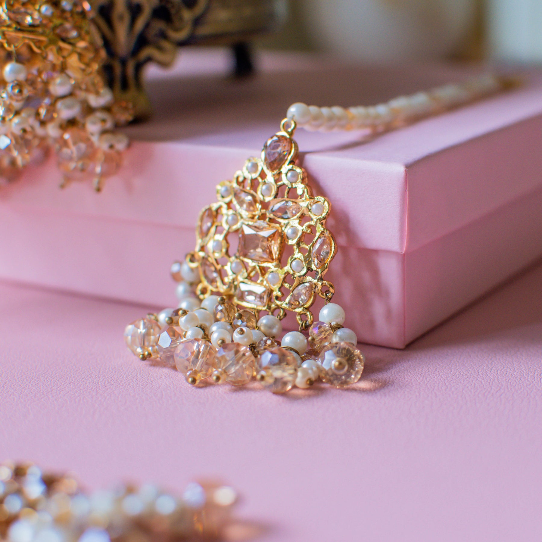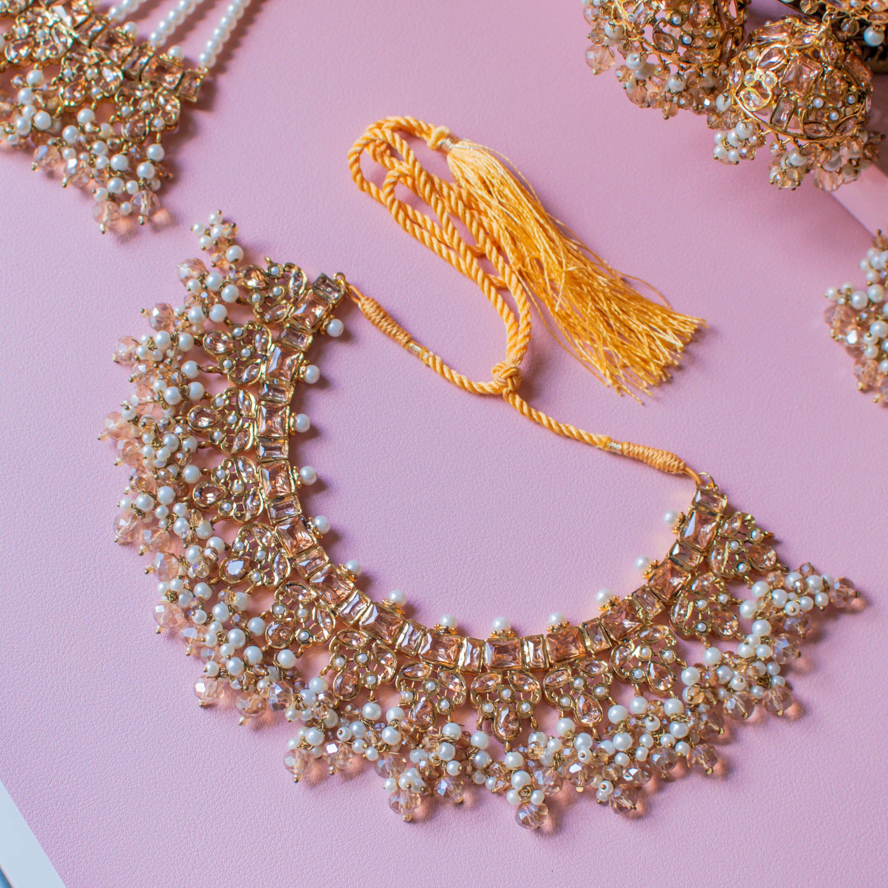 Elevate your celebration style with this stunning set crafted in champagne stones and soft bead accents.