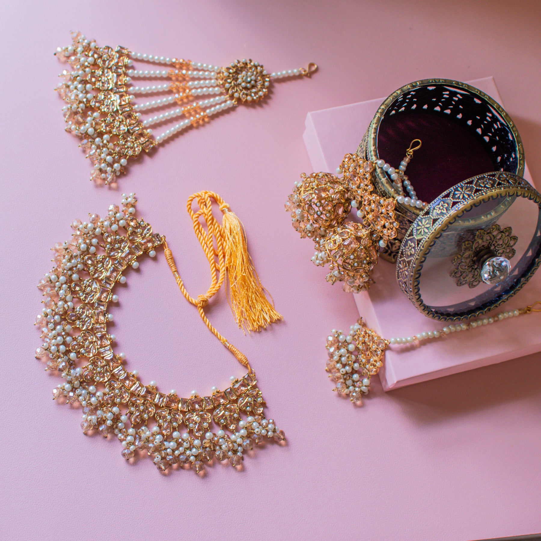 The set includes a necklace, a maang teekah, a jhoomar/passa and a pair of earrings. Approximate earrings length is 3".