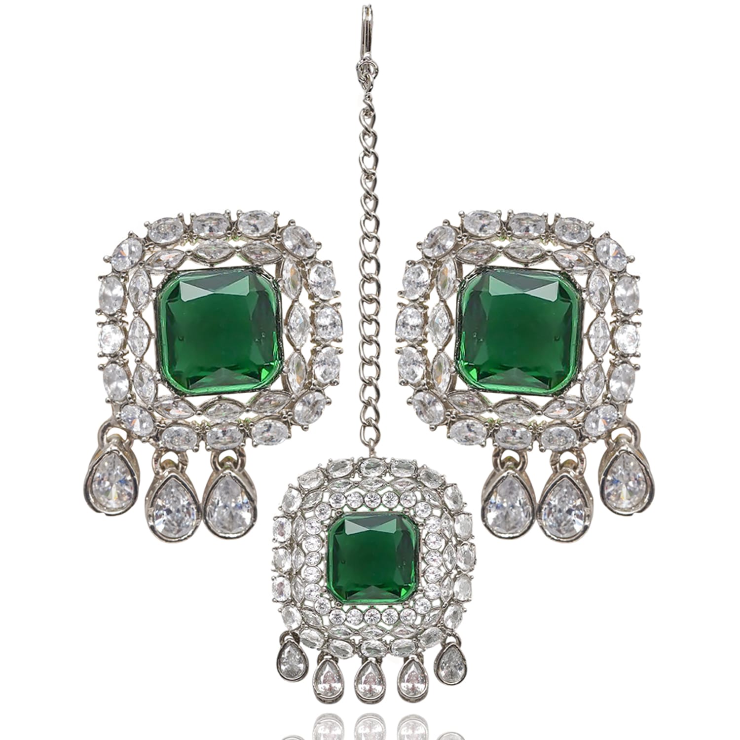 The set includes a necklace, a maang teekah and a pair of diamond shape stud earrings. Approximate earrings length is 1".