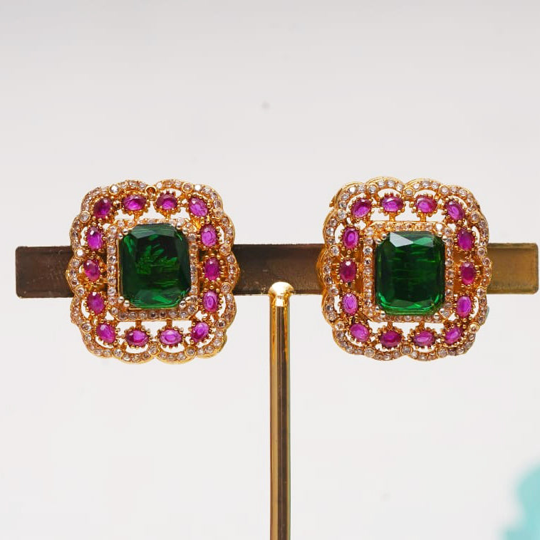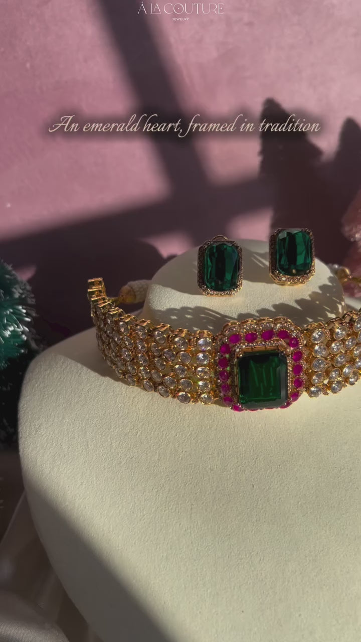A vision of regal splendor, this breathtaking choker set dazzles with rows of lustrous clear stones, cascading layers, and a magnificent emerald centerpiece framed in rubies.