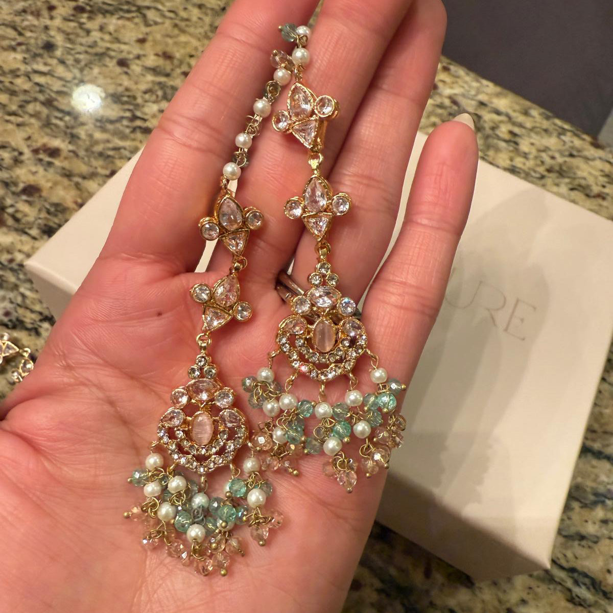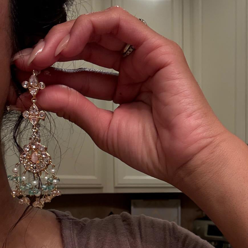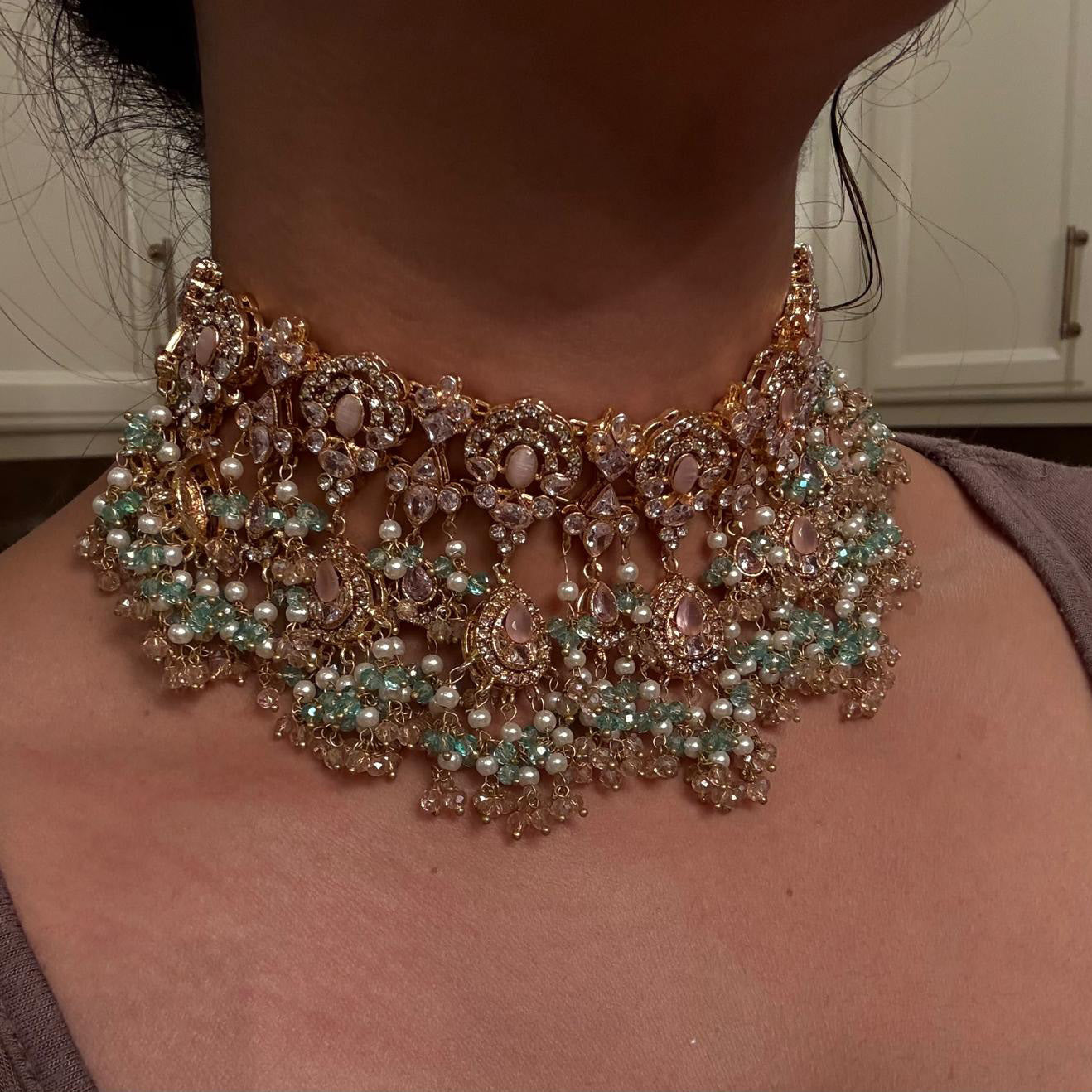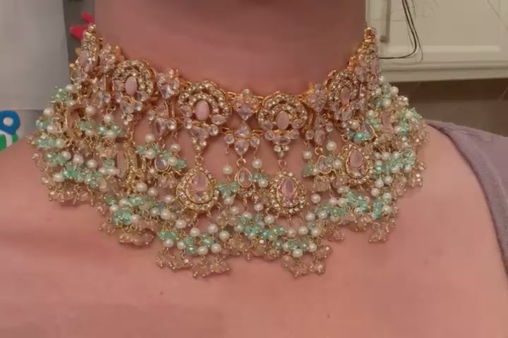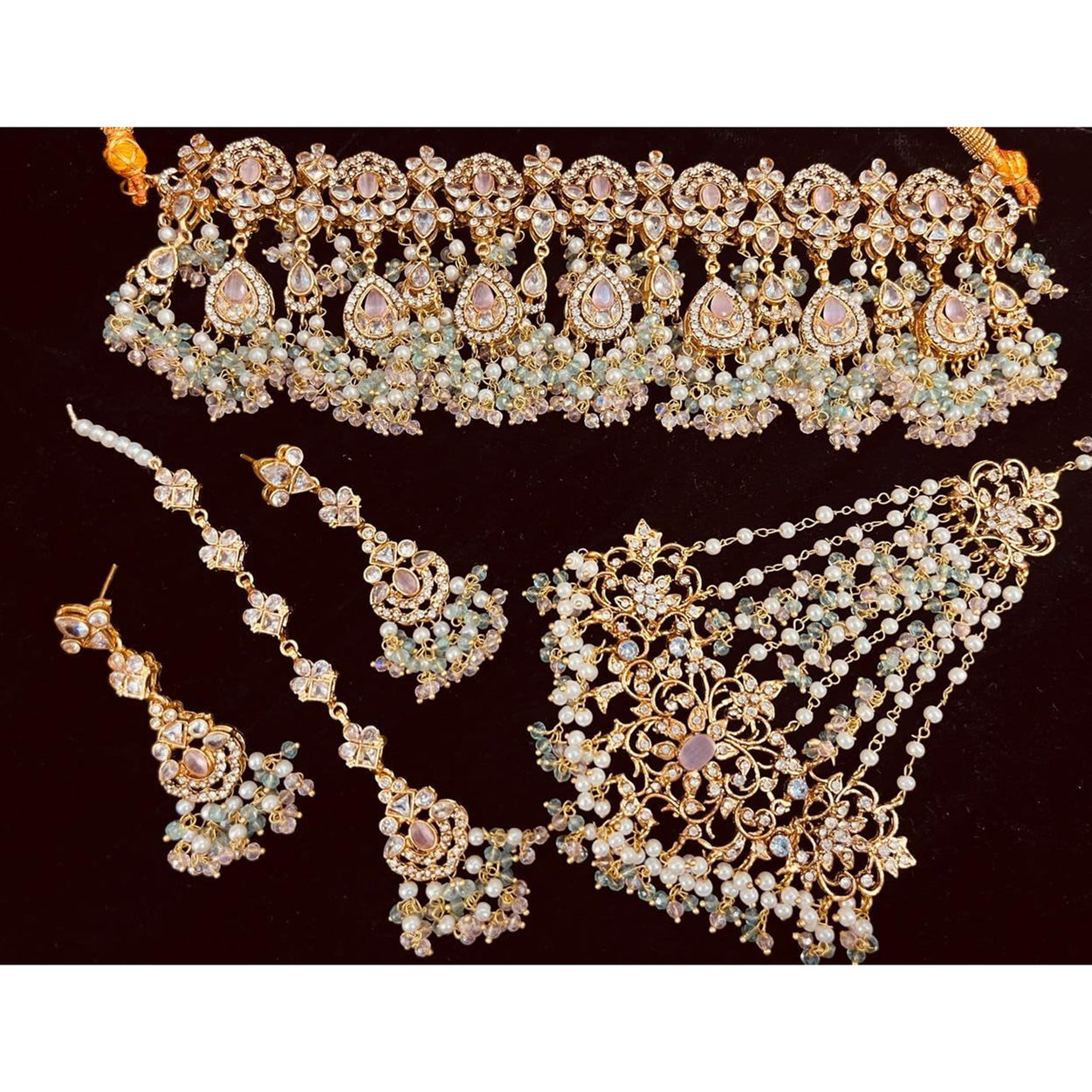 A vision of ethereal splendor, this opulent set is adorned with pink stones, intricate pastel-colored beadwork and cascading clusters of pearls.