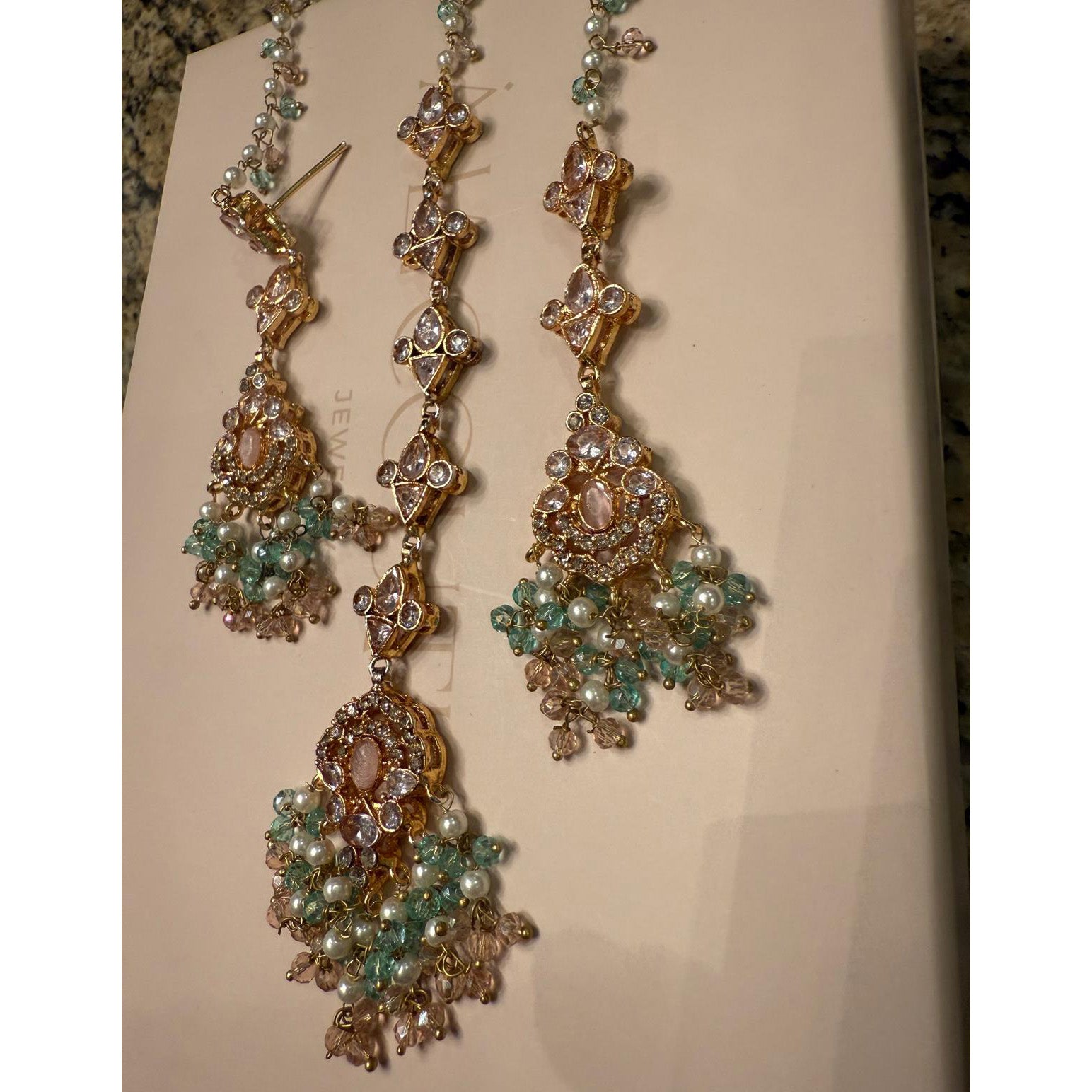The set includes a necklace, a maang teekah, a jhoomar and a pair of matching earrings. Approximate earrings length is 3".