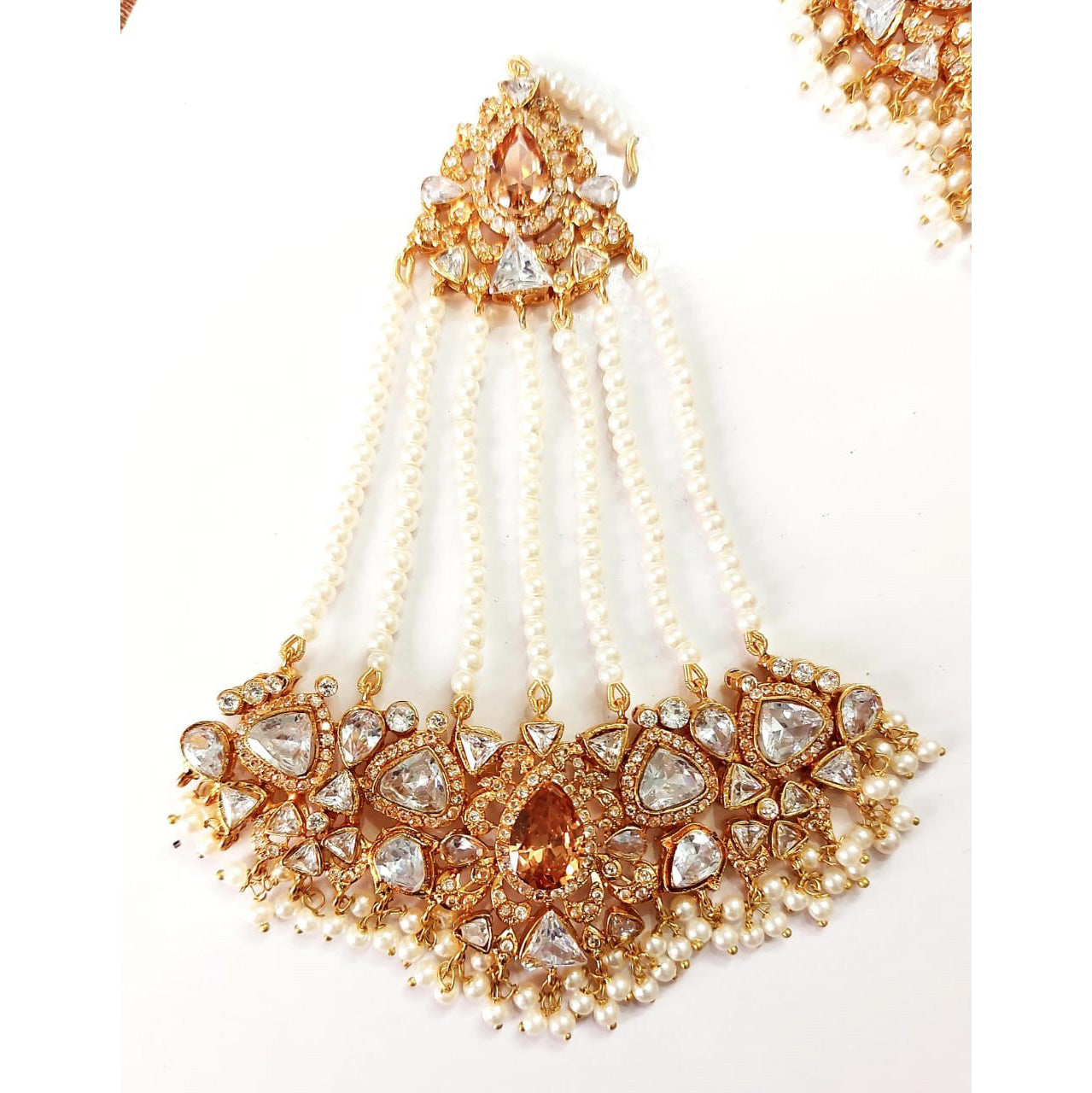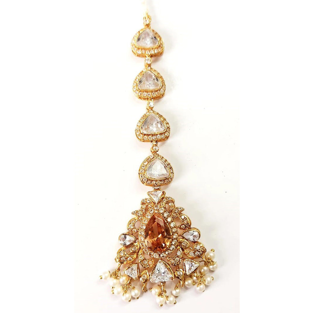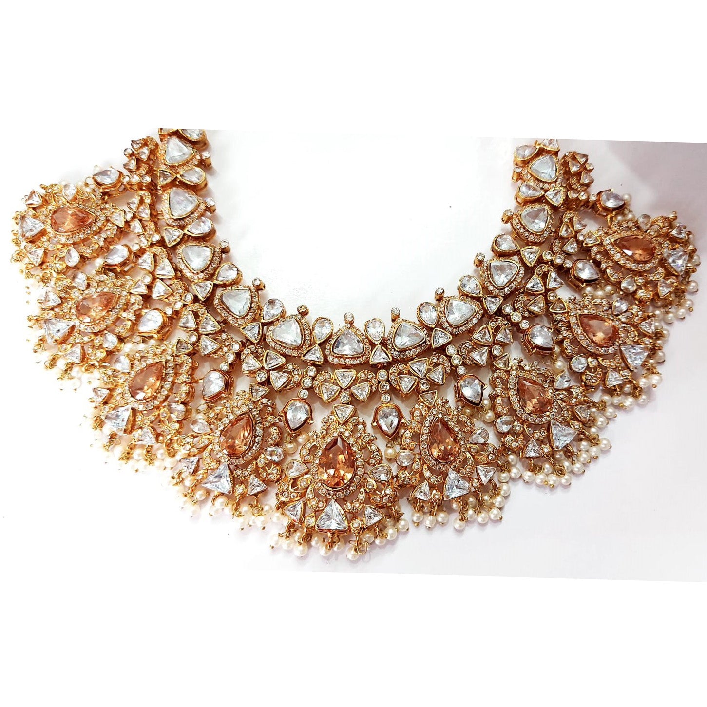 Dripping in regal brilliance, this grand set features champagne stones nestled among shimmering CZ and white stones along with glistening pearls.