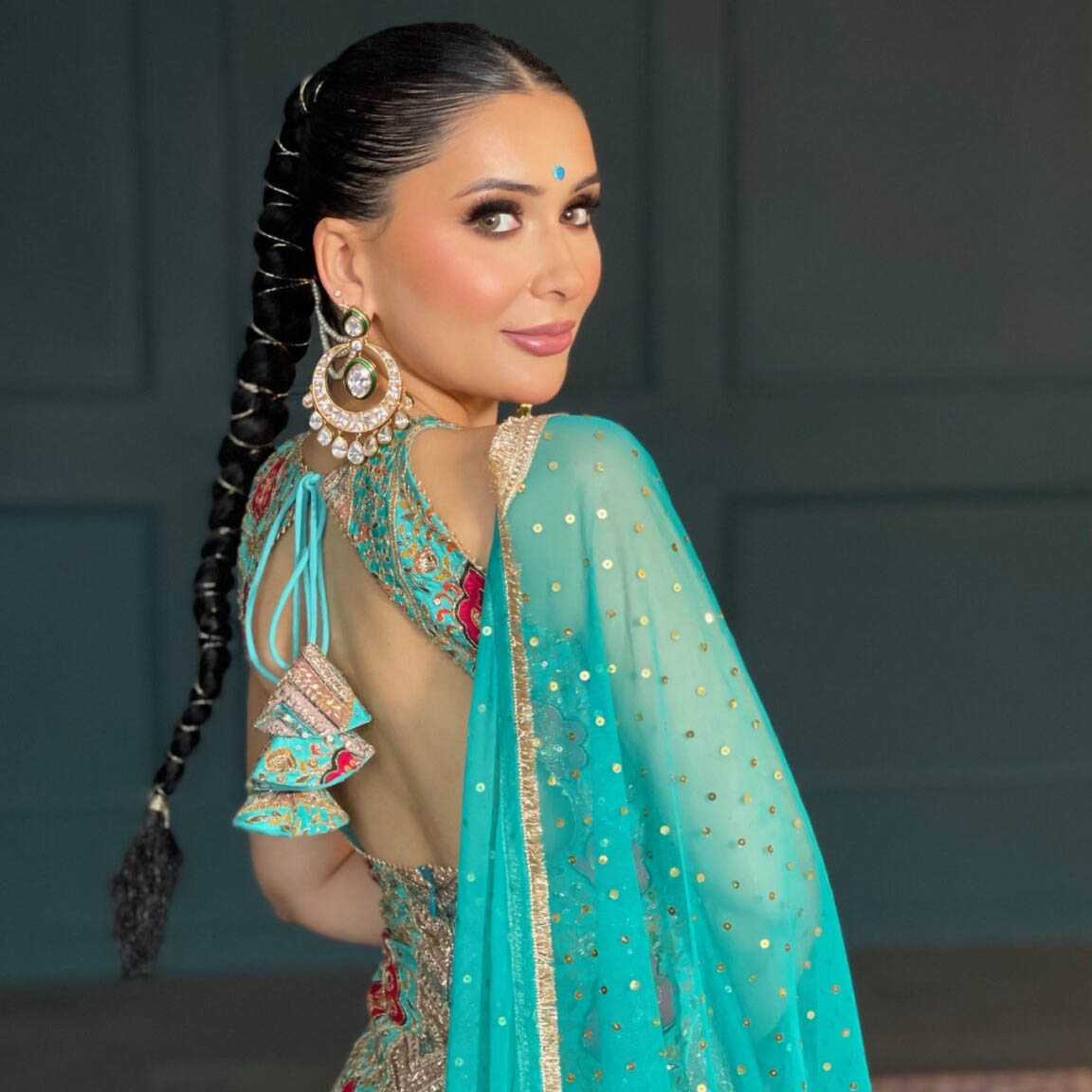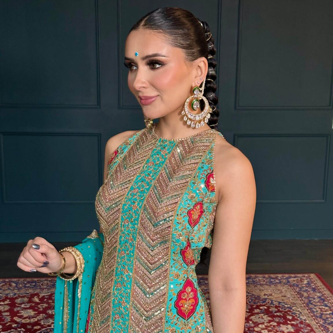 The look includes a statement of timeless glamour - these bold crescent chand-bali earrings exude regal charm with dazzling polki-inspired stones and elegant teardrop drops. Approximate earrings length is 3.8".