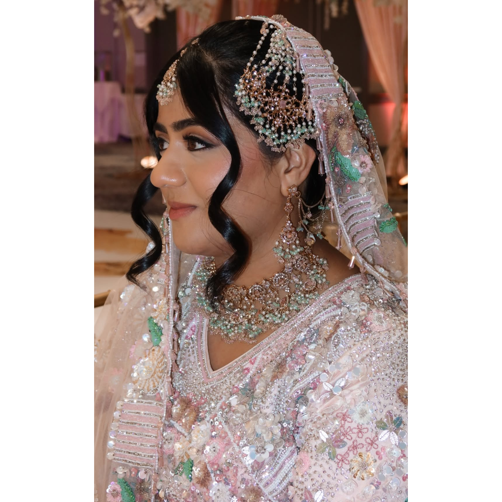The look includes a necklace, a maang teekah, a jhoomar and a pair of matching earrings adorned with pink stones, intricate pastel-colored beadwork and cascading clusters of pearls. Approximate earrings length is 3".