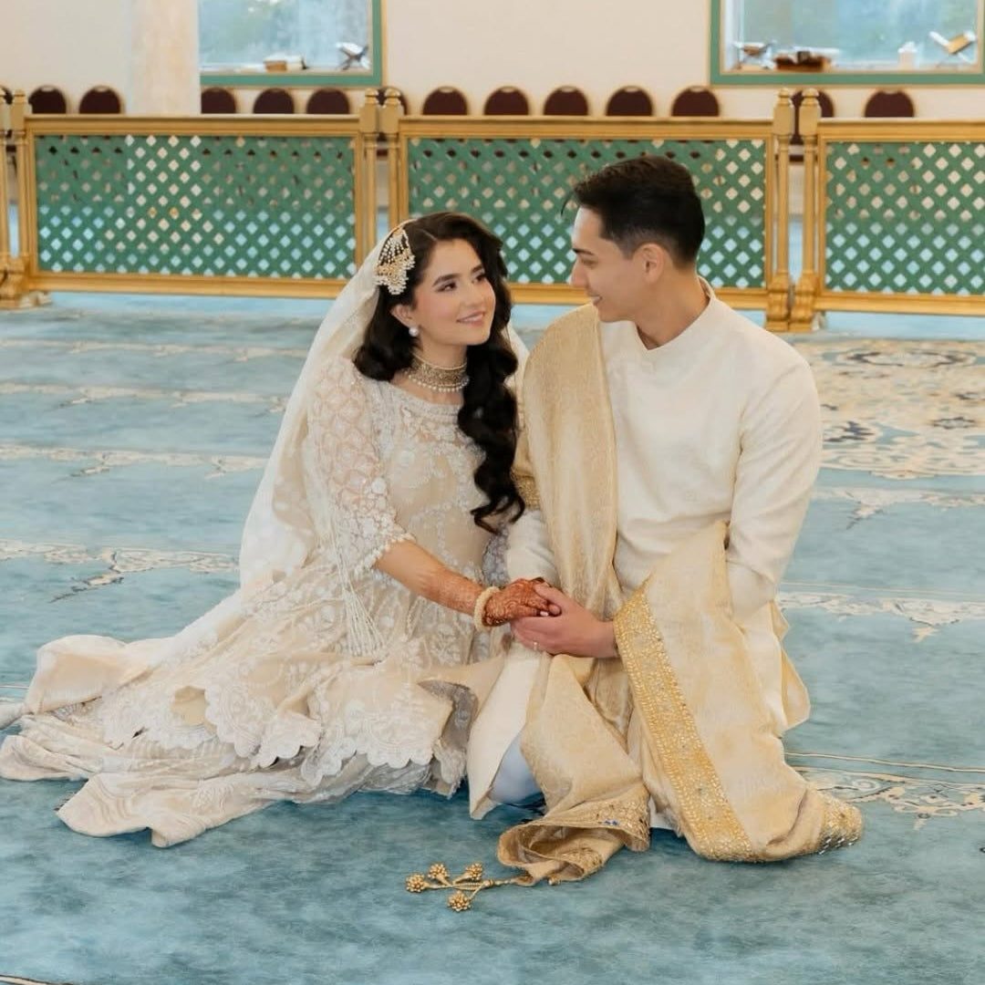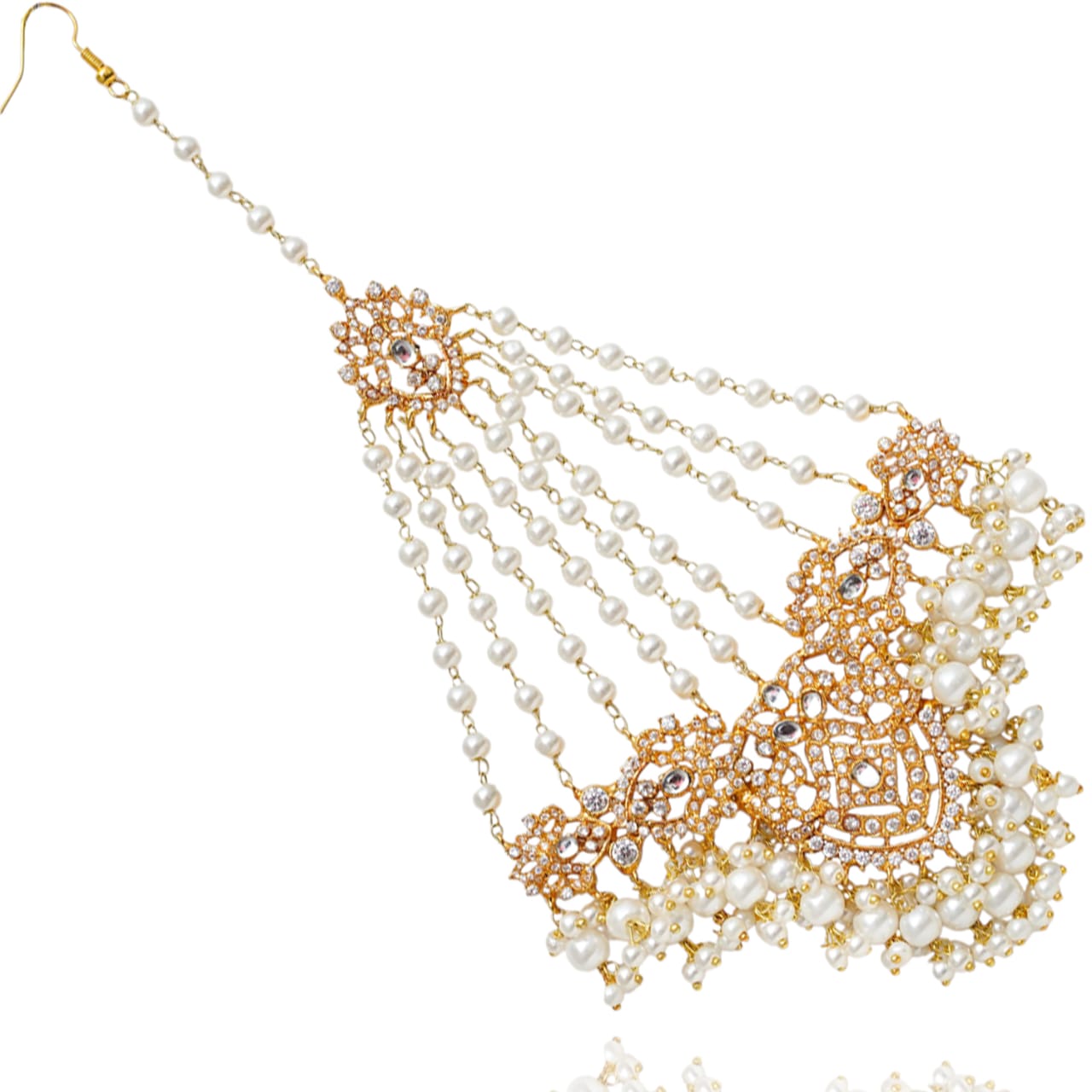 The look includes a choker adorned with mirror work and a jhoomar/passa embellished with strands of pearl moti and CZ stones - radiating sheer splendor.